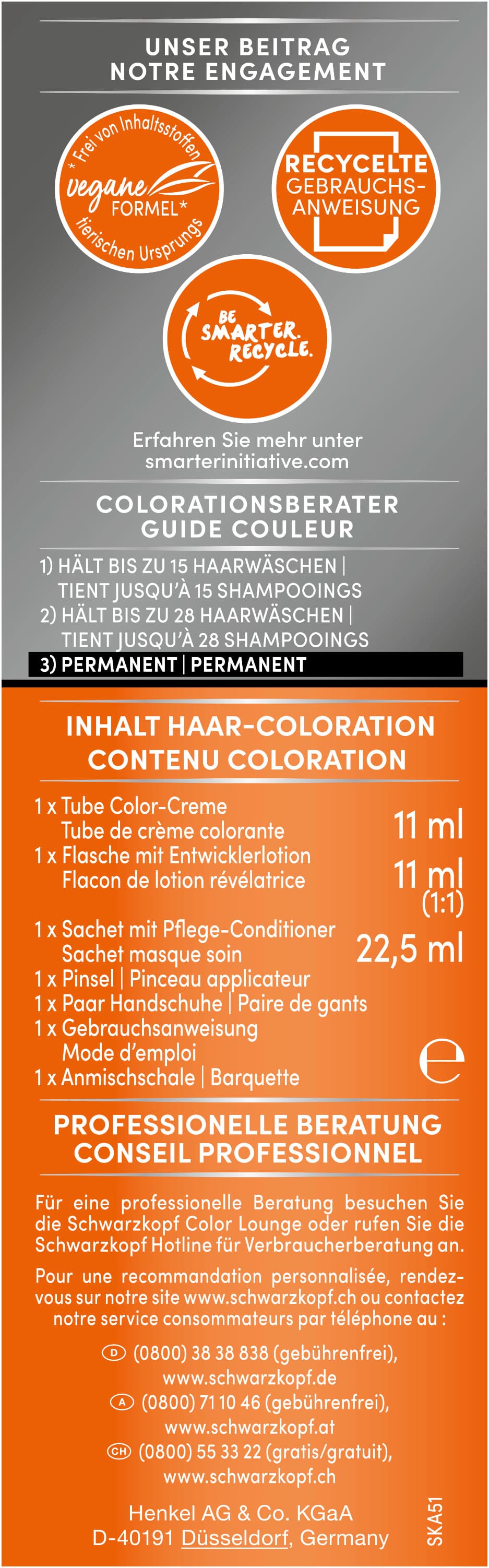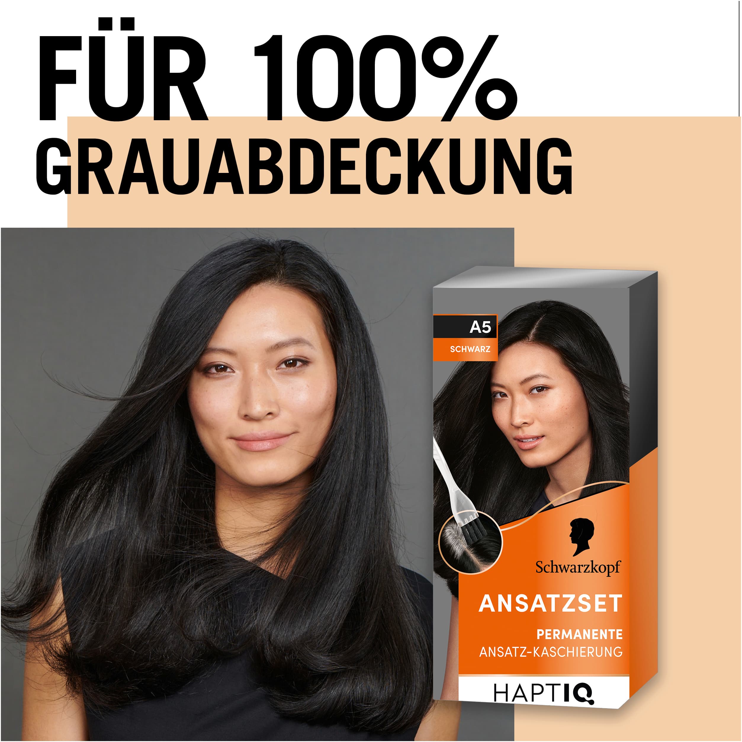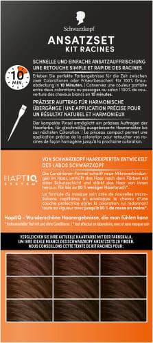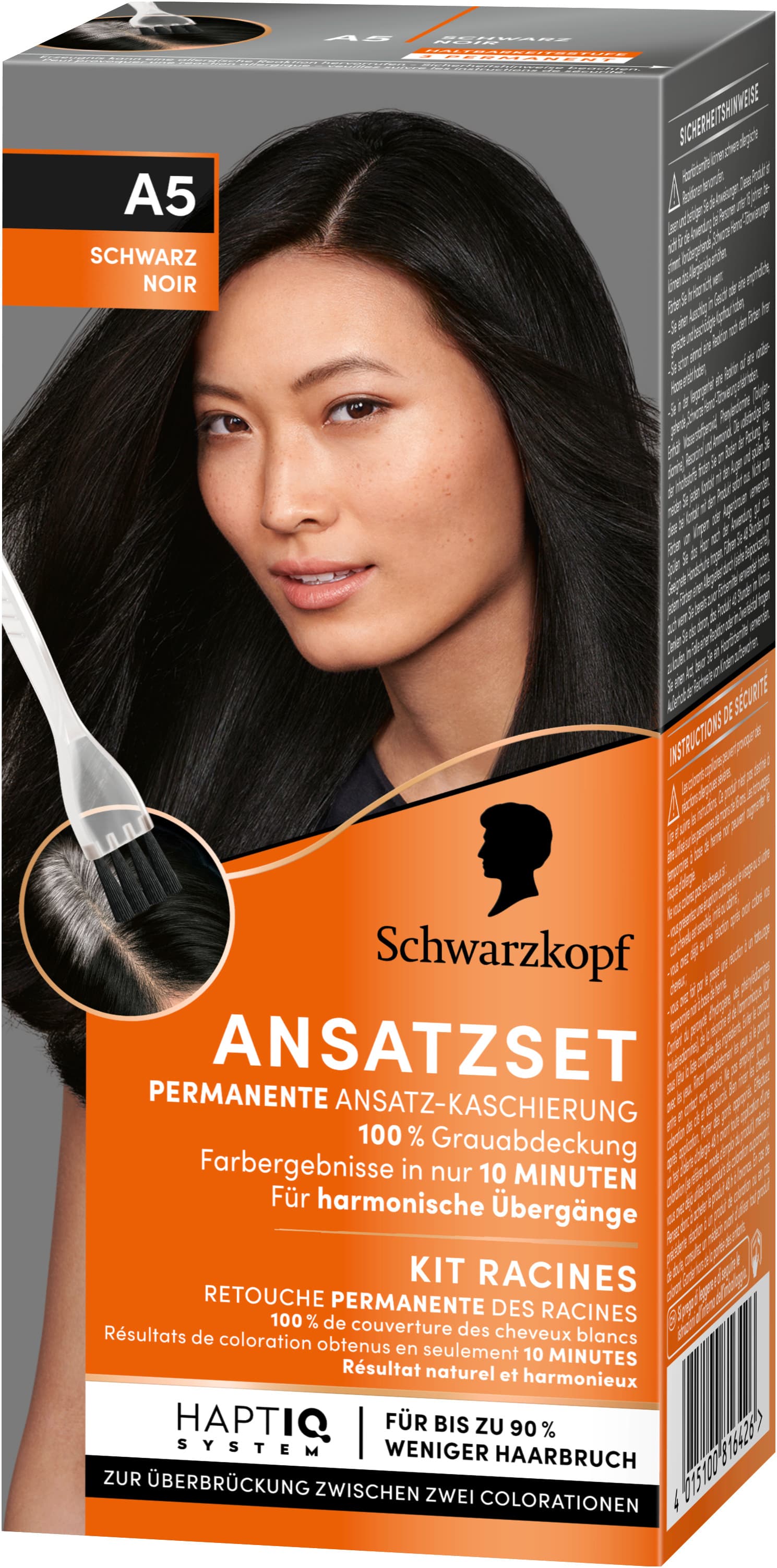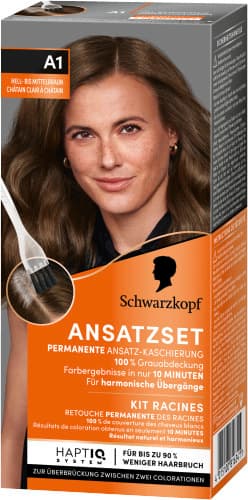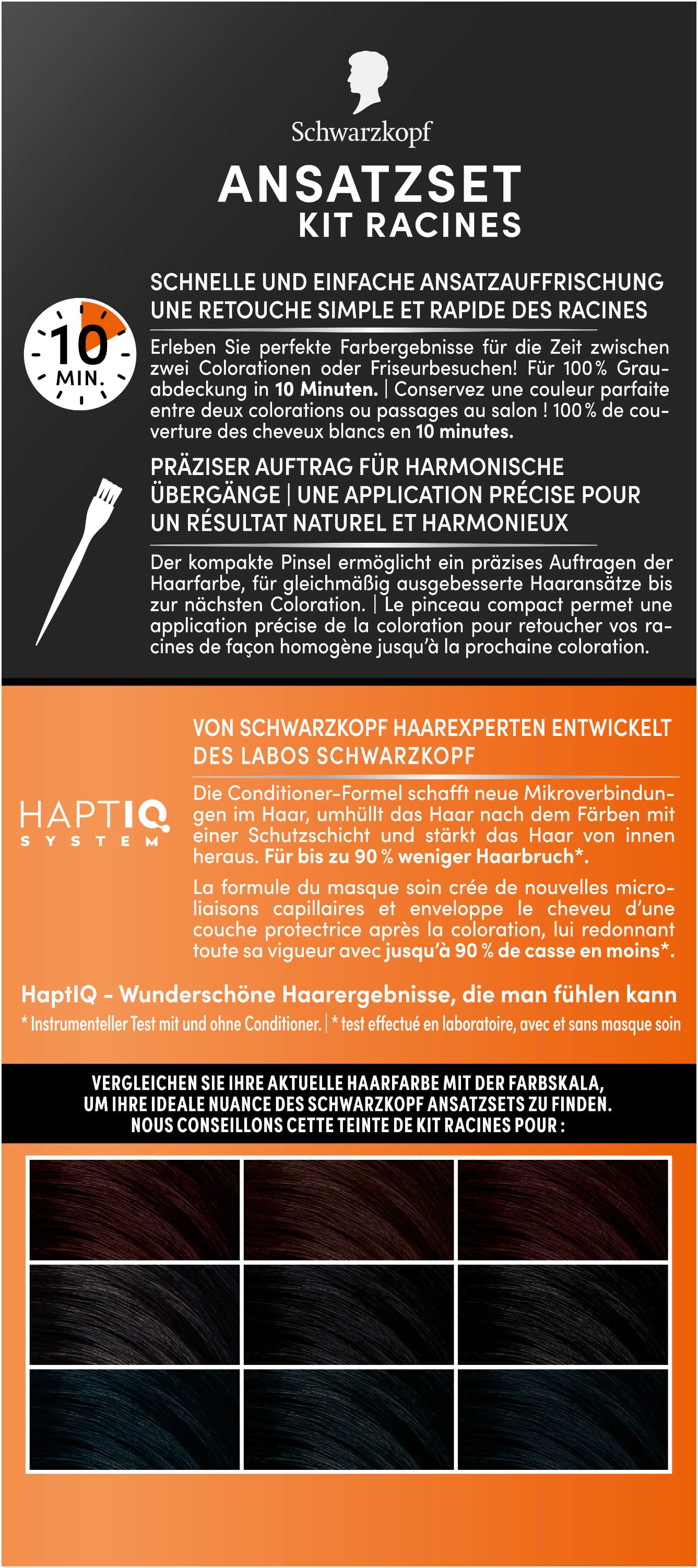 Schwarzkopf Ansatzset – permanente Ansatz-Kaschierung in nur 10 MinutenDas Schwarzkopf Ansatzset ist die einfache Möglichkeit, den Haaransatz zwischen zwei Colorationen oder Friseurbesuchen in nur 10 Minuten zu kaschieren. Das Ansatzset ist für alle permanenten Colorationen geeignet, sogar für Salon-Farben. Der beiliegende, kompakte Haarfärbepinsel ermöglicht eine einfache und präzise Anwendung für eine harmonische Kaschierung der Übergänge sowie 100 % Grauabdeckung.Die Conditioner-Formel mit Bonding HaptIQ System schafft neue Mikroverbindungen im Haar, umhüllt das Haar nach dem Färben mit einer Schutzschicht und stärkt das Haar von innen heraus. Für bis zu 90 % weniger Haarbruch*.Die Produktvorteile im Detail:Ansatz-Kaschierung in 10 MinutenFür harmonische ÜbergängeMit Bonding HaptIQ SystemHochpräziser Pinsel100 % GrauabdeckungAnwendung:1. Die Color-Creme und die Entwickleremulsion in die Anmischschale geben. Gründlich mischen, bis eine gleichmäßige Creme entsteht.2. Die Mischung nun gleichmäßig auf trockenem Haar und an dem sichtbaren Ansatz am Scheitel sowie an den Gesichtskonturen auftragen.3. Nach Ablauf der Einwirkzeit gründlich ausspülen. Bitte die Gebrauchsanweisung für nähere Informationen beachten.* Instrumenteller Test mit und ohne Conditioner