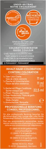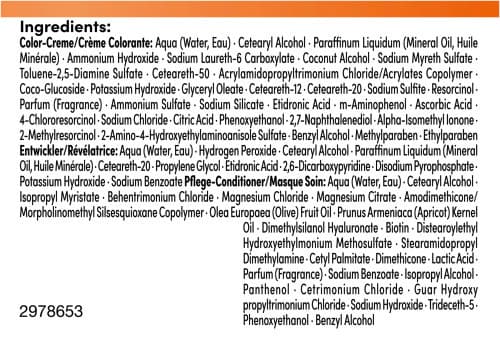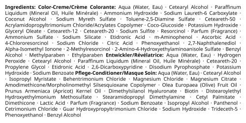 | Inhaltsstoffe | Color-Creme/Crème Colorante: Aqua (Water, Eau), Cetearyl Alcohol, Paraffinum Liquidum (Mineral Oil, Huile Minérale), Ammonium Hydroxide, Sodium Laureth-6 Carboxylate, Coconut Alcohol, Sodium Myreth Sulfate, Toluene-2,5-Diamine Sulfate, Ceteareth-50, Acrylamidopropyltrimonium Chloride/Acrylates Copolymer, Coco-Glucoside, Potassium Hydroxide, Glyceryl Oleate, Ceteareth-12, Ceteareth-20, Sodium Sulfite, Resorcinol, Parfum (Fragrance), Ammonium Sulfate, Sodium Silicate, Etidronic Acid, m-Aminophenol, Ascorbic Acid, 4-Chlororesorcinol, Sodium Chloride, Citric Acid, Phenoxyethanol, 2,7-Naphthalenediol, Alpha-Isomethyl Ionone, 2-Methylresorcinol, 2-Amino-4-Hydroxyethylaminoanisole Sulfate, Benzyl Alcohol, Methylparaben, Ethylparaben|Entwickler/Révélatrice: Aqua (Water, Eau), Hydrogen Peroxide, Cetearyl Alcohol, Paraffinum Liquidum (Mineral Oil, Huile Minérale), Ceteareth-20, Propylene Glycol, Etidronic Acid, 2,6-Dicarboxypyridine, Disodium Pyrophosphate, Potassium Hydroxide, Sodium Benzoate|Pflege-Conditioner/Masque Soin: Aqua (Water, Eau), Cetearyl Alcohol, Isopropyl Myristate, Behentrimonium Chloride, Magnesium Chloride, Magnesium Citrate, Amodimethicone/Morpholinomethyl Silsesquioxane Copolymer, Olea Europaea (Olive) Fruit Oil, Prunus Armeniaca (Apricot) Kernel Oil, Dimethylsilanol Hyaluronate, Biotin, Distearoylethyl Hydroxyethylmonium Methosulfate, Stearamidopropyl Dimethylamine, Cetyl Palmitate, Dimethicone, Lactic Acid, Parfum (Fragrance), Sodium Benzoate, Isopropyl Alcohol, Panthenol, Cetrimonium Chloride, Guar Hydroxypropyltrimonium Chloride, Sodium Hydroxide, Trideceth-5, Phenoxyethanol, Benzyl Alcohol |