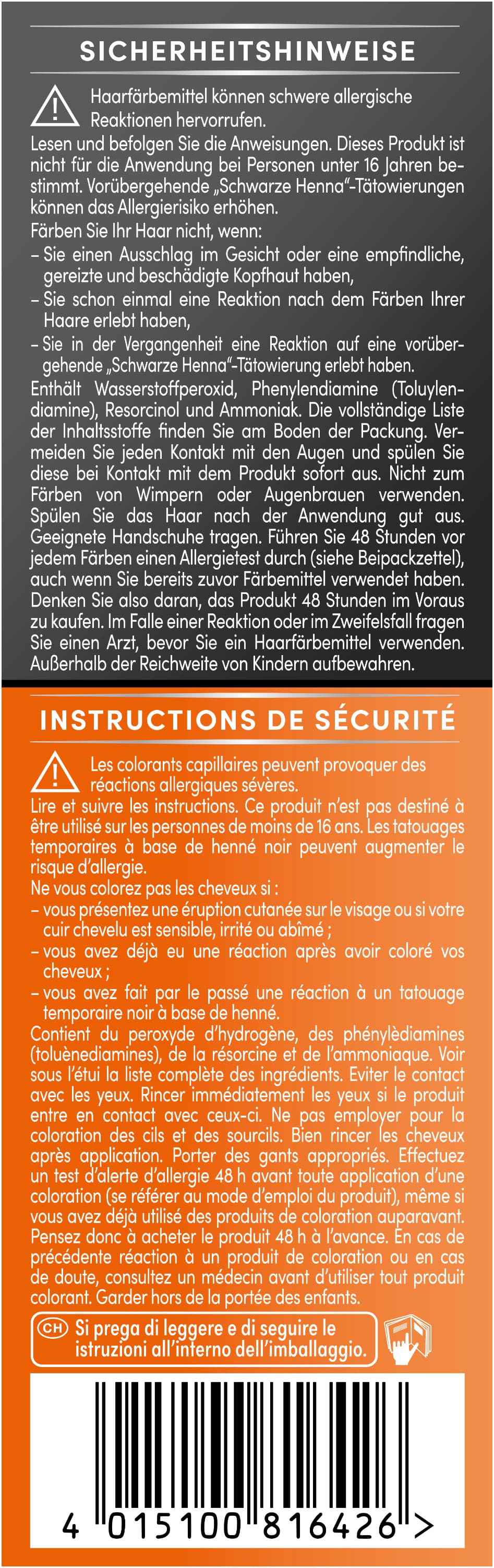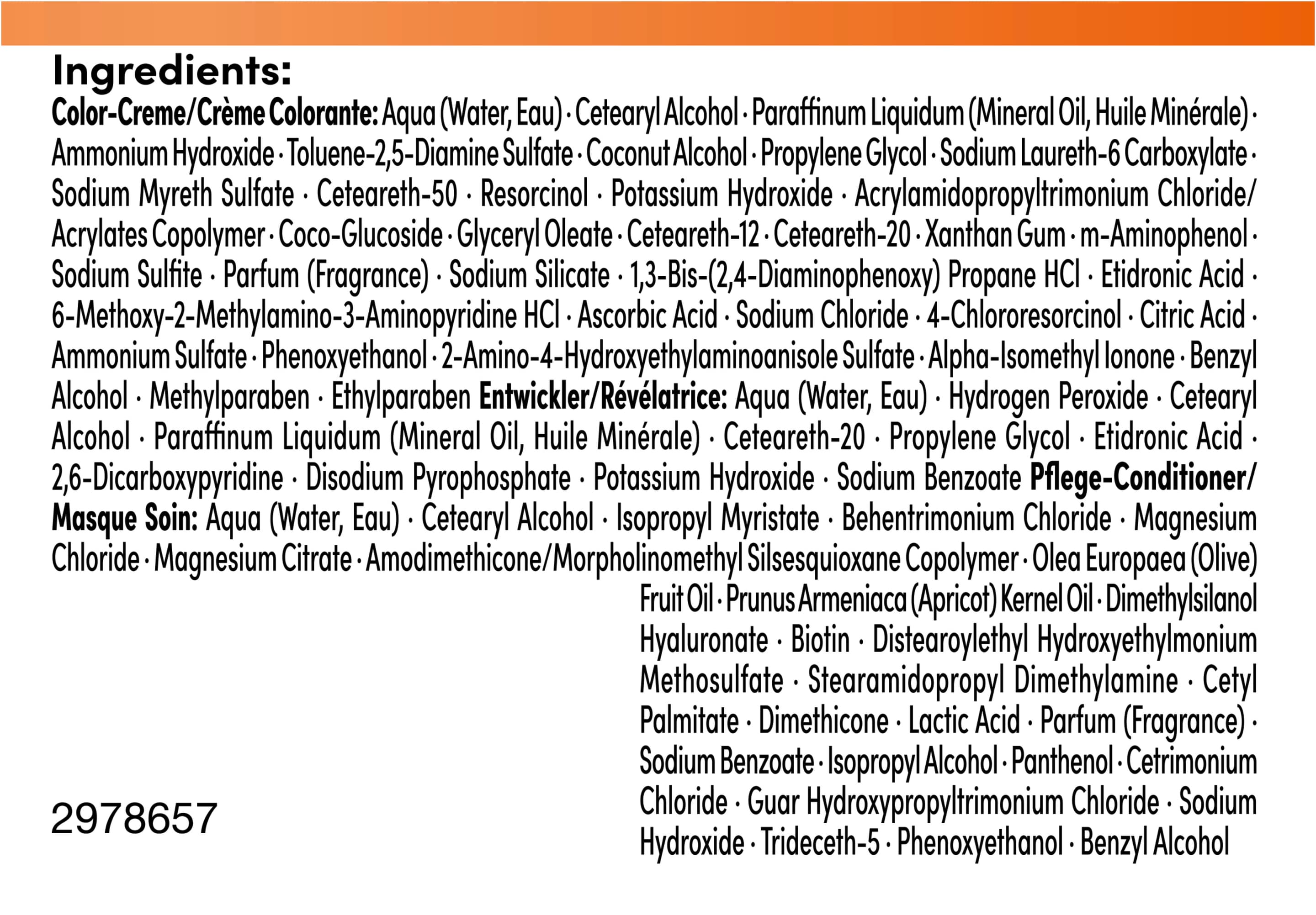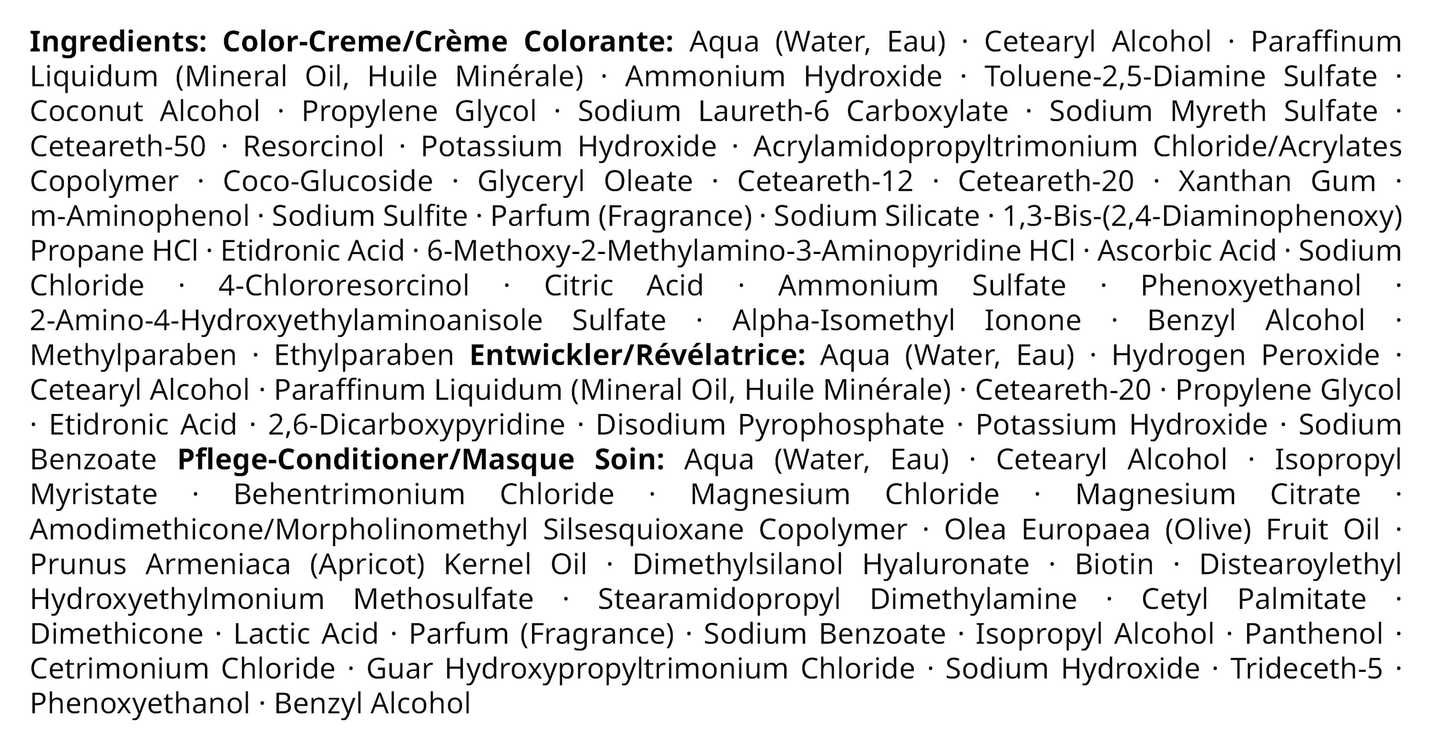 | Inhaltsstoffe | Color-Creme/Crème Colorante: Aqua (Water, Eau), Cetearyl Alcohol, Paraffinum Liquidum (Mineral Oil, Huile Minérale), Ammonium Hydroxide, Toluene-2,5-Diamine Sulfate, Coconut Alcohol, Propylene Glycol, Sodium Laureth-6 Carboxylate, Sodium Myreth Sulfate, Ceteareth-50, Resorcinol, Potassium Hydroxide, Acrylamidopropyltrimonium Chloride/Acrylates Copolymer, Coco-Glucoside, Glyceryl Oleate, Ceteareth-12, Ceteareth-20, Xanthan Gum, m-Aminophenol, Sodium Sulfite, Parfum (Fragrance), Sodium Silicate, 1,3-Bis-(2,4-Diaminophenoxy) Propane HCl, Etidronic Acid, 6-Methoxy-2-Methylamino-3-Aminopyridine HCl, Ascorbic Acid, Sodium Chloride, 4-Chlororesorcinol, Citric Acid, Ammonium Sulfate, Phenoxyethanol, 2-Amino-4-Hydroxyethylaminoanisole Sulfate, Alpha-Isomethyl Ionone, Benzyl Alcohol, Methylparaben, Ethylparaben|Entwickler/Révélatrice: Aqua (Water, Eau), Hydrogen Peroxide, Cetearyl Alcohol, Paraffinum Liquidum (Mineral Oil, Huile Minérale), Ceteareth-20, Propylene Glycol, Etidronic Acid, 2,6-Dic |