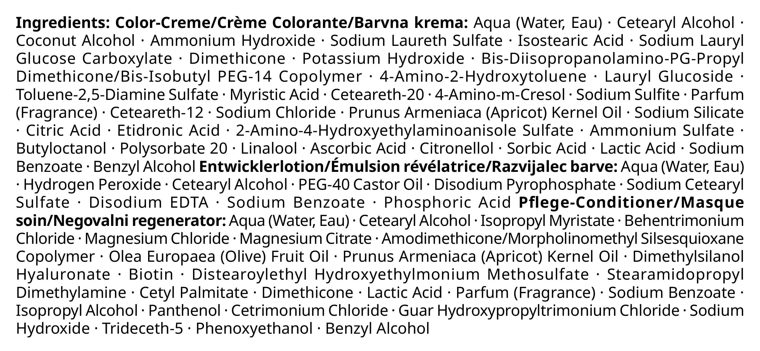 | Inhaltsstoffe | Color-Creme/Crème Colorante/Barvna krema: Aqua (Water, Eau), Cetearyl Alcohol, Coconut Alcohol, Ammonium Hydroxide, Sodium Laureth Sulfate, Isostearic Acid, Sodium Lauryl Glucose Carboxylate, Dimethicone, Potassium Hydroxide, Bis-Diisopropanolamino-PG-Propyl Dimethicone/Bis-Isobutyl PEG-14 Copolymer, 4-Amino-2-Hydroxytoluene, Lauryl Glucoside, Toluene-2,5-Diamine Sulfate, Myristic Acid, Ceteareth-20, 4-Amino-m-Cresol, Sodium Sulfite, Parfum (Fragrance), Ceteareth-12, Sodium Chloride, Prunus Armeniaca (Apricot) Kernel Oil, Sodium Silicate, Citric Acid, Etidronic Acid, 2-Amino-4-Hydroxyethylaminoanisole Sulfate, Ammonium Sulfate, Butyloctanol, Polysorbate 20, Linalool, Ascorbic Acid, Citronellol, Sorbic Acid, Lactic Acid, Sodium Benzoate, Benzyl Alcohol| Entwicklerlotion/Émulsion révélatrice/Razvijalec barve: Aqua (Water, Eau), Hydrogen Peroxide, Cetearyl Alcohol, PEG-40 Castor Oil, Disodium Pyrophosphate, Sodium Cetearyl Sulfate, Disodium EDTA, Sodium Benzoate, Phosphoric Acid| Pflege- |