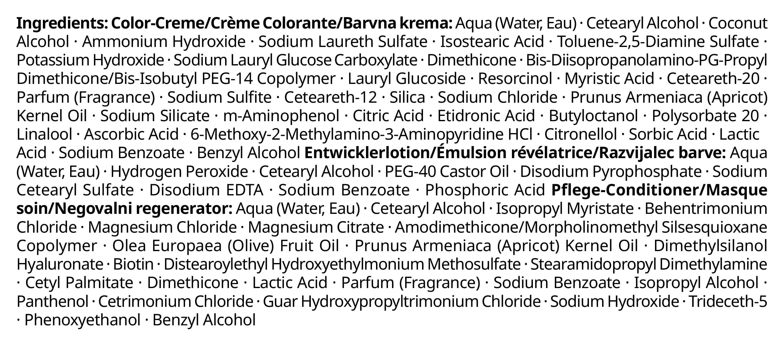 | Inhaltsstoffe | Color-Creme/Crème Colorante/Barvna krema: Aqua (Water, Eau), Cetearyl Alcohol, Coconut Alcohol, Ammonium Hydroxide, Sodium Laureth Sulfate, Isostearic Acid, Toluene-2,5-Diamine Sulfate, Potassium Hydroxide, Sodium Lauryl Glucose Carboxylate, Dimethicone, Bis-Diisopropanolamino-PG-Propyl Dimethicone/Bis-Isobutyl PEG-14 Copolymer, Lauryl Glucoside, Resorcinol, Myristic Acid, Ceteareth-20, Parfum (Fragrance), Sodium Sulfite, Ceteareth-12, Silica, Sodium Chloride, Prunus Armeniaca (Apricot) Kernel Oil, Sodium Silicate, m-Aminophenol, Citric Acid, Etidronic Acid, Butyloctanol, Polysorbate 20, Linalool, Ascorbic Acid, 6-Methoxy-2-Methylamino-3-Aminopyridine HCl, Citronellol, Sorbic Acid, Lactic Acid, Sodium Benzoate, Benzyl Alcohol|Entwicklerlotion/Émulsion révélatrice/Razvijalec barve: Aqua (Water, Eau), Hydrogen Peroxide, Cetearyl Alcohol, PEG-40 Castor Oil, Disodium Pyrophosphate, Sodium Cetearyl Sulfate, Disodium EDTA, Sodium Benzoate, Phosphoric Acid|Pflege-Conditioner/Masque soin/Nego |