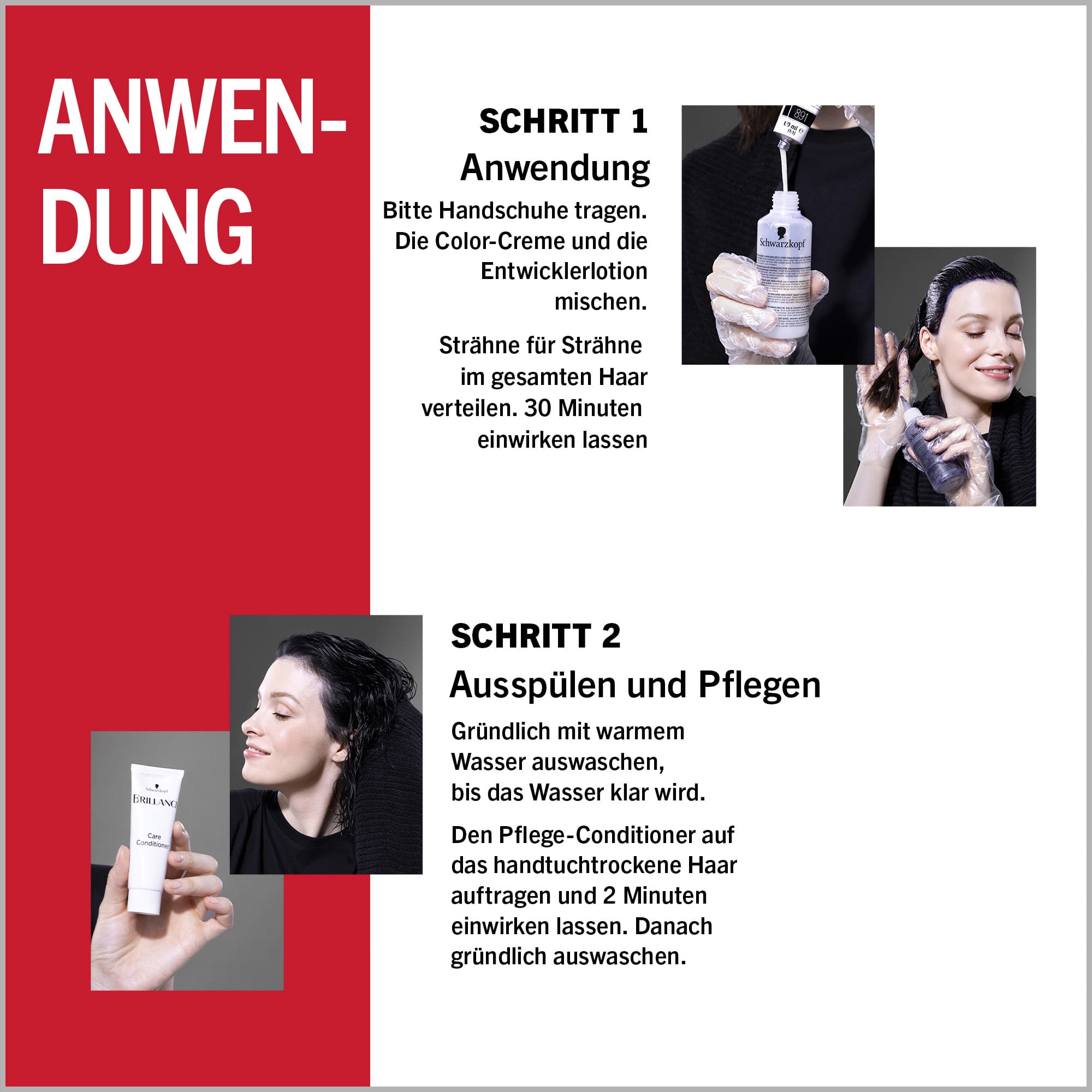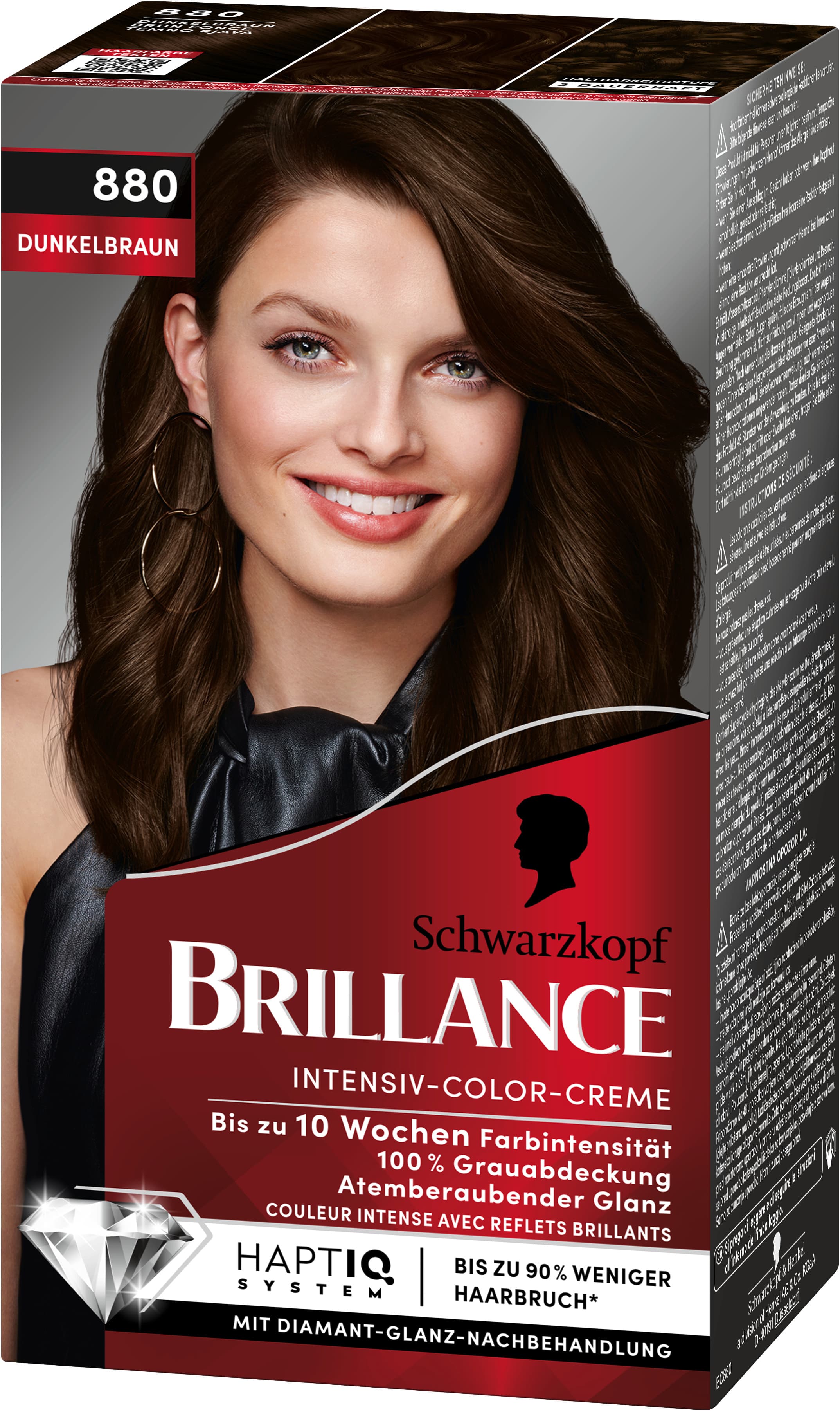BRILLANCE Intensiv-Color-Creme – Ein Haarfarben-Statement mit Diamant-Glanz.Dank der SCHWARZKOPF Farbexpertise bietet BRILLANCE einzigartig intensive Haarfarben in professioneller Qualität für zu Hause. Die hochleistungsfähige Formel sorgt für langanhaltende Farbintensität bis zu 10 Wochen und für bis zu 100% Grauabdeckung. Das Haar wird mit der Diamant-Glanz-Nachbehandlung gepflegt - Für atemberaubenden Glanz.Reichhaltige Pflege mit HaptIQ System:Die besondere Conditioner-Formel mit HaptIQ System pflegt Ihr Haar wie folgt:1. Neue Mikroverbindungen werden im Haar gebildet.2. Die Haare werden nach dem Colorieren mit einer Schutzschicht umhüllt.3. Die Haarfasern werden von innen gestarkt – für bis zu 90 % weniger Haarbruch* und für langanhaltende Farbergebnisse.HaptIQ - Wunderschöne Haarergebnisse, die Sie fühlen können.Die Produktvorteile im Detail:Bis zu 10 Wochen FarbintensitätIntensive Leuchtkraft&GlanzPerfekte GrauabdeckungPflege-Condtioner mit HaptIQ-SystemBis zu 90% weniger Haarbruch*Anwendung: Die fertige Colorationsmischung Strähne für Strähne auf dem gesamten Haar verteilen. Die Mischung entsprechend der Angabe in der Gebrauchsanweisung einwirken lassen. Bei längerem oder dickerem Haar bitte für eine erste Anwendung 2 Packungen BRILLANCE verwenden.Darf nicht in die Hände von Kindern gelangen. Entwickler von Hitze fernhalten. Keine nicht gebrauchte Mischung aufbewahren.* Instrumenteller Test mit und ohne Conditioner.