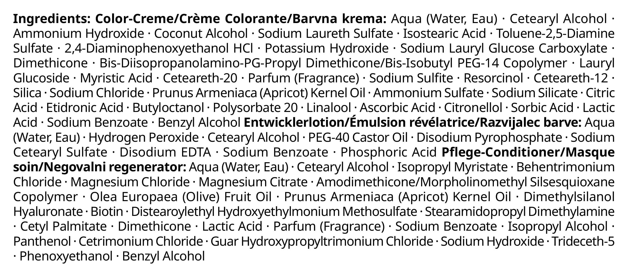 | Inhaltsstoffe | Color-Creme/Crème Colorante/Barvna krema: Aqua (Water, Eau), Cetearyl Alcohol, Ammonium Hydroxide, Coconut Alcohol, Sodium Laureth Sulfate, Isostearic Acid, Toluene-2,5-Diamine Sulfate, 2,4-Diaminophenoxyethanol HCl, Potassium Hydroxide, Sodium Lauryl Glucose Carboxylate, Dimethicone, Bis-Diisopropanolamino-PG-Propyl Dimethicone/Bis-Isobutyl PEG-14 Copolymer, Lauryl Glucoside, Myristic Acid, Ceteareth-20, Parfum (Fragrance), Sodium Sulfite, Resorcinol, Ceteareth-12, Silica, Sodium Chloride, Prunus Armeniaca (Apricot) Kernel Oil, Ammonium Sulfate, Sodium Silicate, Citric Acid, Etidronic Acid, Butyloctanol, Polysorbate 20, Linalool, Ascorbic Acid, Citronellol, Sorbic Acid, Lactic Acid, Sodium Benzoate, Benzyl Alcohol|Entwicklerlotion/Émulsion révélatrice/Razvijalec barve: Aqua (Water, Eau), Hydrogen Peroxide, Cetearyl Alcohol, PEG-40 Castor Oil, Disodium Pyrophosphate, Sodium Cetearyl Sulfate, Disodium EDTA, Sodium Benzoate, Phosphoric Acid| Pflege-Conditioner/Masque soin/Negovalni rege |