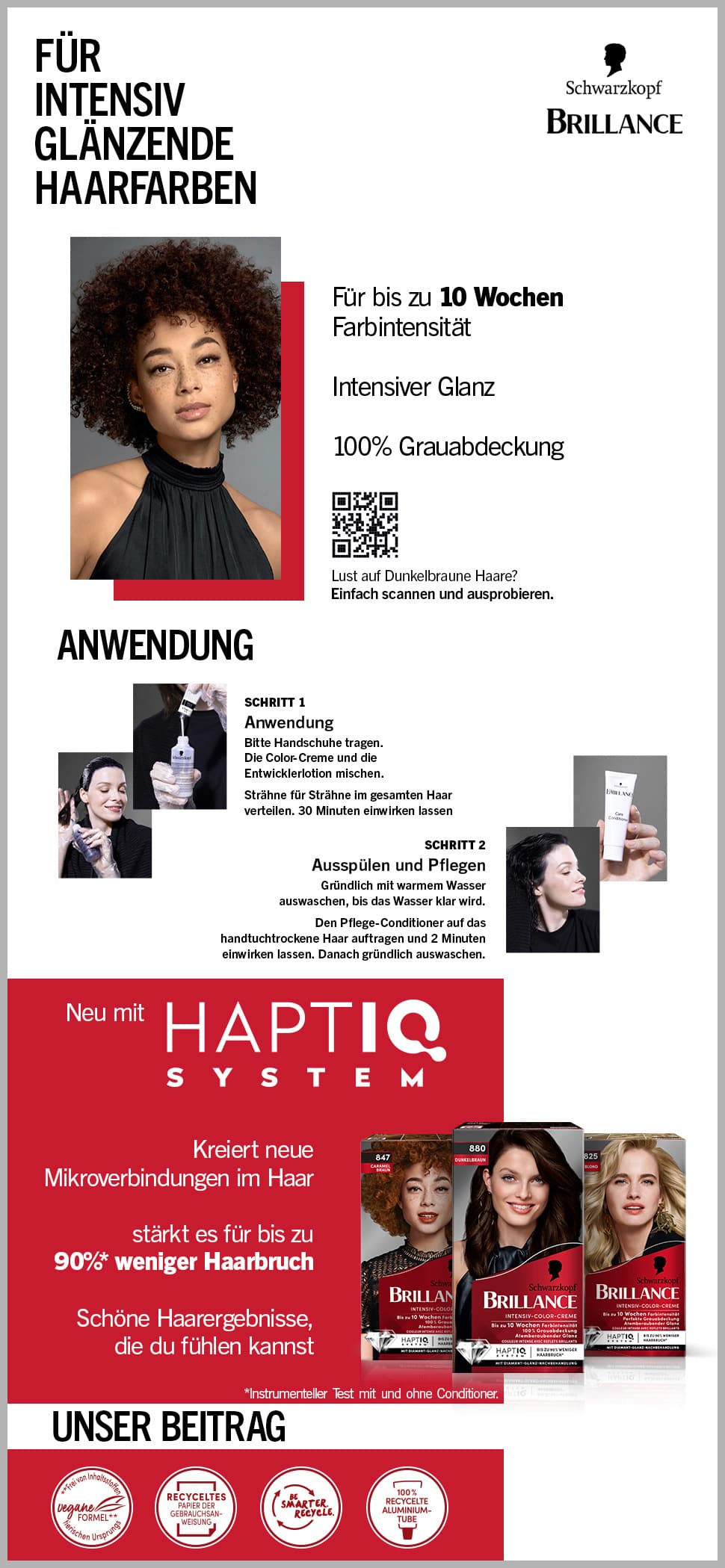 BRILLANCE Intensiv-Color-Creme – Ein Haarfarben-Statement mit Diamant-Glanz.Dank der SCHWARZKOPF Farbexpertise bietet BRILLANCE einzigartig intensive Haarfarben in professioneller Qualität für zu Hause. Die hochleistungsfähige Formel sorgt für langanhaltende Farbintensität bis zu 10 Wochen und für bis zu 100% Grauabdeckung. Das Haar wird mit der Diamant-Glanz-Nachbehandlung gepflegt - Für atemberaubenden Glanz.Reichhaltige Pflege mit HaptIQ System:Die besondere Conditioner-Formel mit HaptIQ System pflegt Ihr Haar wie folgt:1. Neue Mikroverbindungen werden im Haar gebildet.2. Die Haare werden nach dem Colorieren mit einer Schutzschicht umhüllt.3. Die Haarfasern werden von innen gestarkt – für bis zu 90 % weniger Haarbruch* und für langanhaltende Farbergebnisse.HaptIQ - Wunderschöne Haarergebnisse, die Sie fühlen können.Die Produktvorteile im Detail:Bis zu 10 Wochen FarbintensitätIntensive Leuchtkraft&GlanzPerfekte GrauabdeckungPflege-Condtioner mit HaptIQ-SystemBis zu 90% weniger Haarbruch*Anwendung: Die fertige Colorationsmischung Strähne für Strähne auf dem gesamten Haar verteilen. Die Mischung entsprechend der Angabe in der Gebrauchsanweisung einwirken lassen. Bei längerem oder dickerem Haar bitte für eine erste Anwendung 2 Packungen BRILLANCE verwenden.Darf nicht in die Hände von Kindern gelangen. Entwickler von Hitze fernhalten. Keine nicht gebrauchte Mischung aufbewahren.* Instrumenteller Test mit und ohne Conditioner.
