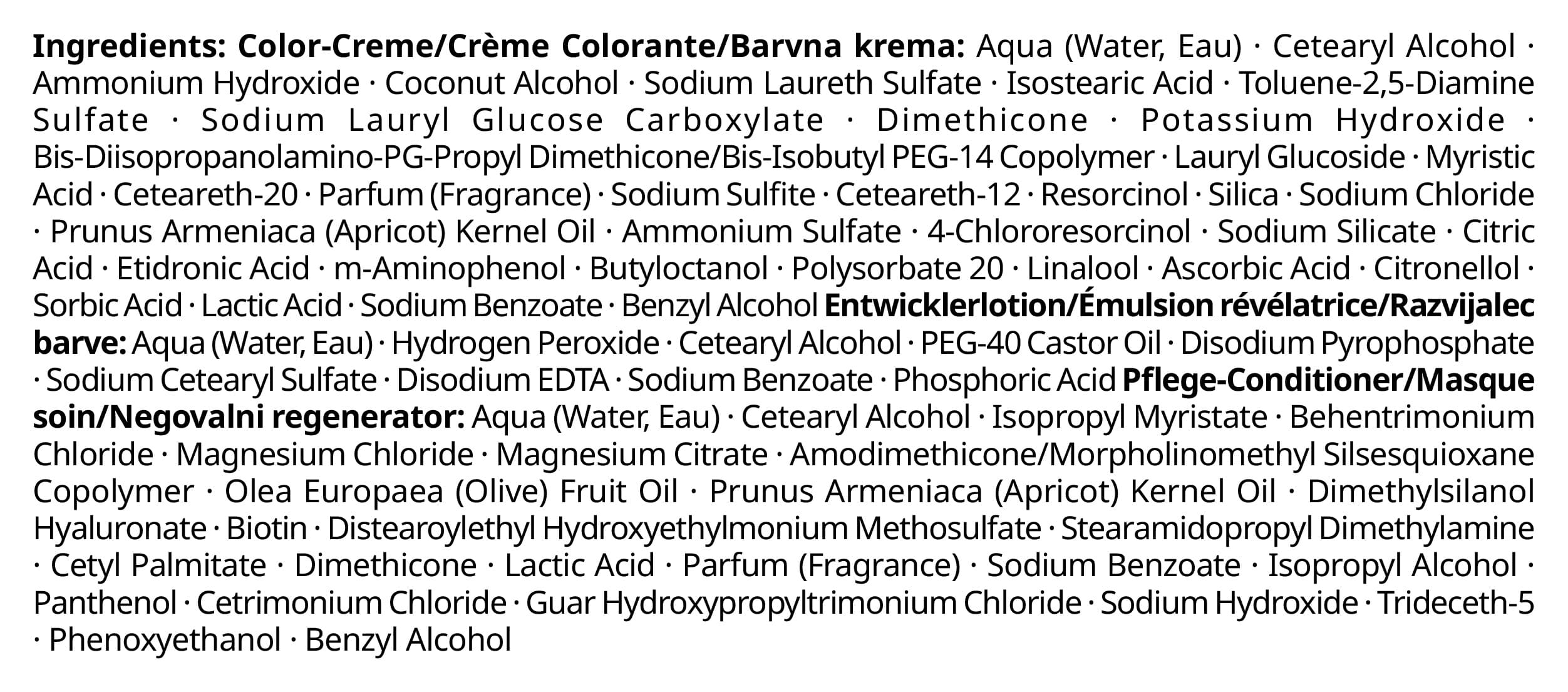 | Inhaltsstoffe | Color-Creme/Crème Colorante/Barvna krema: Aqua (Water, Eau), Cetearyl Alcohol, Ammonium Hydroxide, Coconut Alcohol, Sodium Laureth Sulfate, Isostearic Acid, Toluene-2,5-Diamine Sulfate, Sodium Lauryl Glucose Carboxylate, Dimethicone, Potassium Hydroxide, Bis-Diisopropanolamino-PG-Propyl Dimethicone/Bis-Isobutyl PEG-14 Copolymer, Lauryl Glucoside, Myristic Acid, Ceteareth-20, Parfum (Fragrance), Sodium Sulfite, Ceteareth-12, Resorcinol, Silica, Sodium Chloride, Prunus Armeniaca (Apricot) Kernel Oil, Ammonium Sulfate, 4-Chlororesorcinol, Sodium Silicate, Citric Acid, Etidronic Acid, m-Aminophenol, Butyloctanol, Polysorbate 20, Linalool, Ascorbic Acid, Citronellol, Sorbic Acid, Lactic Acid, Sodium Benzoate, Benzyl Alcohol|Entwicklerlotion/Émulsion révélatrice/Razvijalec barve: Aqua (Water, Eau),Hydrogen Peroxide, Cetearyl Alcohol, PEG-40 Castor Oil, Disodium Pyrophosphate, Sodium Cetearyl Sulfate, Disodium EDTA, Sodium Benzoate, Phosphoric Acid|Pflege-Conditioner/Masque soin/Negovalni re |
