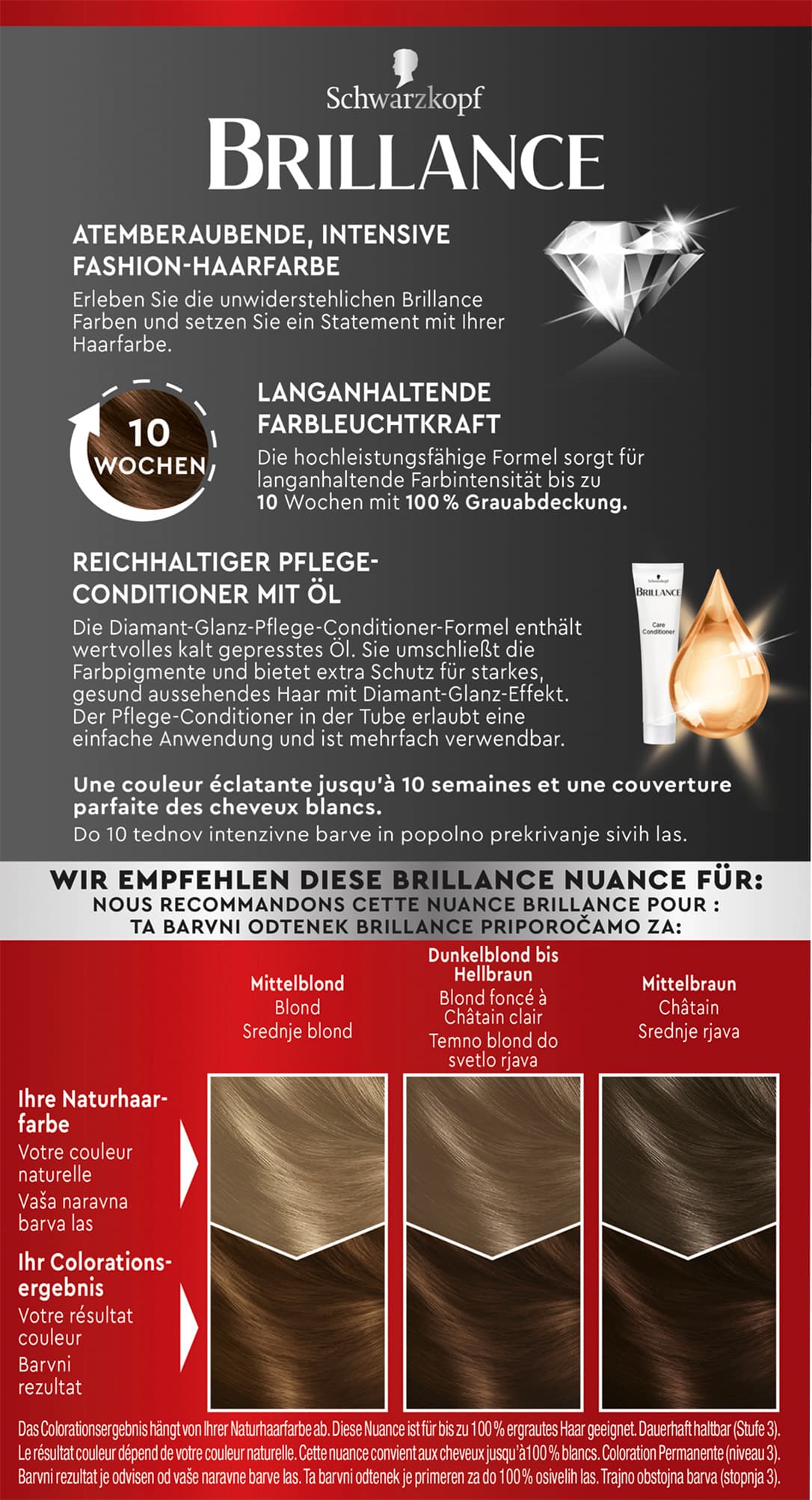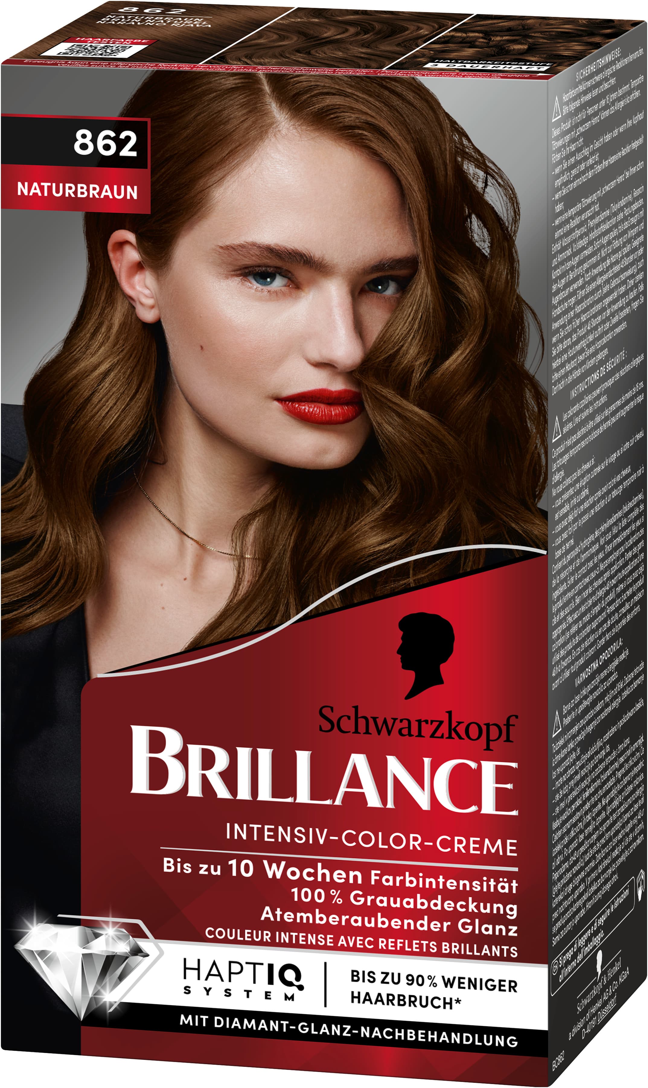 BRILLANCE Intensiv-Color-Creme – Ein Haarfarben-Statement mit Diamant-Glanz.Dank der SCHWARZKOPF Farbexpertise bietet BRILLANCE einzigartig intensive Haarfarben in professioneller Qualität für zu Hause. Die hochleistungsfähige Formel sorgt für langanhaltende Farbintensität bis zu 10 Wochen und für bis zu 100% Grauabdeckung. Das Haar wird mit der Diamant-Glanz-Nachbehandlung gepflegt - Für atemberaubenden Glanz.Reichhaltige Pflege mit HaptIQ System:Die besondere Conditioner-Formel mit HaptIQ System pflegt Ihr Haar wie folgt:1. Neue Mikroverbindungen werden im Haar gebildet.2. Die Haare werden nach dem Colorieren mit einer Schutzschicht umhüllt.3. Die Haarfasern werden von innen gestarkt – für bis zu 90 % weniger Haarbruch* und für langanhaltende Farbergebnisse.HaptIQ - Wunderschöne Haarergebnisse, die Sie fühlen können.Die Produktvorteile im Detail:Bis zu 10 Wochen FarbintensitätIntensive Leuchtkraft&GlanzPerfekte GrauabdeckungPflege-Condtioner mit HaptIQ-SystemBis zu 90% weniger Haarbruch*Anwendung: Die fertige Colorationsmischung Strähne für Strähne auf dem gesamten Haar verteilen. Die Mischung entsprechend der Angabe in der Gebrauchsanweisung einwirken lassen. Bei längerem oder dickerem Haar bitte für eine erste Anwendung 2 Packungen BRILLANCE verwenden.Darf nicht in die Hände von Kindern gelangen. Entwickler von Hitze fernhalten. Keine nicht gebrauchte Mischung aufbewahren.* Instrumenteller Test mit und ohne Conditioner.