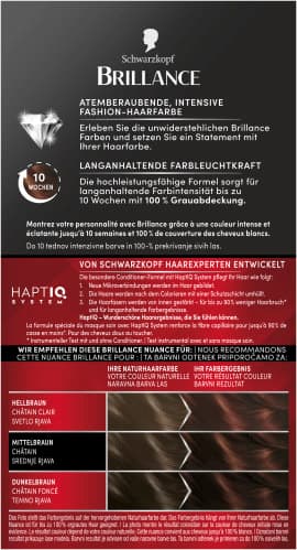 BRILLANCE Intensiv-Color-Creme – Ein Haarfarben-Statement mit Diamant-Glanz.Dank der SCHWARZKOPF Farbexpertise bietet BRILLANCE einzigartig intensive Haarfarben in professioneller Qualität für zu Hause. Die hochleistungsfähige Formel sorgt für langanhaltende Farbintensität bis zu 10 Wochen und für bis zu 100% Grauabdeckung. Das Haar wird mit der Diamant-Glanz-Nachbehandlung gepflegt - Für atemberaubenden Glanz.Reichhaltige Pflege mit HaptIQ System:Die besondere Conditioner-Formel mit HaptIQ System pflegt Ihr Haar wie folgt:1. Neue Mikroverbindungen werden im Haar gebildet.2. Die Haare werden nach dem Colorieren mit einer Schutzschicht umhüllt.3. Die Haarfasern werden von innen gestarkt – für bis zu 90 % weniger Haarbruch* und für langanhaltende Farbergebnisse.HaptIQ - Wunderschöne Haarergebnisse, die Sie fühlen können.Die Produktvorteile im Detail:Bis zu 10 Wochen FarbintensitätIntensive Leuchtkraft&GlanzPerfekte GrauabdeckungPflege-Condtioner mit HaptIQ-SystemBis zu 90% weniger Haarbruch*Anwendung: Die fertige Colorationsmischung Strähne für Strähne auf dem gesamten Haar verteilen. Die Mischung entsprechend der Angabe in der Gebrauchsanweisung einwirken lassen. Bei längerem oder dickerem Haar bitte für eine erste Anwendung 2 Packungen BRILLANCE verwenden.Darf nicht in die Hände von Kindern gelangen. Entwickler von Hitze fernhalten. Keine nicht gebrauchte Mischung aufbewahren.* Instrumenteller Test mit und ohne Conditioner.