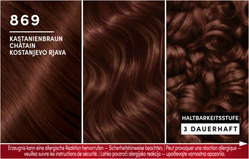 Haarfärbemittel können schwere allergische Reaktionen hervorrufen. Bitte folgende Hinweise lesen und beachten: Dieses Produkt ist nicht für Personen unter 16 Jahren bestimmt. Temporäre Tätowierungen mit „schwarzem Henna“ können das Allergierisiko erhöhen. Färben Sie Ihr Haar nicht, – wenn Sie einen Ausschlag im Gesicht haben oder wenn Ihre Kopfhaut empfindlich, gereizt oder verletzt ist; – wenn Sie schon einmal nach dem Färben Ihrer Haare eine Reaktion festgestellt haben; – wenn eine temporäre Tätowierung mit „schwarzem Henna“ bei Ihnen schon einmal eine Reaktion verursacht hat. Enthält Wasserstoffperoxid. Vollständige Inhaltsstoffdeklaration siehe Packungsboden. Kontakt mit den Augen vermeiden. Sofort Augen spülen, falls das Erzeugnis mit den Augen in Berührung gekommen ist. Nicht zur Färbung von Wimpern und Augenbrauen verwenden. Nach Anwendung die Haare gut spülen. Geeignete Handschuhe tragen. Führen Sie einen Allergieverdachtstest 48 Stunden vor jeder Anwendung einer Haarcoloration
