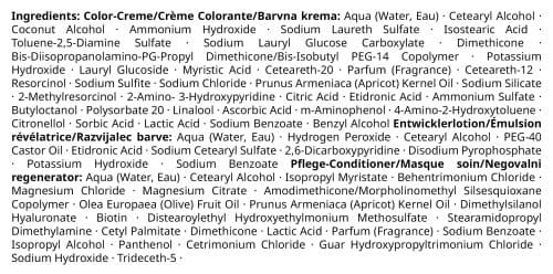 | Inhaltsstoffe | Ingredients: Color-Creme/Crème Colorante/Barvna krema: Aqua (Water, Eau), Cetearyl Alcohol, Coconut Alcohol, Ammonium Hydroxide, Sodium Laureth Sulfate, Isostearic Acid, Toluene-2,5-Diamine Sulfate, Sodium Lauryl Glucose Carboxylate, Dimethicone, Bis-Diisopropanolamino-PG-Propyl Dimethicone/Bis-Isobutyl PEG-14 Copolymer, Potassium Hydroxide, Lauryl Glucoside, Myristic Acid, Ceteareth-20, Parfum (Fragrance), Ceteareth-12, Resorcinol, Sodium Sulfite, Sodium Chloride, Prunus Armeniaca (Apricot) Kernel Oil, Sodium Silicate, 2-Methylresorcinol, 2-Amino-3-Hydroxypyridine, Citric Acid, Etidronic Acid, Ammonium Sulfate, Butyloctanol, Polysorbate 20, Linalool, Ascorbic Acid, m-Aminophenol, 4-Amino-2-Hydroxytoluene, Citronellol, Sorbic Acid, Lactic Acid, Sodium Benzoate, Benzyl Alcohol|Entwicklerlotion/Émulsion révélatrice/Razvijalec barve: Aqua (Water, Eau), Hydrogen Peroxide, Cetearyl Alcohol, PEG-40 Castor Oil, Etidronic Acid, Sodium Cetearyl Sulfate, 2,6-Dicarboxypyridine, Disodium Pyrophosphate, Potassium Hydroxide, Sodium Benzoate|Pflege-Conditioner/Masque soin/Negovaini regenerator: Aqua (Water, Eau), Cetearyl Alcohol, Isopropyl Myristate, Behentrimonium Chloride, Magnesium Chloride, Magnesium Citrate, Amodimethicone/Morpholinomethyl Silsesquioxane Copolymer, Olea Europaea (Olive) Fruit Oil, Prunus Armeniaca (Apricot) Kernel Oil, Dimethylsilanol Hyaluronate, Biotin, Distearoylethyl Hydroxyethylmonium Methosulfate, Stearamidopropyl Dimethylamine, Cetyl Palmitate, Dimethicone, Lactic Acid, Parfum (Fragrance), Sodium Benzoate, Isopropyl Alcohol, Panthenol, Cetrimonium Chloride, Guar Hydroxypropyltrimonium Chloride, Sodium Hydroxide, Trideceth-5, Phenoxyethanol, Benzyl Alcohol |