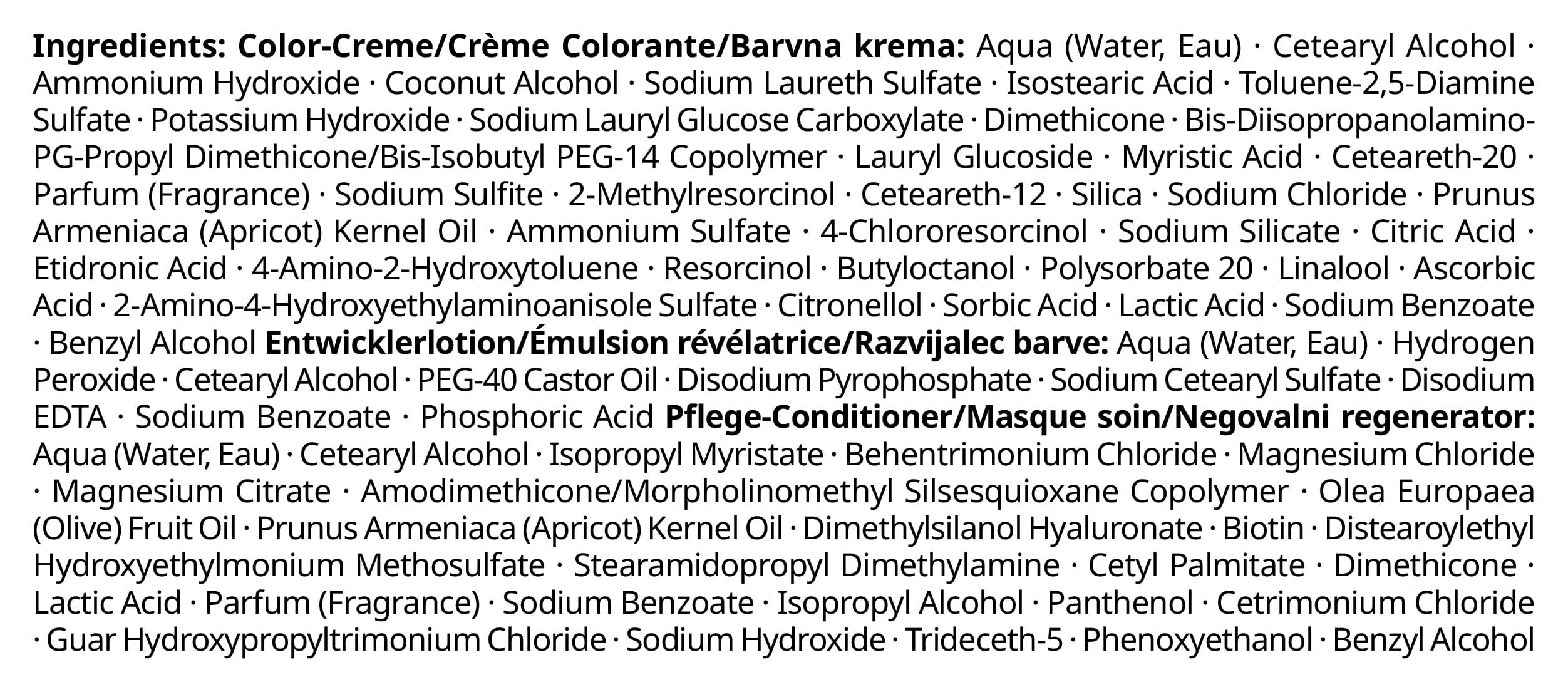 | Inhaltsstoffe | Color-Creme/Crème Colorante/Barvna krema: Aqua (Water, Eau), Cetearyl Alcohol, Ammonium Hydroxide, Coconut Alcohol, Sodium Laureth Sulfate, Isostearic Acid,Toluene-2,5-Diamine Sulfate, Potassium Hydroxide, Sodium Lauryl Glucose Carboxylate, Dimethicone, Bis-Diisopropanolamino-PG-Propyl Dimethicone/Bis-Isobutyl PEG-14 Copolymer, Lauryl Glucoside, Myristic Acid, Ceteareth-20, Parfum (Fragrance), Sodium Sulfite, 2-Methylresorcinol, Ceteareth-12, Silica, Sodium Chloride, Prunus Armeniaca (Apricot) Kernel Oil, Ammonium Sulfate, 4-Chlororesorcinol, Sodium Silicate, Citric Acid, Etidronic Acid, 4-Amino-2-Hydroxytoluene, Resorcinol, Butyloctanol, Polysorbate 20, Linalool, Ascorbic Acid, 2-Amino-4-Hydroxyethylaminoanisole Sulfate, Citronellol, Sorbic Acid, Lactic Acid, Sodium Benzoate, Benzyl Alcohol|Entwicklerlotion/Émulsion révélatrice/Razvijalec barve: Aqua (Water, Eau), Hydrogen Peroxide, Cetearyl Alcohol, PEG-40 Castor Oil, Disodium Pyrophosphate, Sodium Cetearyl Sulfate, Disodium EDTA, S |