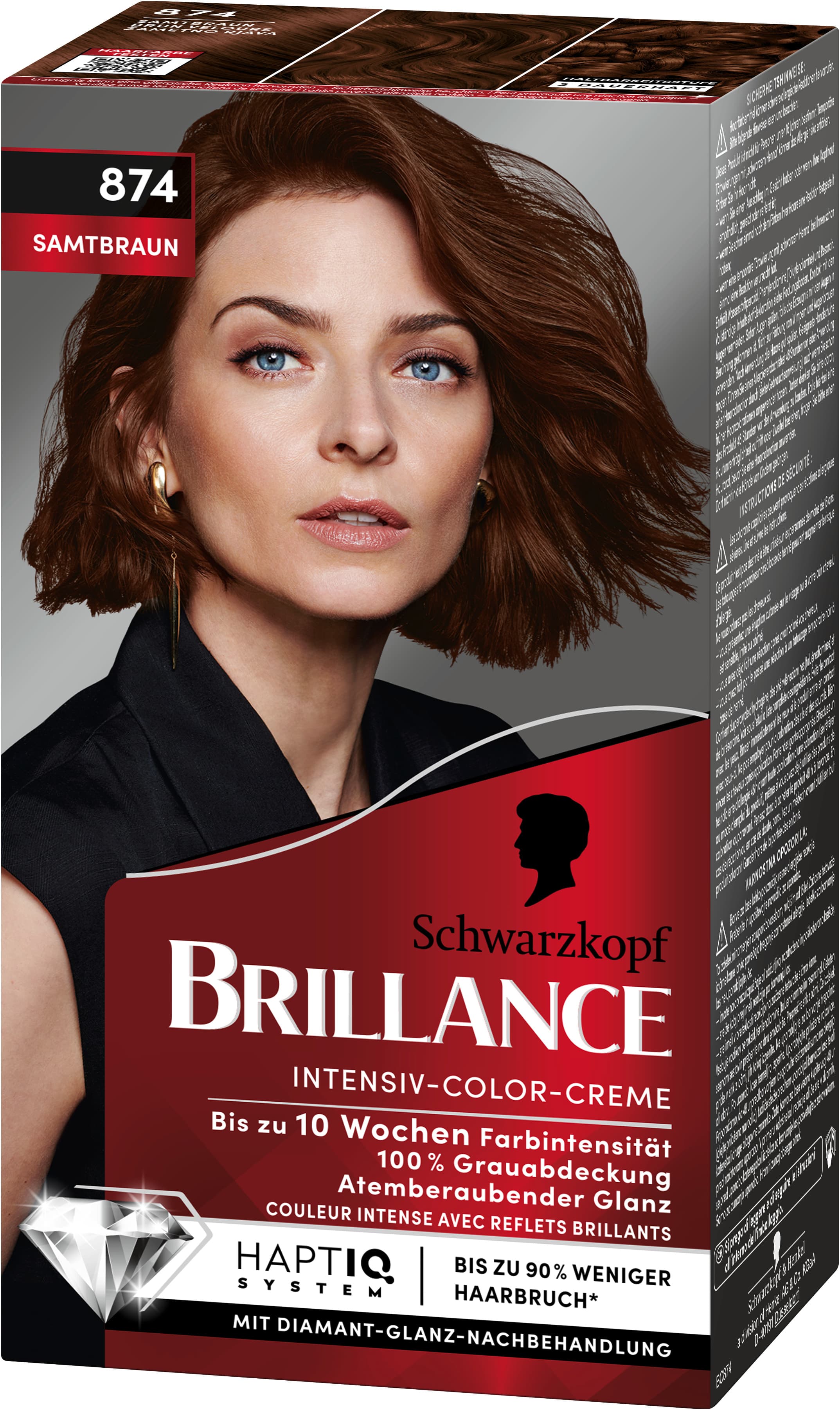 BRILLANCE Intensiv-Color-Creme – Ein Haarfarben-Statement mit Diamant-Glanz.Dank der SCHWARZKOPF Farbexpertise bietet BRILLANCE einzigartig intensive Haarfarben in professioneller Qualität für zu Hause. Die hochleistungsfähige Formel sorgt für langanhaltende Farbintensität bis zu 10 Wochen und für bis zu 100% Grauabdeckung. Das Haar wird mit der Diamant-Glanz-Nachbehandlung gepflegt - Für atemberaubenden Glanz.Reichhaltige Pflege mit HaptIQ System:Die besondere Conditioner-Formel mit HaptIQ System pflegt Ihr Haar wie folgt:1. Neue Mikroverbindungen werden im Haar gebildet.2. Die Haare werden nach dem Colorieren mit einer Schutzschicht umhüllt.3. Die Haarfasern werden von innen gestarkt – für bis zu 90 % weniger Haarbruch* und für langanhaltende Farbergebnisse.HaptIQ - Wunderschöne Haarergebnisse, die Sie fühlen können.Die Produktvorteile im Detail:Bis zu 10 Wochen FarbintensitätIntensive Leuchtkraft&GlanzPerfekte GrauabdeckungPflege-Condtioner mit HaptIQ-SystemBis zu 90% weniger Haarbruch*Anwendung: Die fertige Colorationsmischung Strähne für Strähne auf dem gesamten Haar verteilen. Die Mischung entsprechend der Angabe in der Gebrauchsanweisung einwirken lassen. Bei längerem oder dickerem Haar bitte für eine erste Anwendung 2 Packungen BRILLANCE verwenden.Darf nicht in die Hände von Kindern gelangen. Entwickler von Hitze fernhalten. Keine nicht gebrauchte Mischung aufbewahren.* Instrumenteller Test mit und ohne Conditioner.
