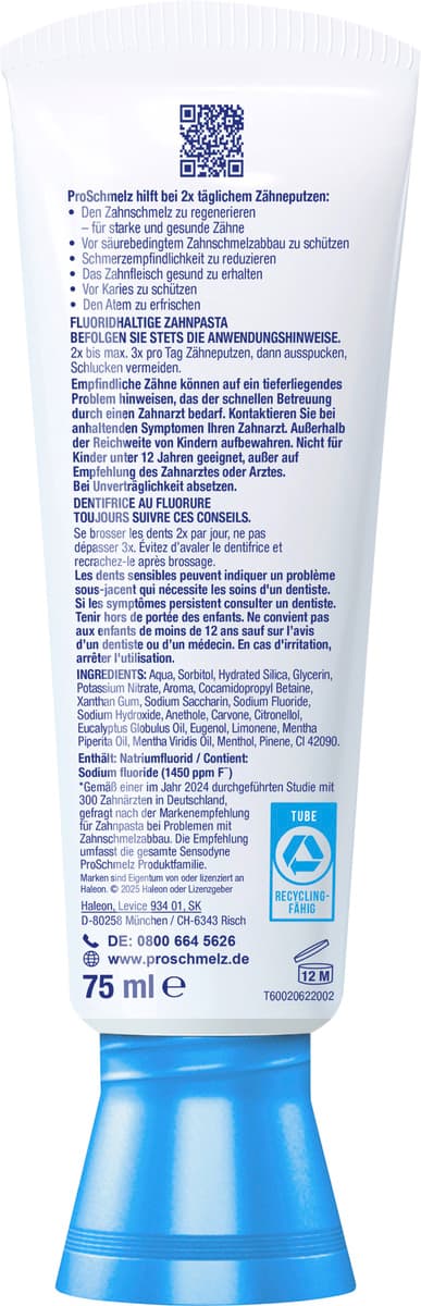 | Inhaltsstoffe | Aqua, Sorbitol, Hydrated Silica, Glycerin, Potassium Nitrate, Aroma, Cocamidopropyl Betaine, Xanthan Gum, Sodium Saccharin, Sodium Fluoride, Sodium Hydroxide, Limonene, Eugenol, CI 42090. Enthält: Natriumfluorid (1450 ppm F-) |