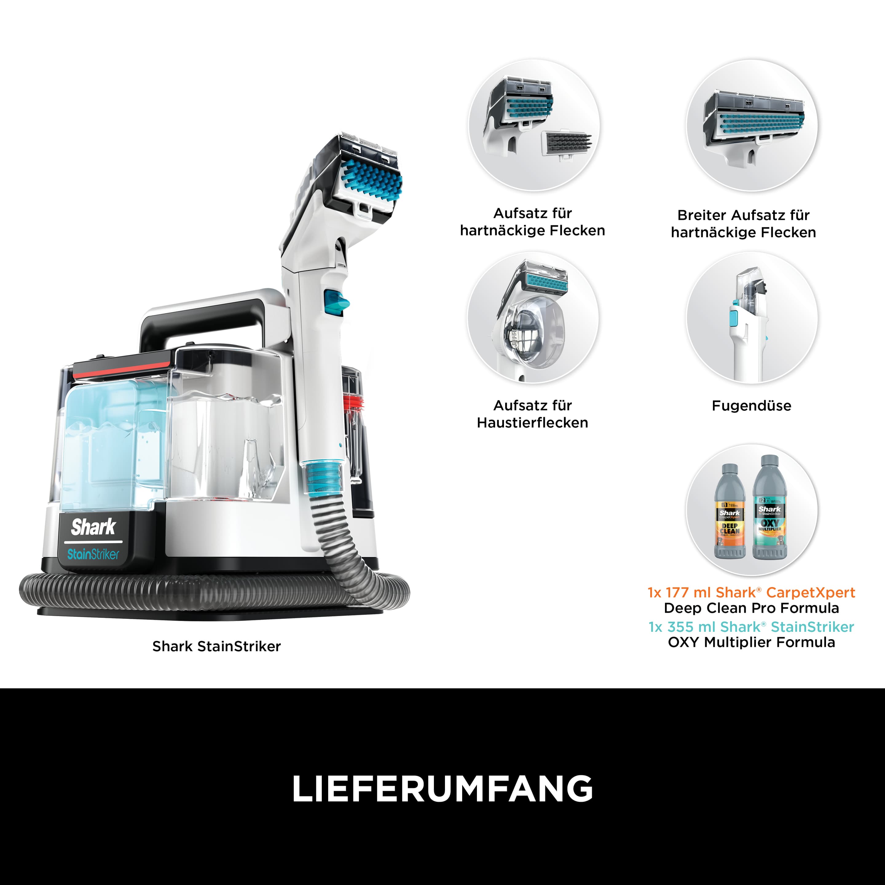 - Inklusive 4 Spezialaufsätzen: Aufsatz für hartnäckige Flecken, Fugendüse, Tierhaarentferner, Aufsatz für Haustierflecken und Starterflaschen der Reinigungsformeln StainStriker und CarpetXpert.