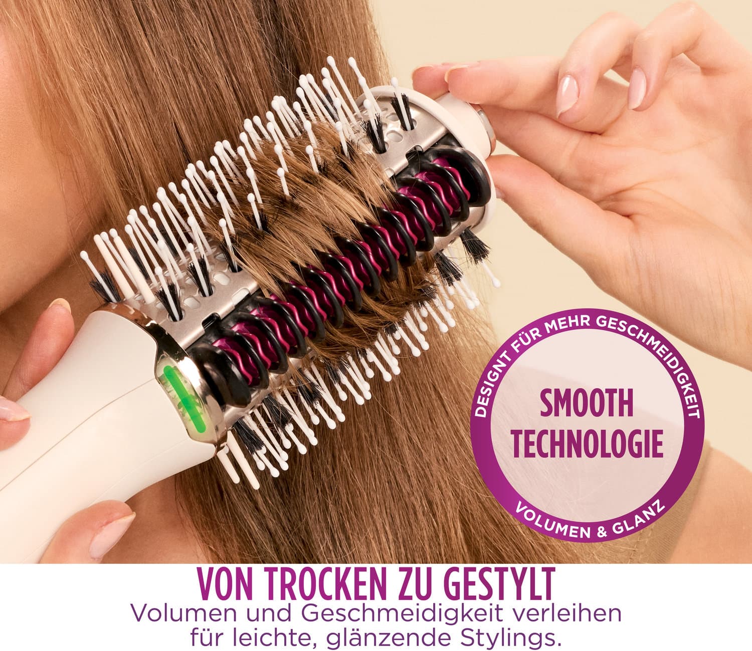 | Anwendungshinweis | Perfekt für alle Haartypen. Durch eine Drehung kannst du zwischen 3 Temperaturstufen wählen. Zwei Borstenarten entwirren das Haar und verleihen Volumen. Der integrierte beheizte Kamm mit keramikbeschichteten Platten stylt Deine Haare. |