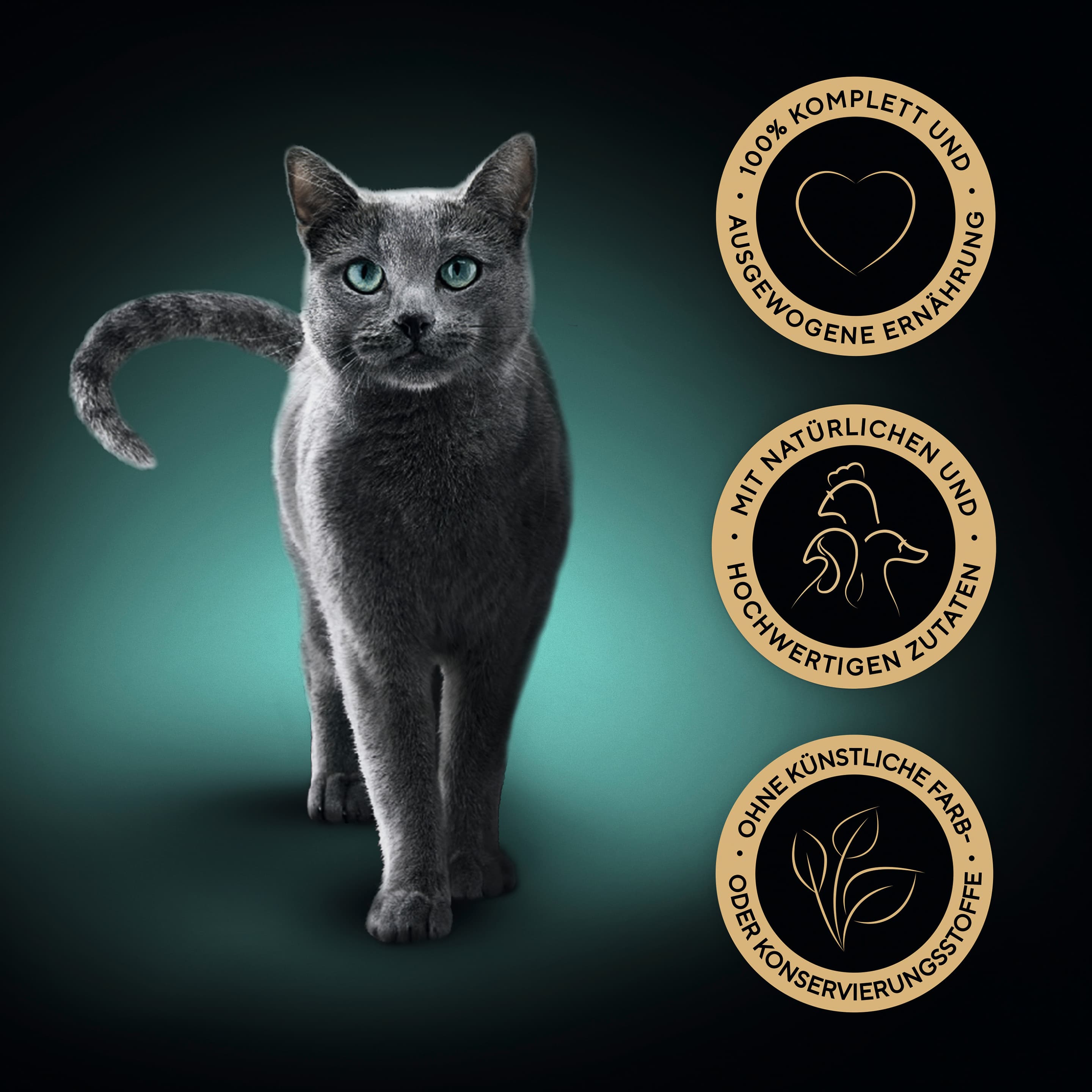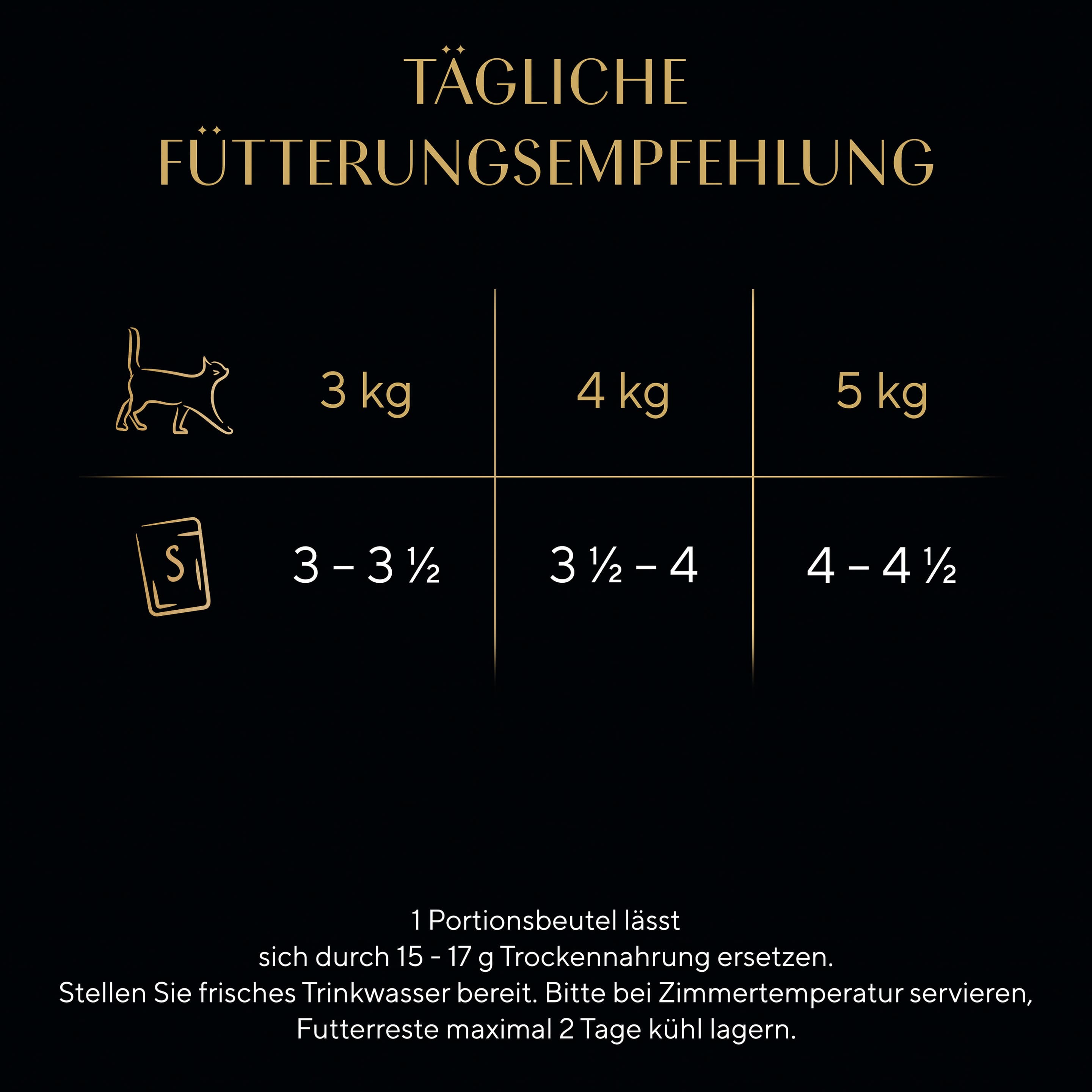 | Fütterungsempfehlung | Fütterungsempfehlung: 1 Portionsbeutel lässt sich durch 15 - 17 g Trockennahrung ersetzen. Berücksichtigen Sie die Kalorien, die von Snacks stammen. Fütterungsmengen sind nur als Richtlinien gedacht. Passen Sie die Fütterungsmenge entsprechend dem Alter, der Grösse und der Aktivität Ihrer Katze an. Stellen Sie frisches Trinkwasser bereit. Bitte bei Zimmertemperatur servieren. |
