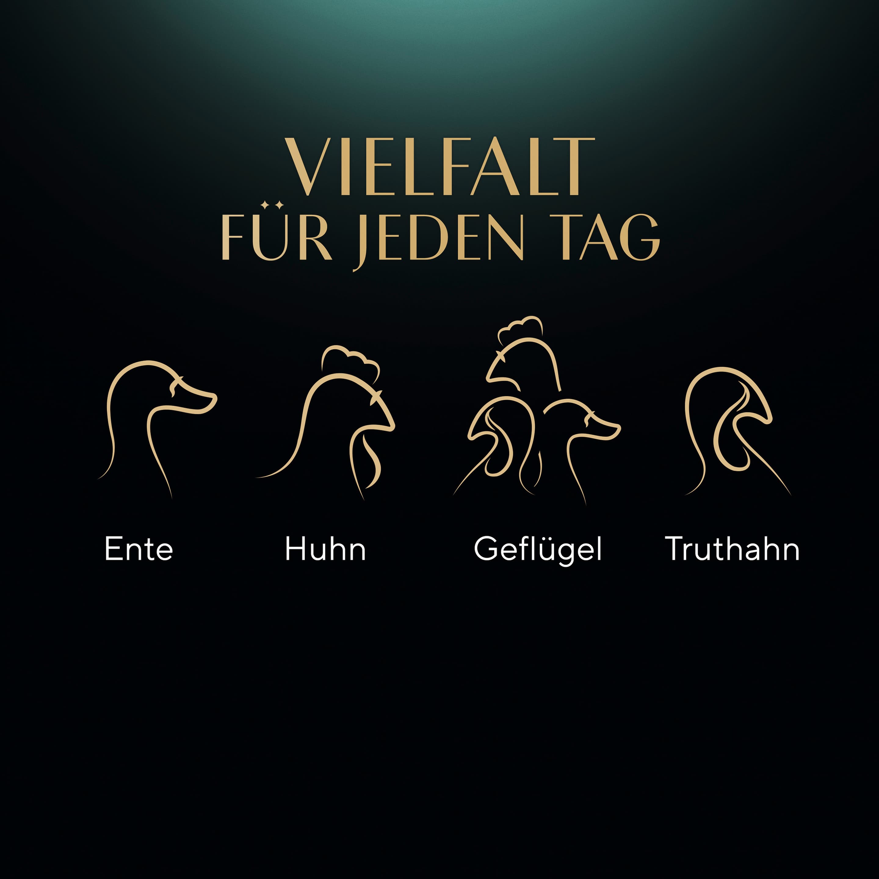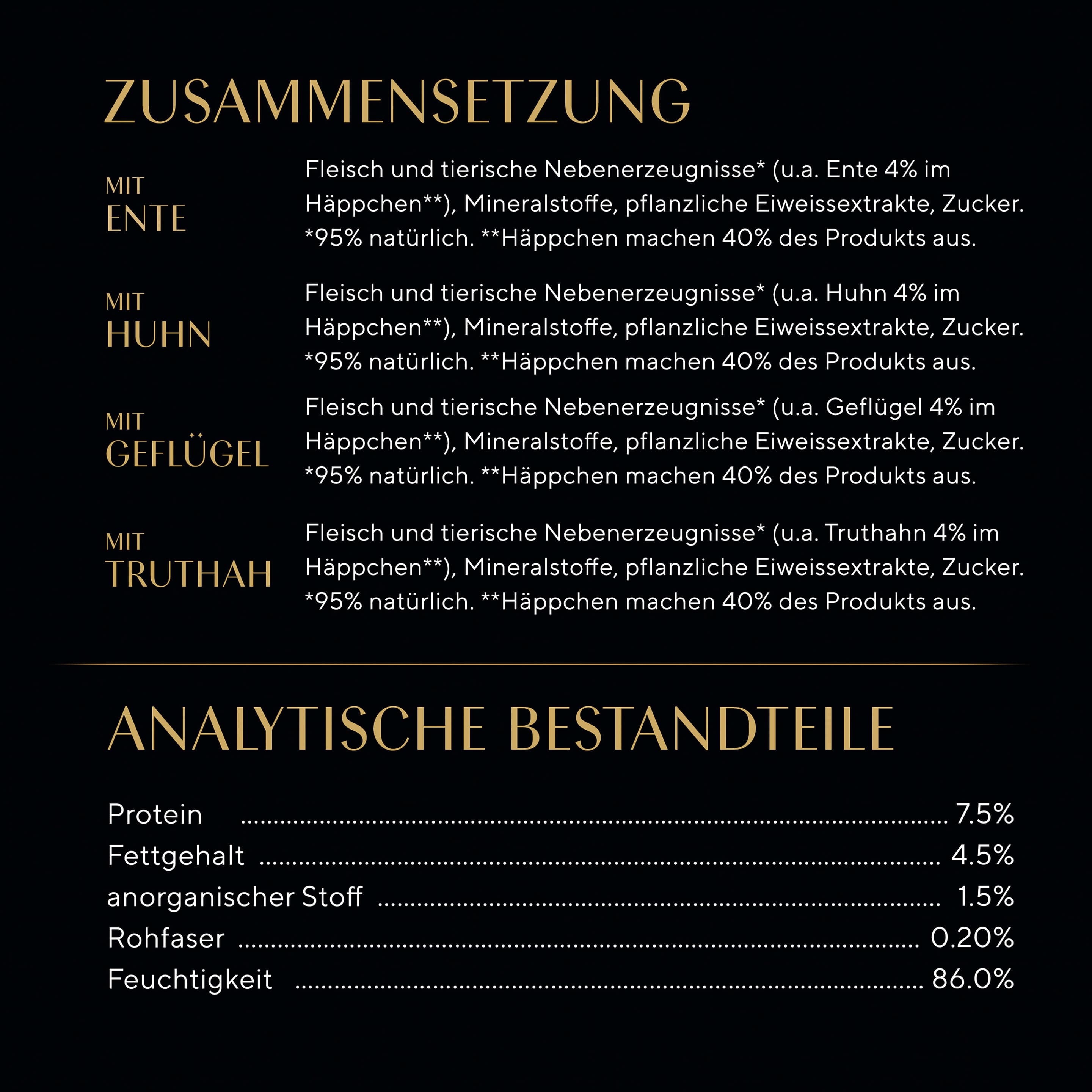 | Zusammensetzung (Futter) | mit Ente - Zusammensetzung: Fleisch und tierische Nebenerzeugnisse* (u.a. Ente 4% im Häppchen**), Mineralstoffe, pflanzliche Eiweissextrakte, Zucker. *95% natürlich. **Häppchen machen 40% des Produkts aus. # mit Huhn - Zusammensetzung: Fleisch und tierische Nebenerzeugnisse* (u.a. Huhn 4% im Häppchen**), Mineralstoffe, pflanzliche Eiweissextrakte, Zucker. *95% natürlich. **Häppchen machen 40% des Produkts aus. # mit Geflügel - Zusammensetzung: Fleisch und tierische Nebenerzeugnisse* (u.a. Geflügel 4% im Häppchen**), Mineralstoffe, pflanzliche Eiweissextrakte, Zucker. *95% natürlich. **Häppchen machen 40% des Produkts aus. # mit Truthahn - Zusammensetzung: Fleisch und tierische Nebenerzeugnisse* (u.a. Truthahn 4% im Häppchen**), Mineralstoffe, pflanzliche Eiweissextrakte, Zucker. *95% natürlich. **Häppchen machen 40% des Produkts aus. |