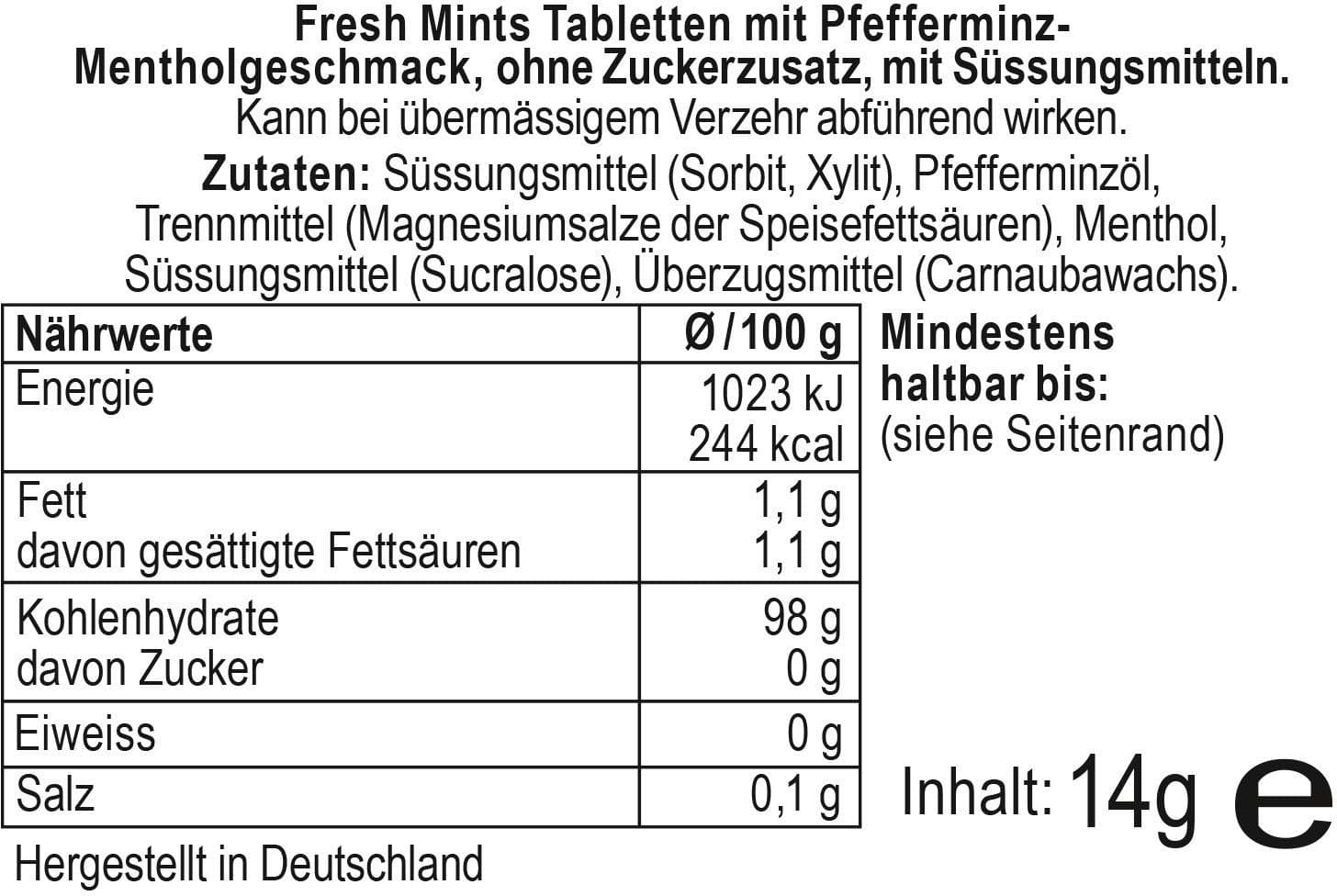ZutatenSüßungsmittel (Sorbit, Xylit), Pfefferminzöl, Trennmittel (Magnesiumsalze von Speisefettsäuren), Menthol; ohne Zucker mit Süßungsmitteln (Sucralose, aspartamfrei), Überzugsmittel (Carnaubawachs)