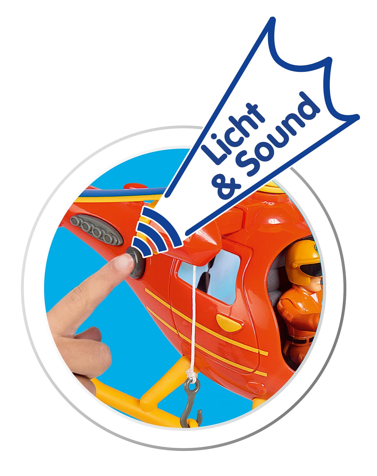 mit Orginalsound, Blaulicht, Suchscheinwerfer, Seilwinde, mit Tom Figur, Zubehör, Try me, L:15cm, 3J+• Einsatzfahrzeug - Hubschrauber Wallaby ist eines der Einsatzfahrzeuge von Feuerwehrmann Sam und seinen Kollegen aus Pontypandy. Hinter dem Steuer hat Tom Thomas Platz genommen.• Für die Rettung im Einsatz - mit dem 15cm großen Hubschrauber werden Unfallpersonen mit der Trage schnell ins nächste Krankenhaus geflogen oder Feuer mit dem Bottich aus der Luft gelöscht; Trage oder Bottich werden an der Seilwinde befestigt.• Mit Sound - am Heck des Hubschraubers kann mit Tastendruck das Blaulicht aktiviert werden; dabei ertönt ein cooler Originalsound; Batterien 3 x 1,5V R03 sind im Set nicht enthalten• Suchscheinwerfer und Seilwinde - damit Pilot Tom auch in der Dunkelheit auf Rettungsmission gehen kann, ist Wallaby mit einem Suchscheinwerfer ausgestattet; eine Seilwinde und viel Zubehör vervollständigen die Ausstattung des Hubschraubers.• Simba - Elefantenstarker Spielspaß; im Zentrum der Produktentwicklung steht die Begeisterung der Kinder; für Jungen und Mädchen, Klein und Groß; Kinder sollen Spaß haben und gefördert werden.