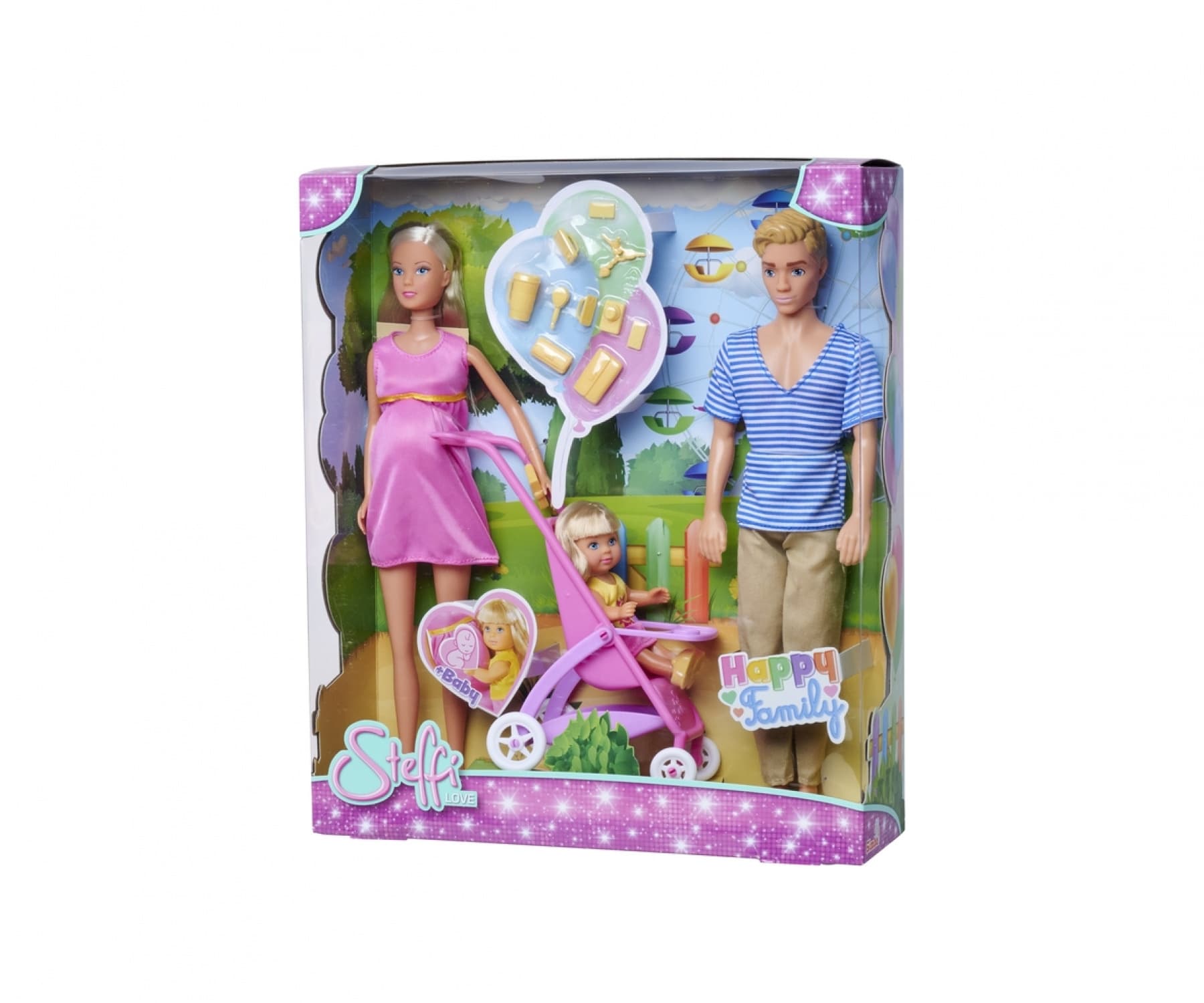 Schwangere Steffi, Kevin, Evi und Baby mit Kinderwagen und 11-tlg. Zubehör, 30cm, 29cm, 12cm, 4cm