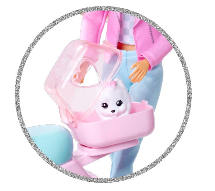 • Unterwegs mit dem Scooter – Mit ihrem rosa-türkisfarbenen City Scooter ist Steffi mobil und stilvoll unterwegs. Das moderne Design passt perfekt zu ihrem aktiven Alltag und regt zum fantasievollen Spiel an.