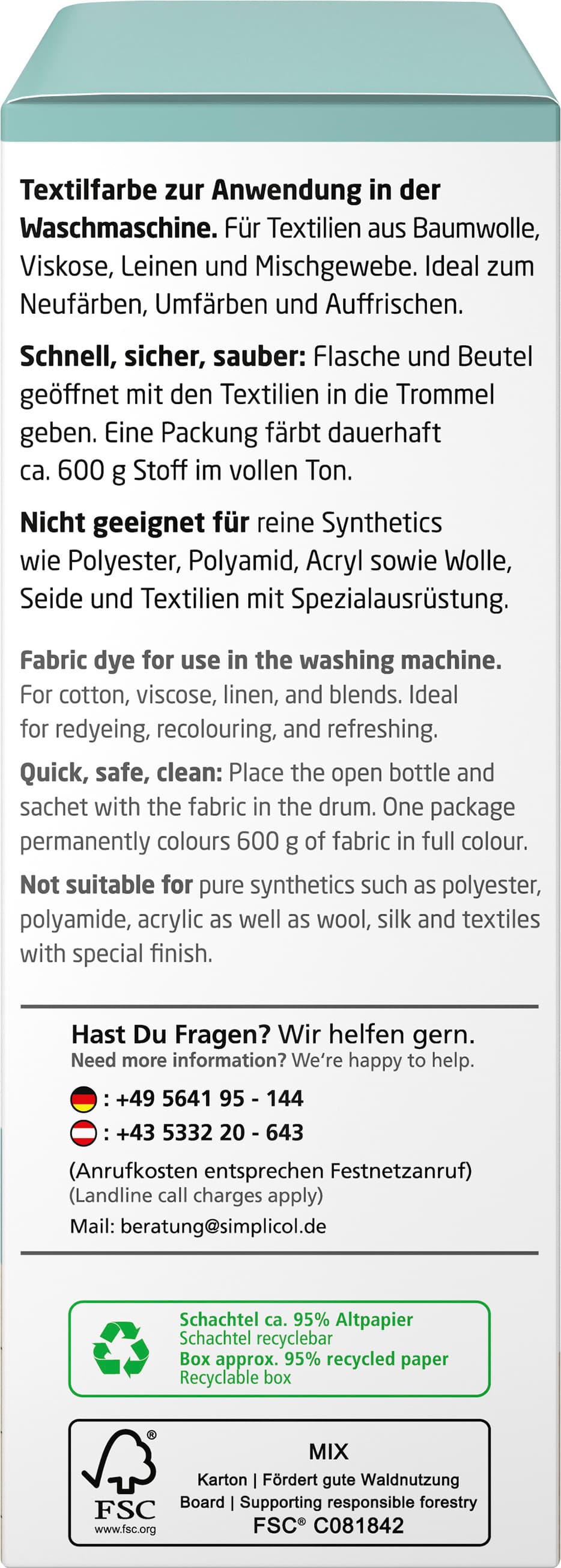 Textilfarbe zur Anwendung in der Waschmaschine. Für Textilien aus Baumwolle, Viskose, Leinen und Mischgewebe. Ideal zum Neufärben, Umfärben und Auffrischen.Schnell, sicher, sauber: Flasche und Beutel geöffnet mit den Textilien in die Trommel geben.Eine Packung färbt dauerhaft ca. 600 g Stoff im vollen Ton.