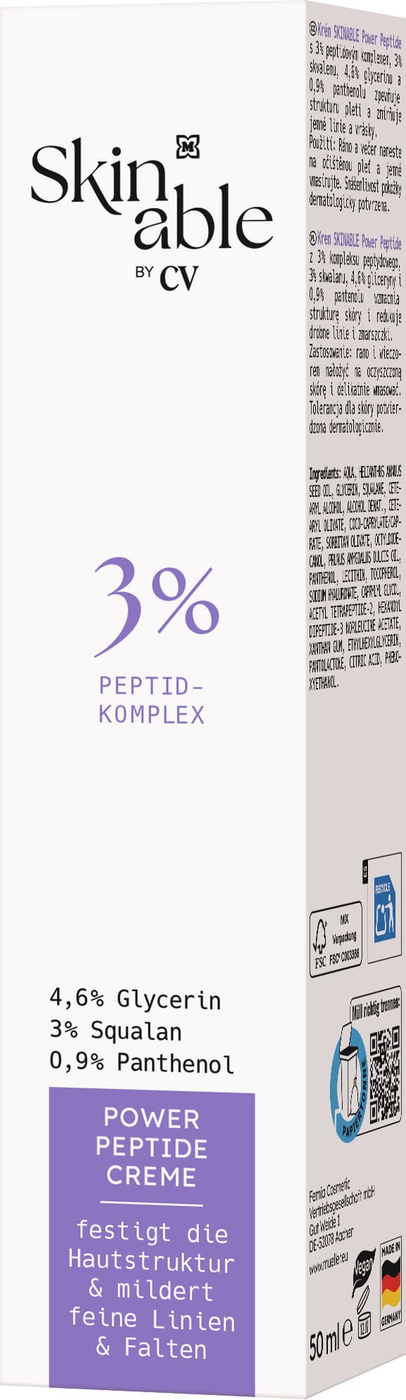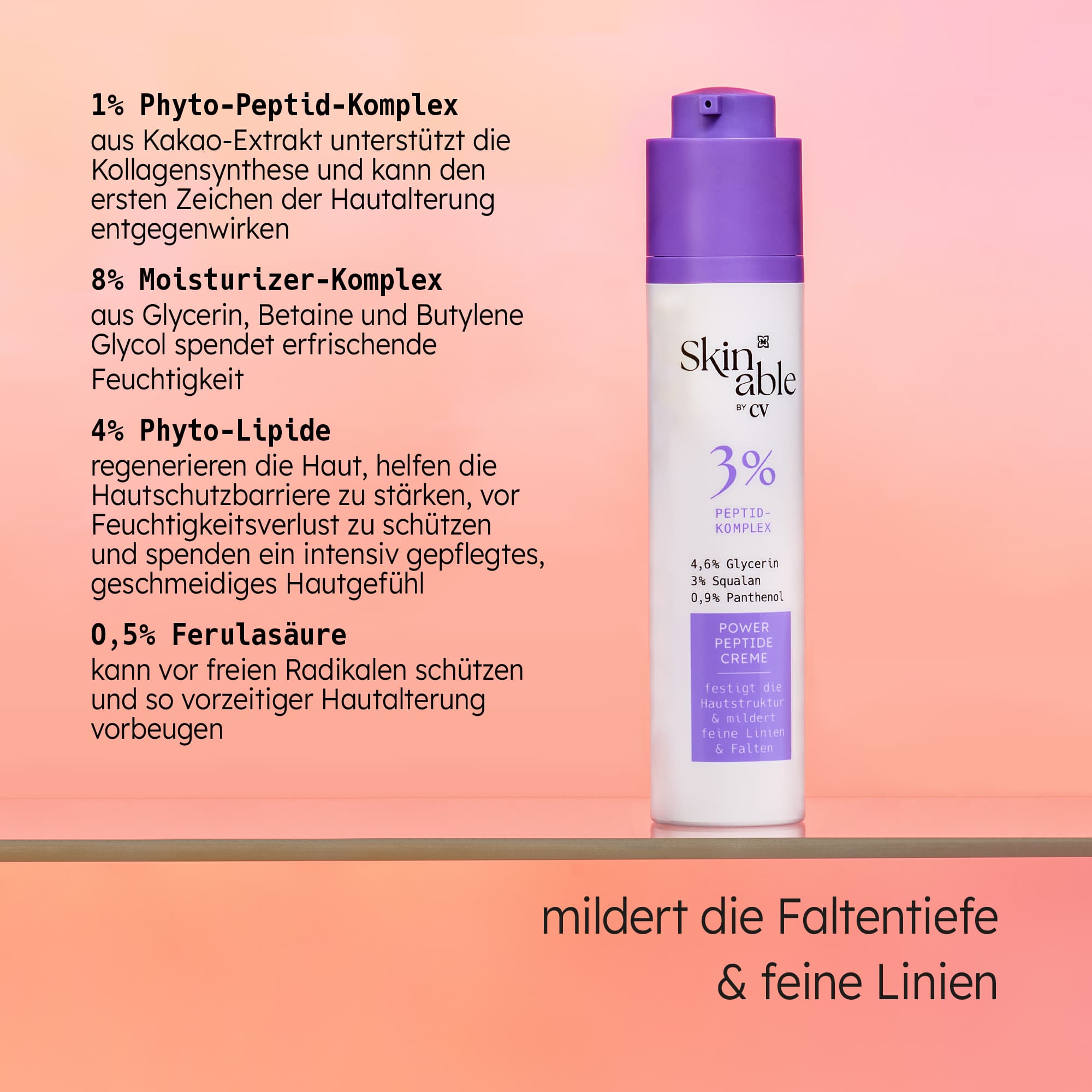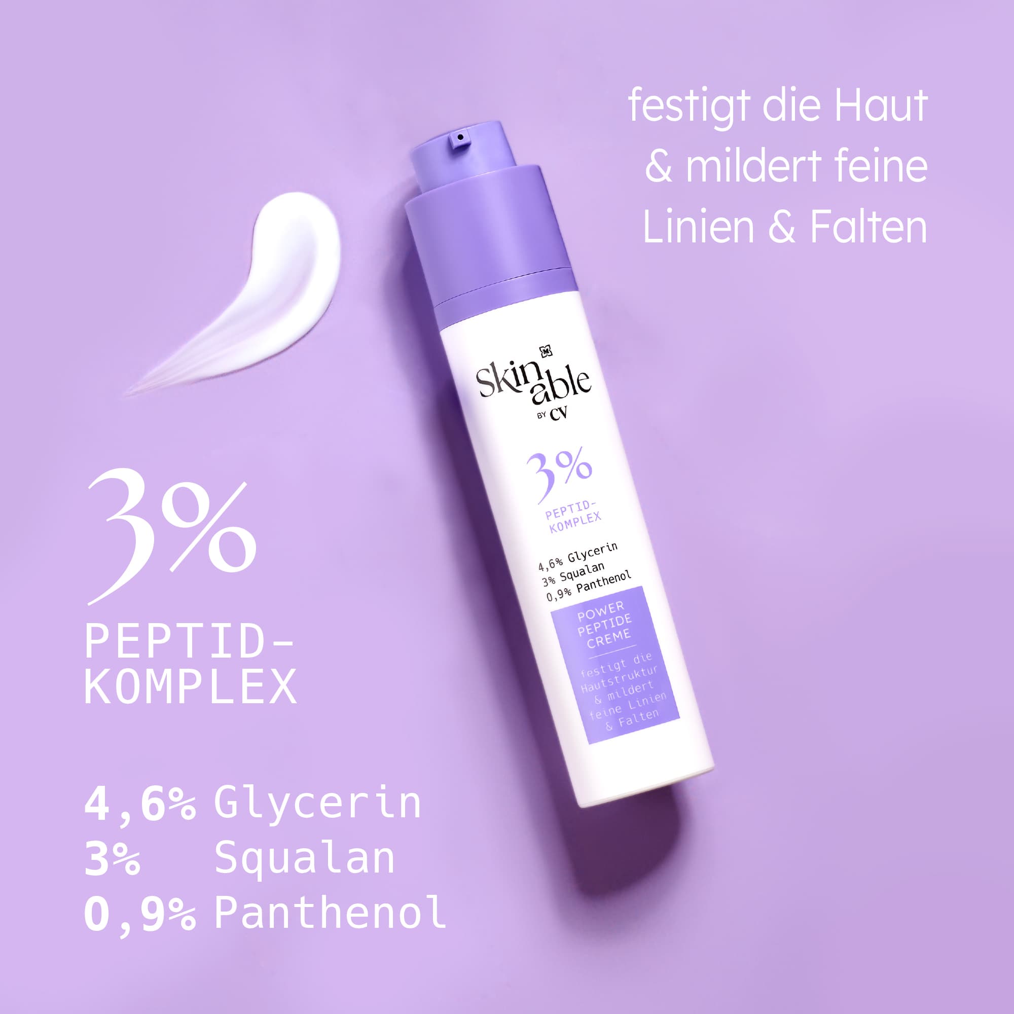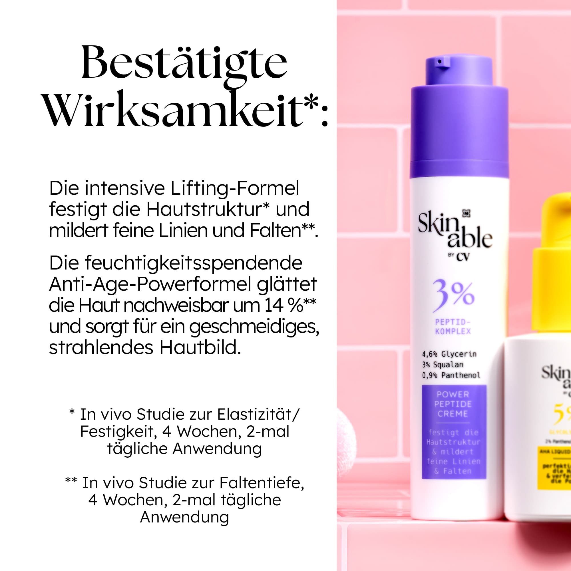 Die SKINABLE Power Peptide Creme perfektioniert das Erscheinungsbild mit Anti-Aging-Effekt. Die intensive Lifting-Formel festigt die Hautstruktur* und mildert feine Linien und Falten**. Für ein verjüngtes Aussehen und vitale Strahlkraft! Die feuchtigkeitsspendende Anti-Age-Powerformel mit 3% Peptid-Komplex, 3% Squalan, 4,6% Glycerin und 0,9% Panthenol glättet die Haut nachweisbar um 14%**.