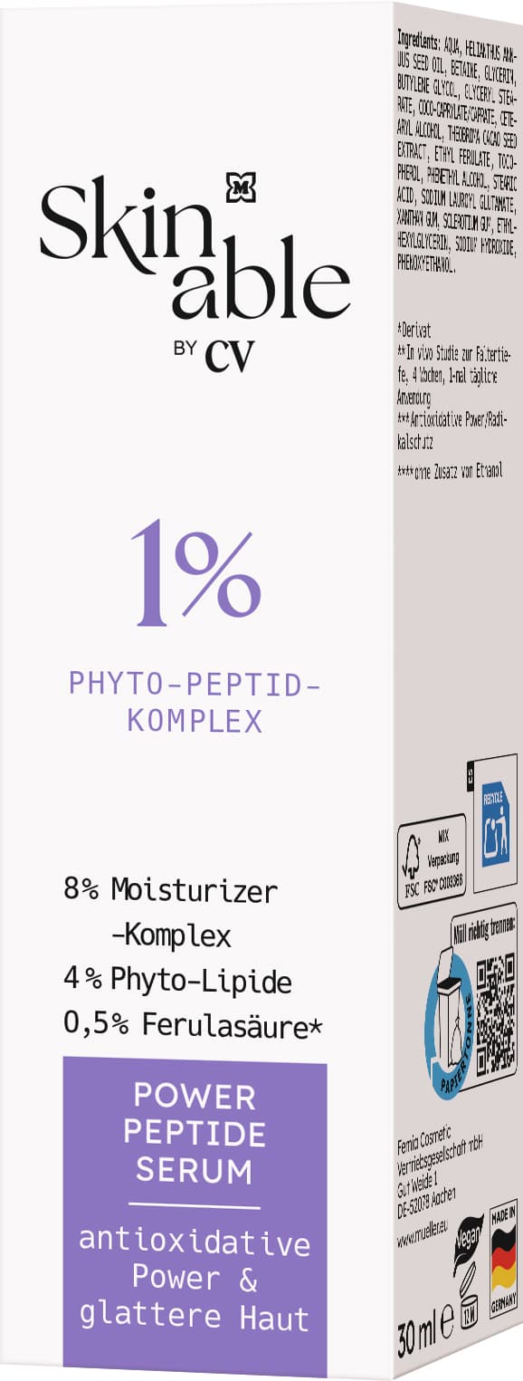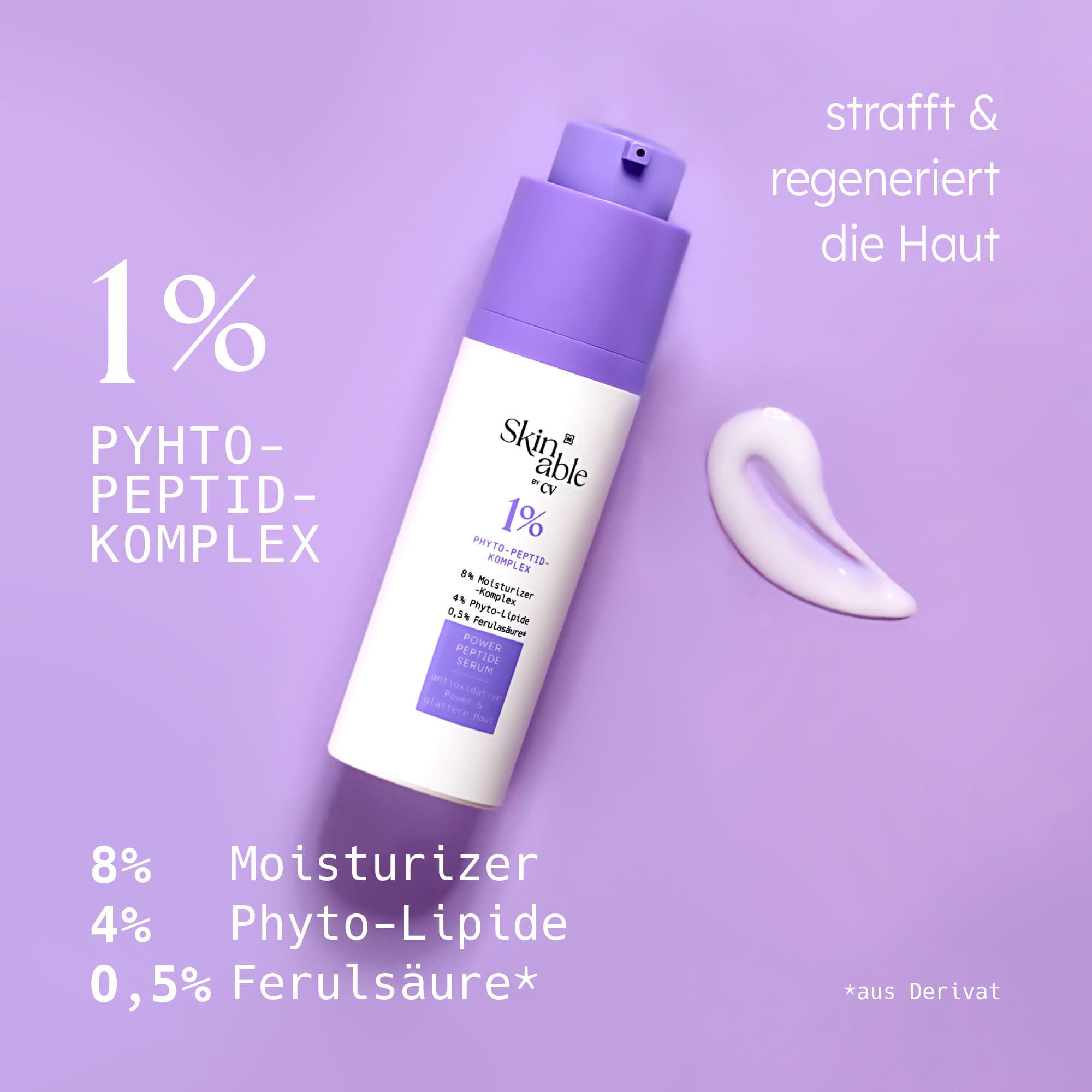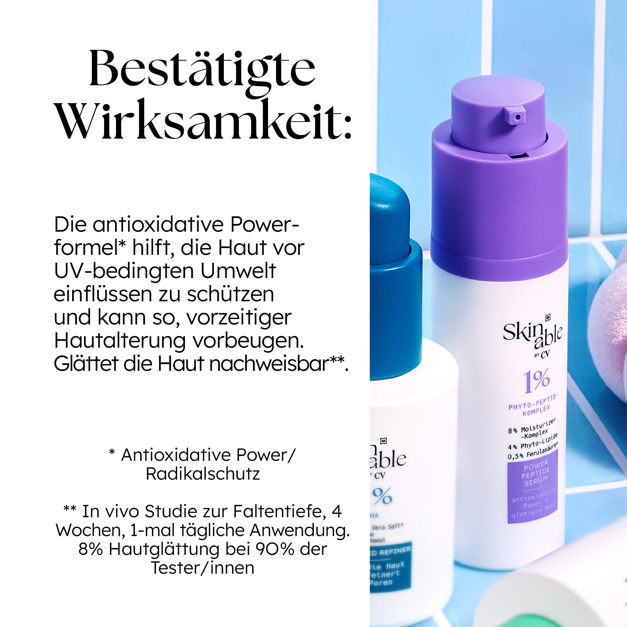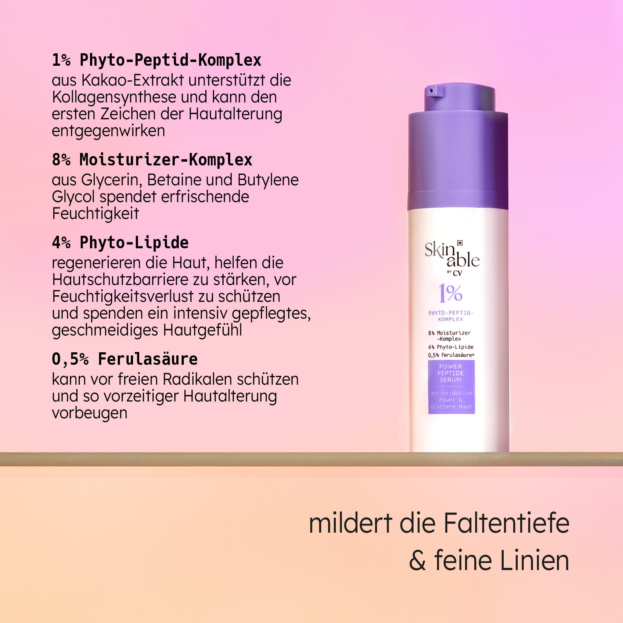 Das SKINABLE Power Peptide Serum mildert die Faltentiefe und feine Linien** und verleiht so ein glatteres Hautgefühl und ein strahlend frisches Aussehen! Die antioxidative Powerformel*** mit 1% Phyto-Peptid-Komplex, 8% Moisturizer-Komplex, 4% Phyto-Lipiden und 0,5% Ferulasäure* hilft, die Haut vor UV-bedingten Umwelteinflüssen zu schützen und kann so, vorzeitiger Hautalterung vorbeugen. Glättet die Haut nachweisbar um 8%.**