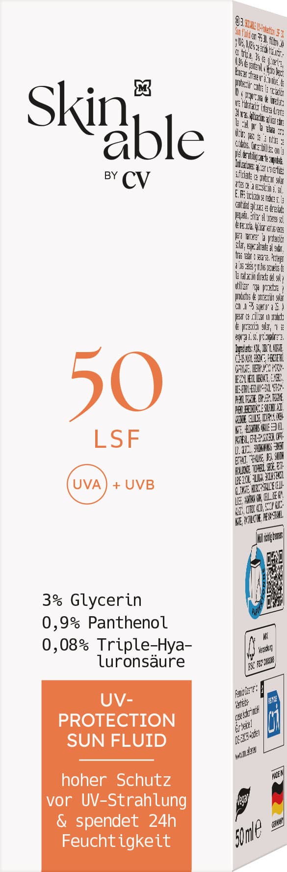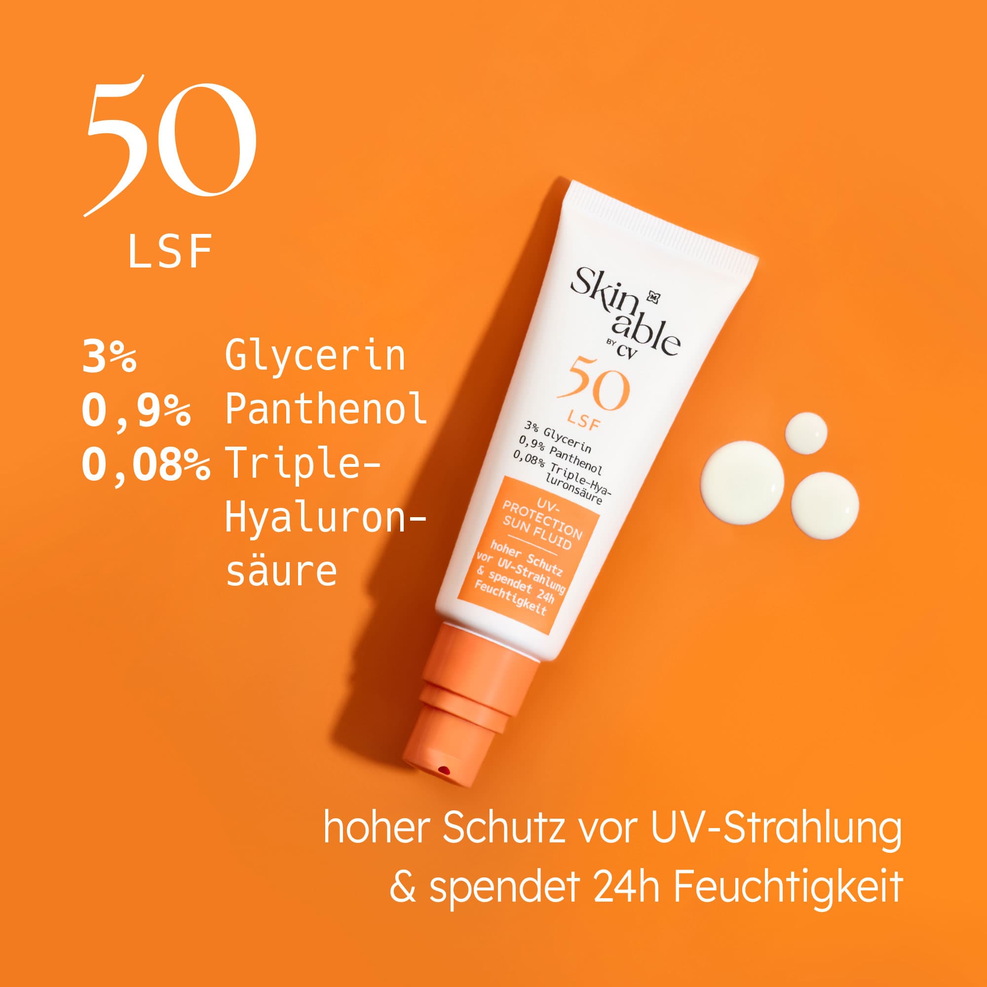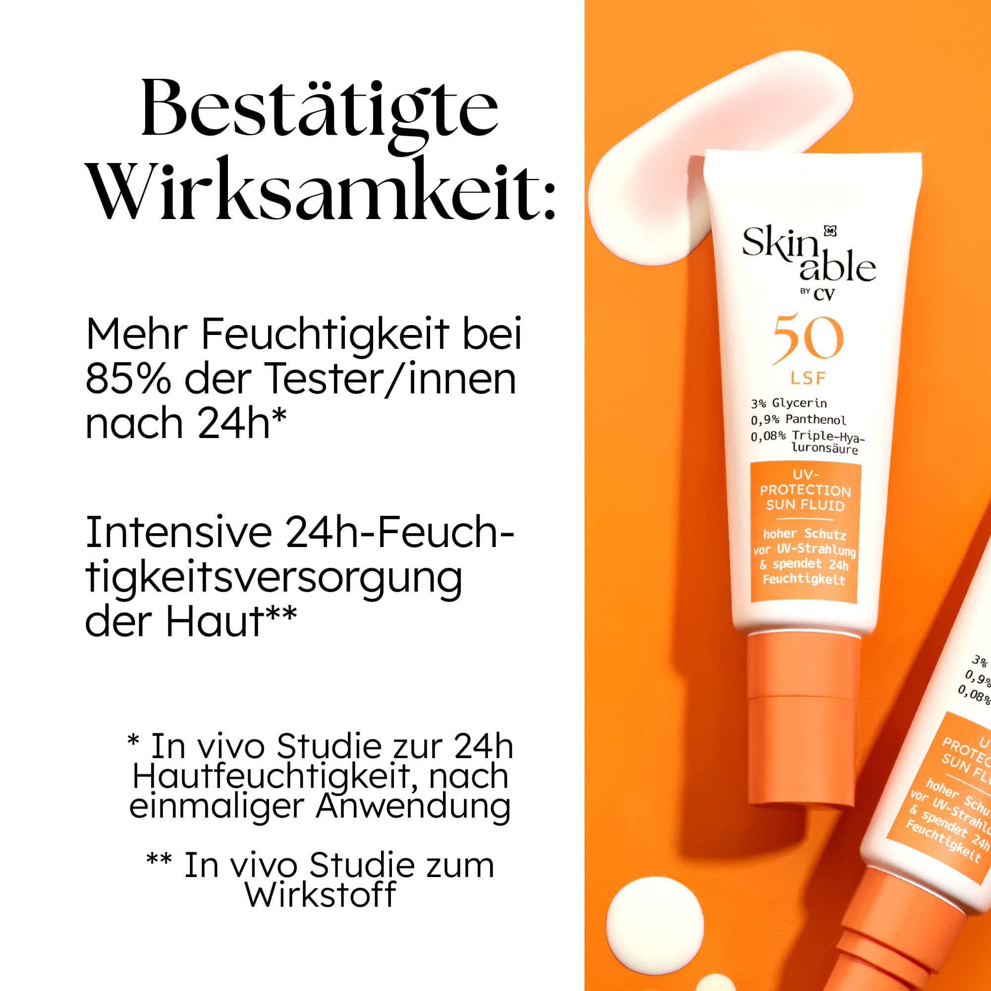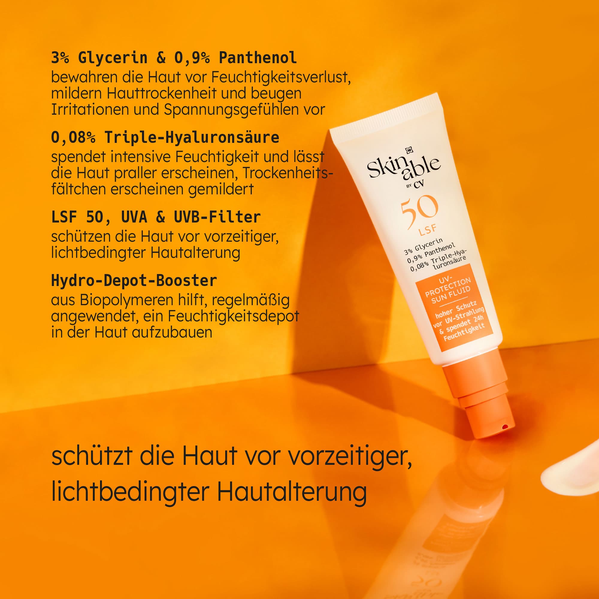 Das SKINABLE UV-Protection LSF 50 Sunfluid bietet einen hohen Schutz vor UV-Strahlung, spendet sofort intensive Feuchtigkeit für 24 Stunden und kann bei regelmäßiger Anwendung helfen, erste Anzeichen von Hautalterung, wie Fältchen und Pigmentflecken, vorzubeugen.