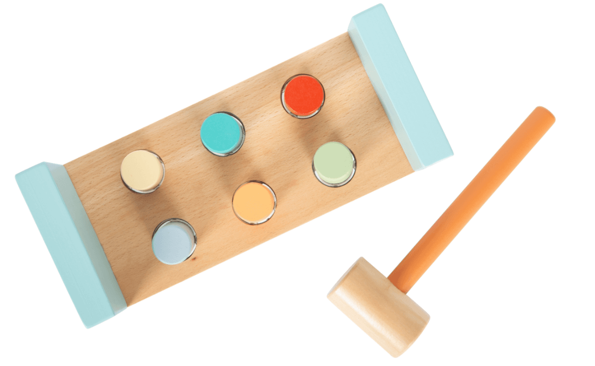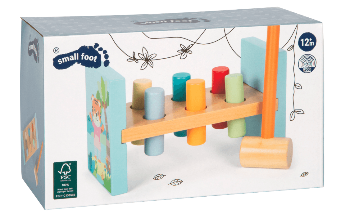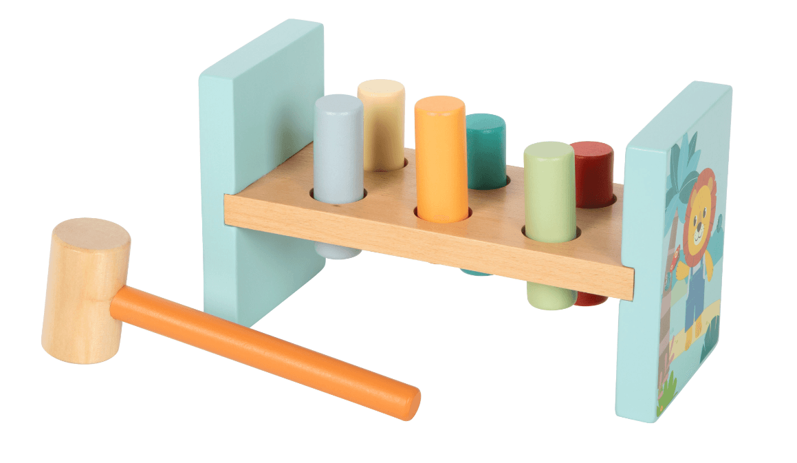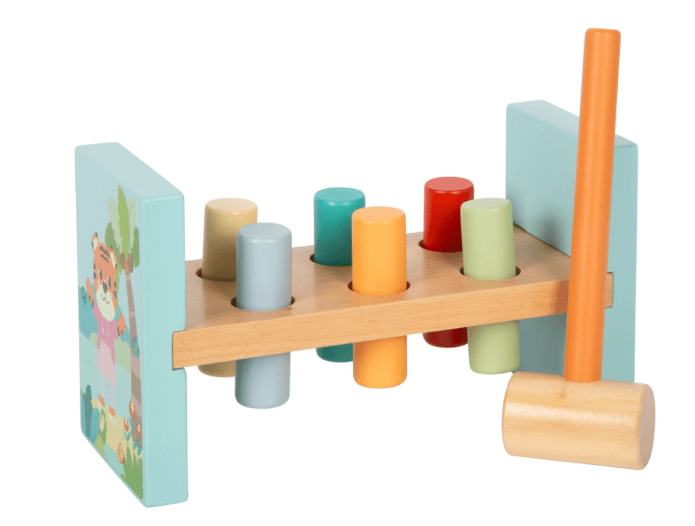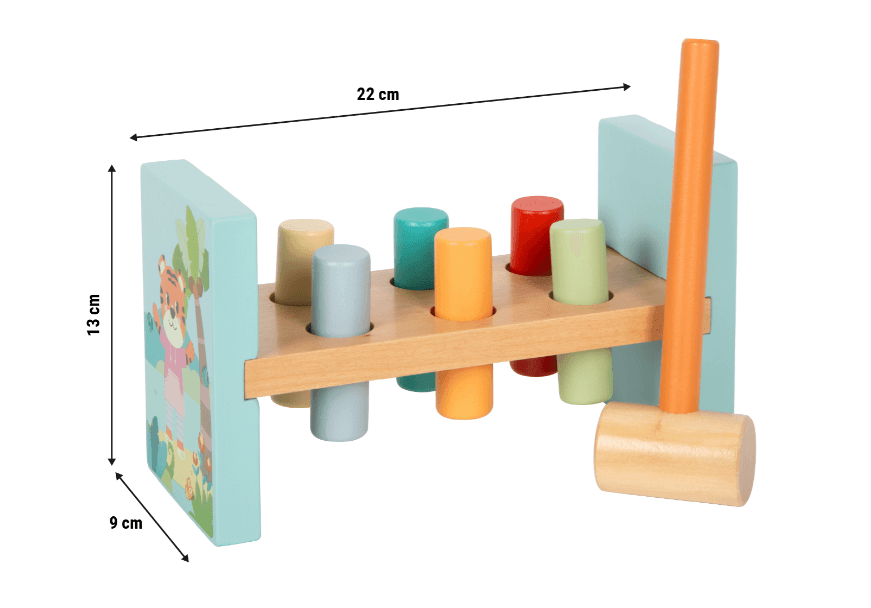 Das hochwertige Klopfspiel mit fröhlichen Wildtier-Motiven animiert zum aktiven Spielen und fördert dabei wichtige motorische Fähigkeiten. Die gummierten Löcher sorgen dafür, dass die Holzzylinder sicher in Position bleiben, bis sie mit dem beiliegenden Holzhammer durchgeschlagen werden. Die kindgerechte Gestaltung, die ansprechende Farbgebung und der sichtbare Holzanteil machen dieses langlebige Spielzeug zu einem Highlight im Kinderzimmer.
