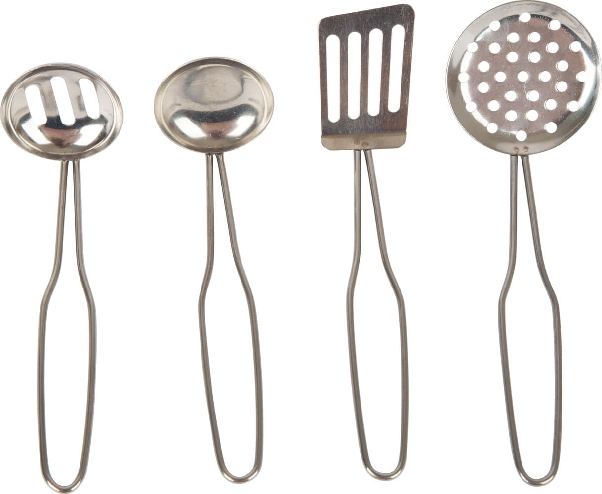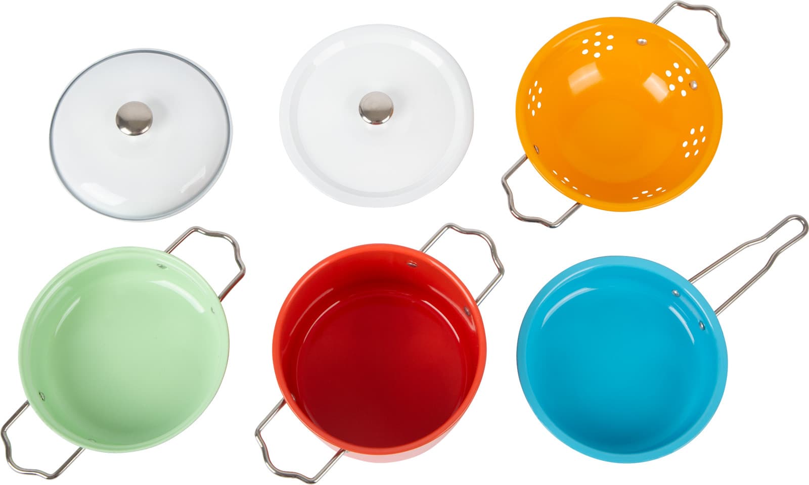 Schwingt den Kochlöffel! Dieses lebensmittelechte Kochgeschirr-Set bestehend aus einer Pfanne, zwei Kochtöpfen mit abnehmbarem Deckel, einem Sieb, einem Pfannenwender, einer Kelle, einem Schlitzlöffel und einem Abseihlöffel aus Metall überzeugt durch seine angesagte Farbgebung und inspiriert kleine Sterneköche zu leckeren Gerichten. Damit macht das Kochen in der Kinderküche noch mehr Spaß. Beim Spielen mit diesem farbenfrohen Küchenzubehör-Set werden das Rollenspiel und die motorischen Fähigkeiten gefördert. Besonders praktisch: Die Topfdeckel sind mit der Bratpfanne kompatibel.