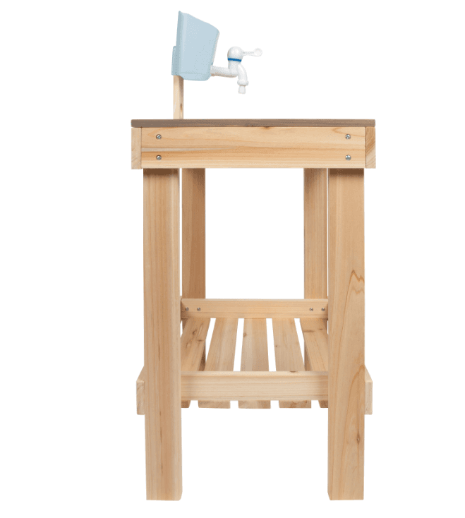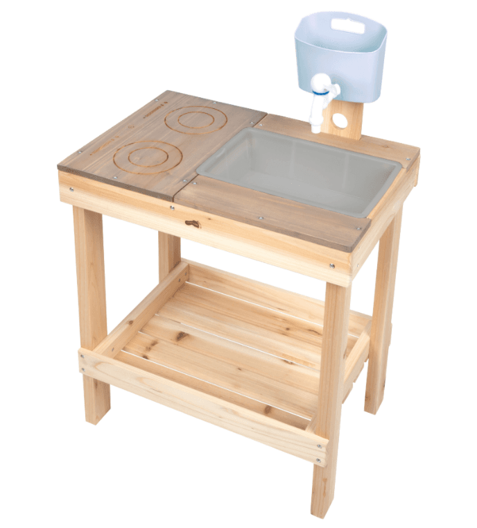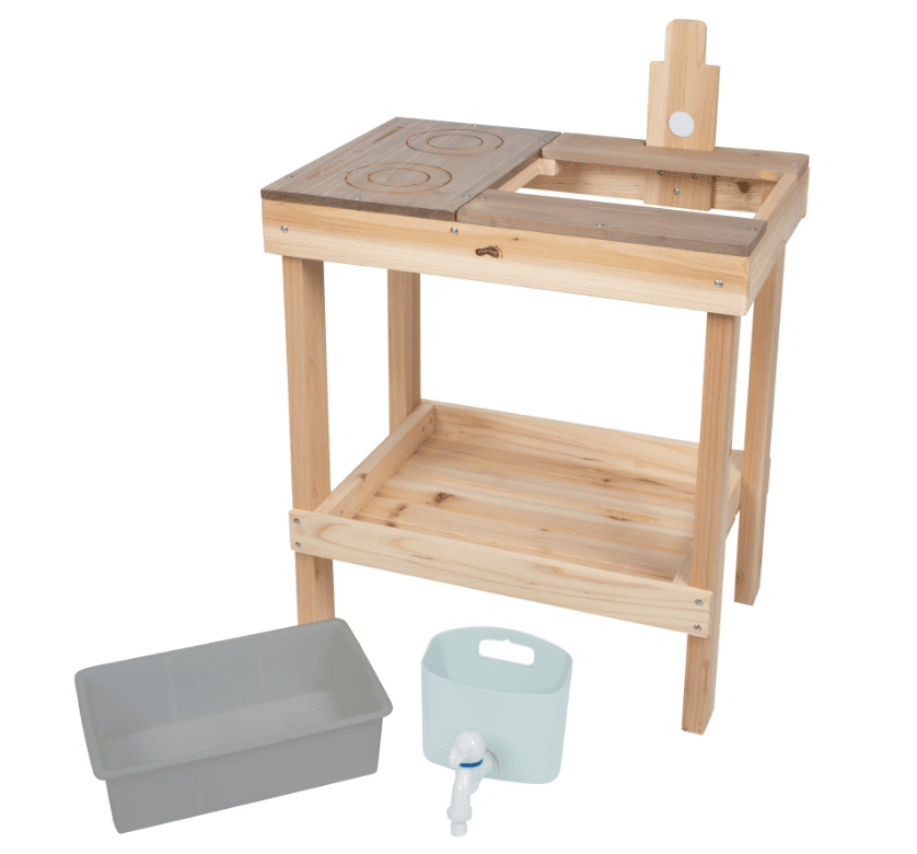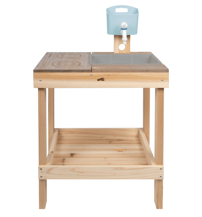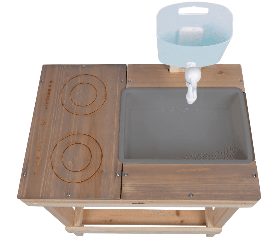 Diese hochwertige Vollholzmatschküche wird durch ihre kompakte Bauweise und die vielen durchdachten Details zur perfekten Ergänzung in jedem Outdoor-Spielbereich. Kinder können nach Lust und Laune kochen, matschen und ganz eigene Spielideen entwickeln. Die zurückhaltende Farbgestaltung mit farblich abgesetzter Arbeitsfläche passt sich stilvoll jedem Gartenambiente an. Als Draußenspielküche bietet sie vielseitigen Spielwert mit pädagogischem Anspruch. Für eine langlebige Nutzungsdauer sollte das unbehandelte Holz mit einer Holzschutzlasur geschützt werden.