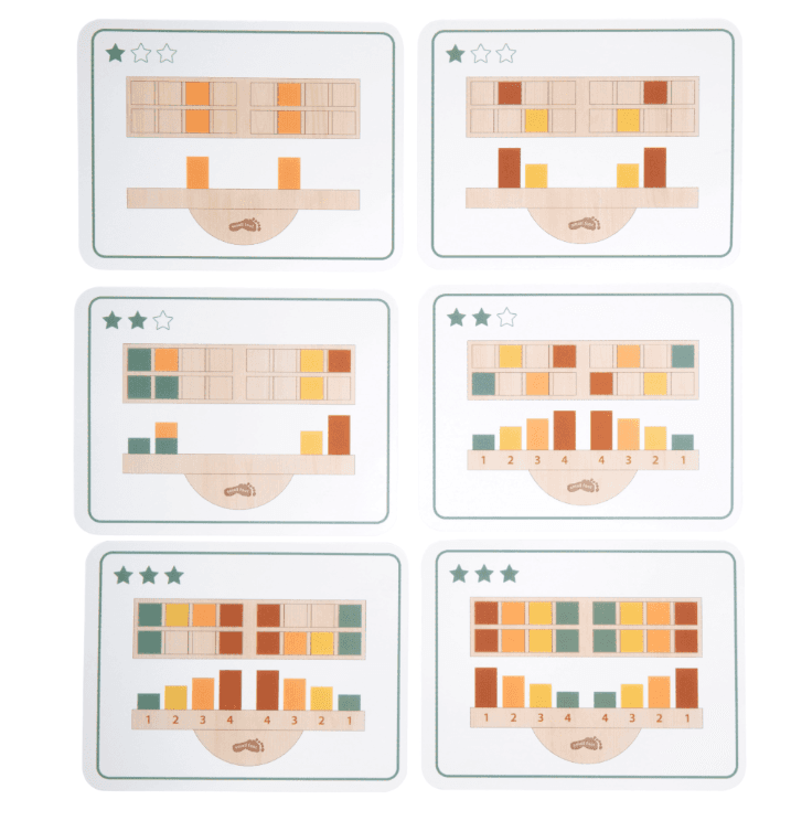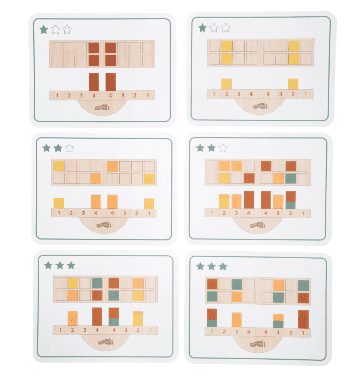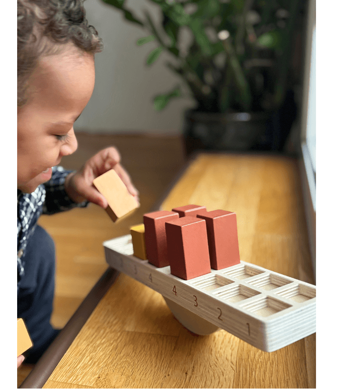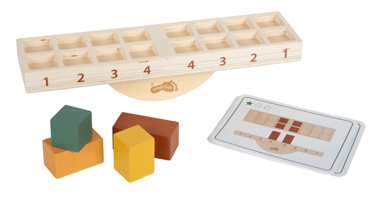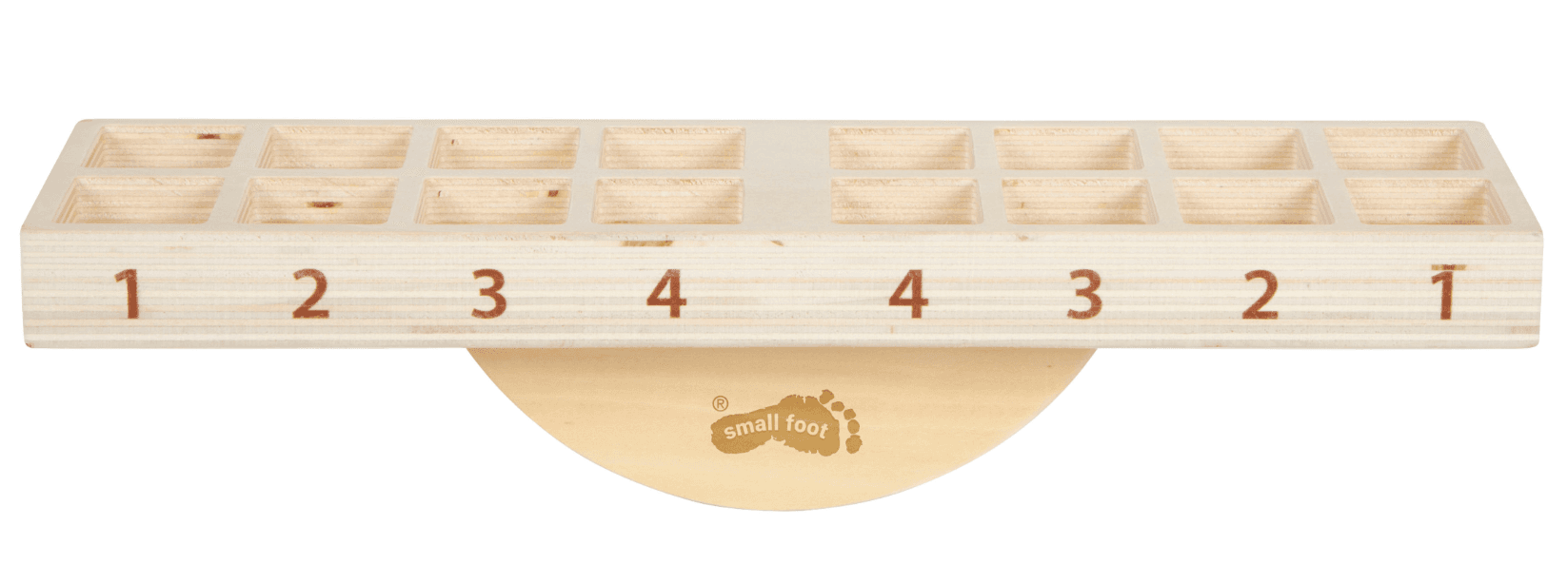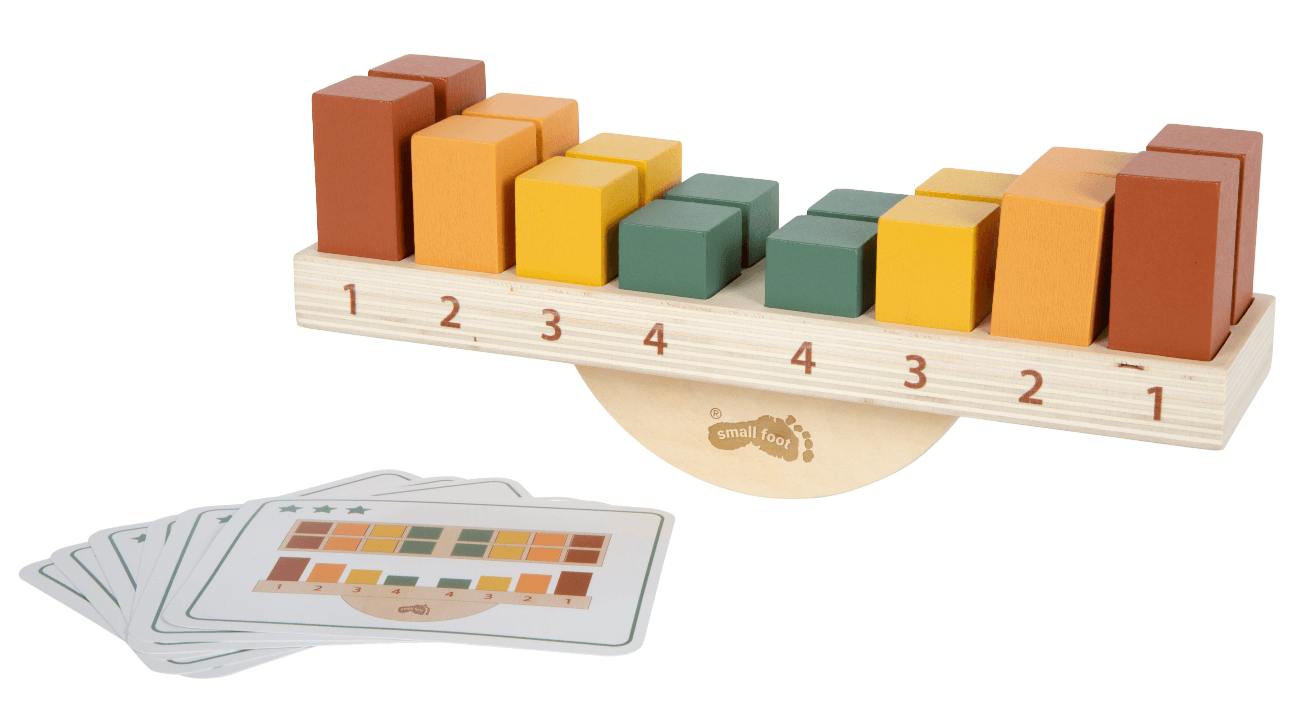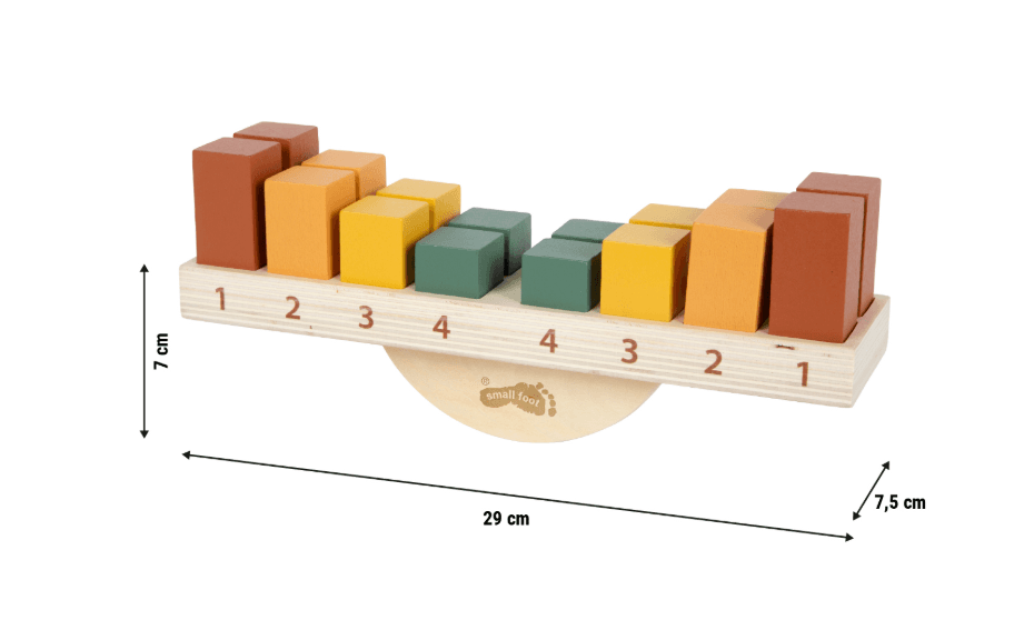 aufgedruckte Zahlen auf der Wippe helfen zusätzlich, Zusammenhänge zwischen Gewicht, Position, Hebelwirkung und Proportionen zu verstehen