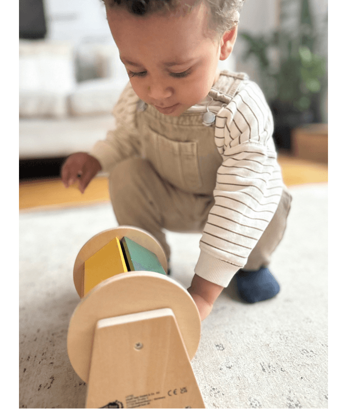 Das Regenbogenrad verbindet modernes Design mit tiefgehendem entwicklungspsychologischem Nutzen: Sie spricht visuelle, auditive und motorische Sinne an, unterstützt Gleichgewicht und Kraftentwicklung und begleitet Babys ab 6 Monaten durch verschiedene Entwicklungsphasen – vom Liegen über das Sitzen bis zum Stehen. Schon ab etwa 6 Monaten weckt das Holzdrehrad die Neugier: Babys, die auf dem Bauch liegen, stützen sich auf die Unterarme und beobachten fasziniert das bunte Drehen und das Geräusch der integrierten Holzkugel. Das visuelle Verfolgen der Bewegung und das Greifen nach der Trommel stärken Rumpf, Nacken und Gleichgewichtssinn – wichtige Entwicklungsschritte auf dem Weg zur Krabbelposition. Im Sitzen ermutigt das Drehen der Trommel mit beiden Händen zur simultanen Bewegung und kräftigt Hand-, Arm- und Schultermuskulatur. Das begleitende Klangspiel fördert die auditive Wahrnehmung und motiviert zur Wiederholung – eine langanhaltende Beschäftigung, bei der Kleinkinder den Zusammenhang von Handlung und Effekt erleben.