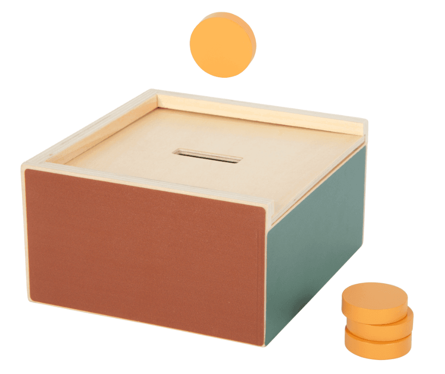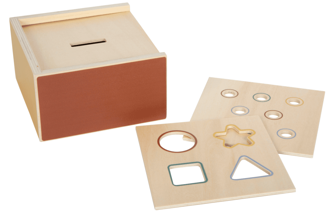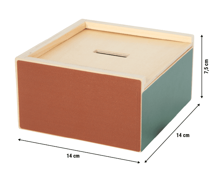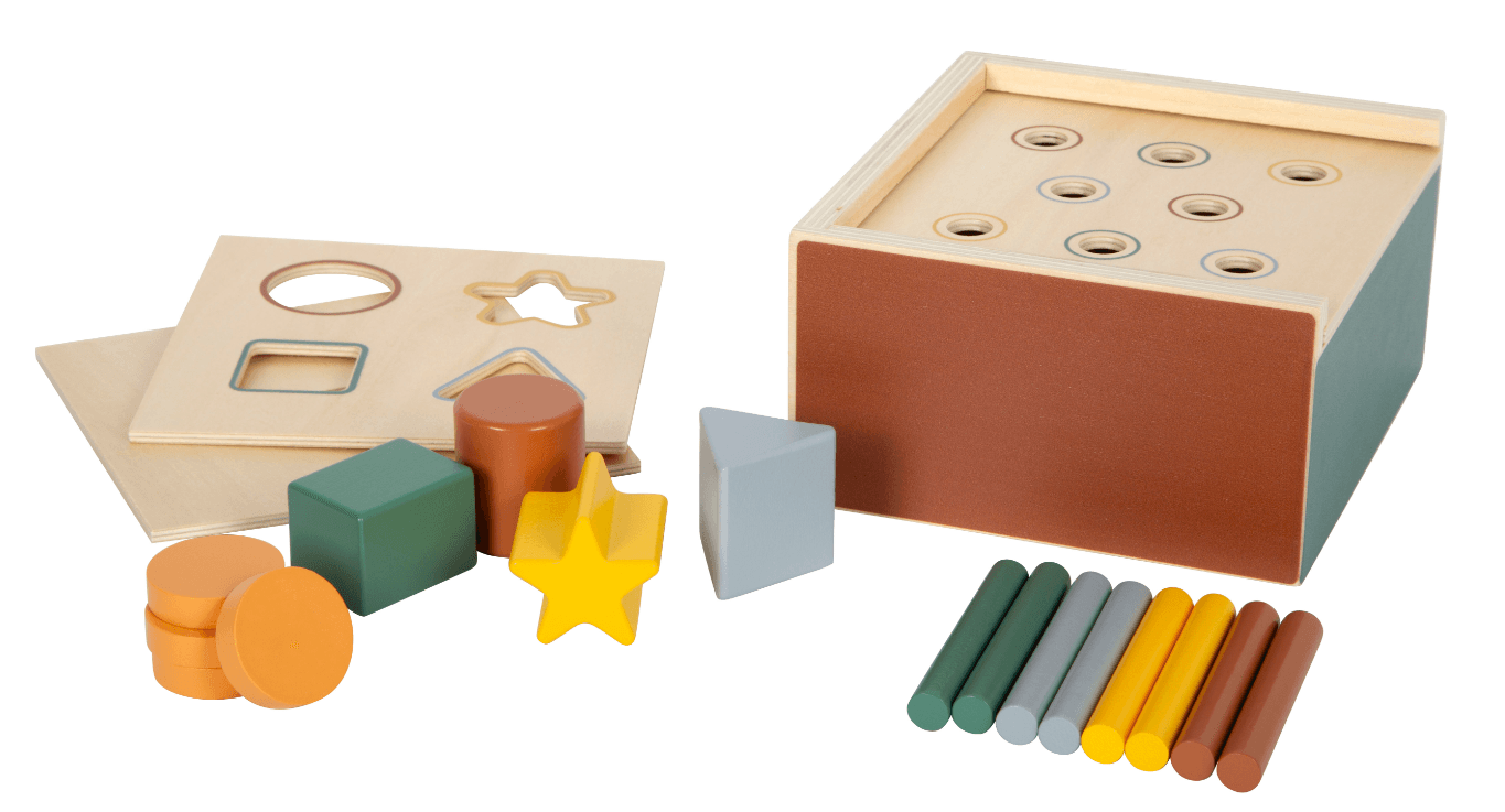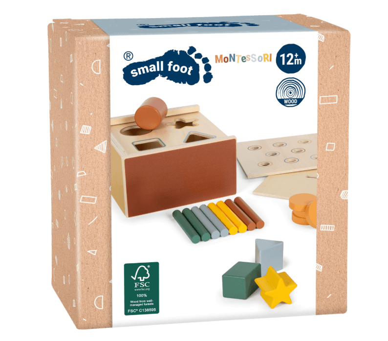 Die Sortier- und Steckbox kommt mit drei austauschbaren Deckeln und vielseitigem Steckmaterial: vier Münzen, acht Stäbe und vier Bauklötze fördern spielerisch Feinmotorik, Farb- und Formverständnis sowie Hand-Augen-Koordination. Zusätzlich lehrt die Box auf spielerische Weise das Prinzip der Objektpermanenz, indem Kinder beobachten, dass Objekte auch dann weiter existieren, wenn sie aus dem Sichtfeld verschwinden. Ideal zur Förderung der Selbstständigkeit im Sinne der Montessori-Pädagogik.