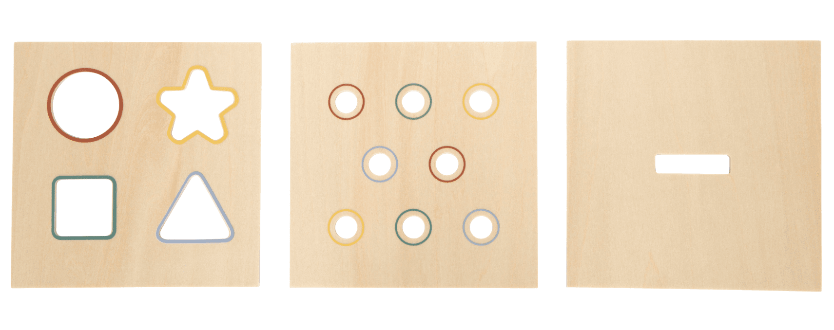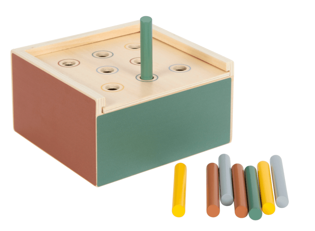 hochwertige Steckbox aus 100%-zertifiziertem Holz mit drei austauschbaren Deckeln für abwechslungsreiches Spiel