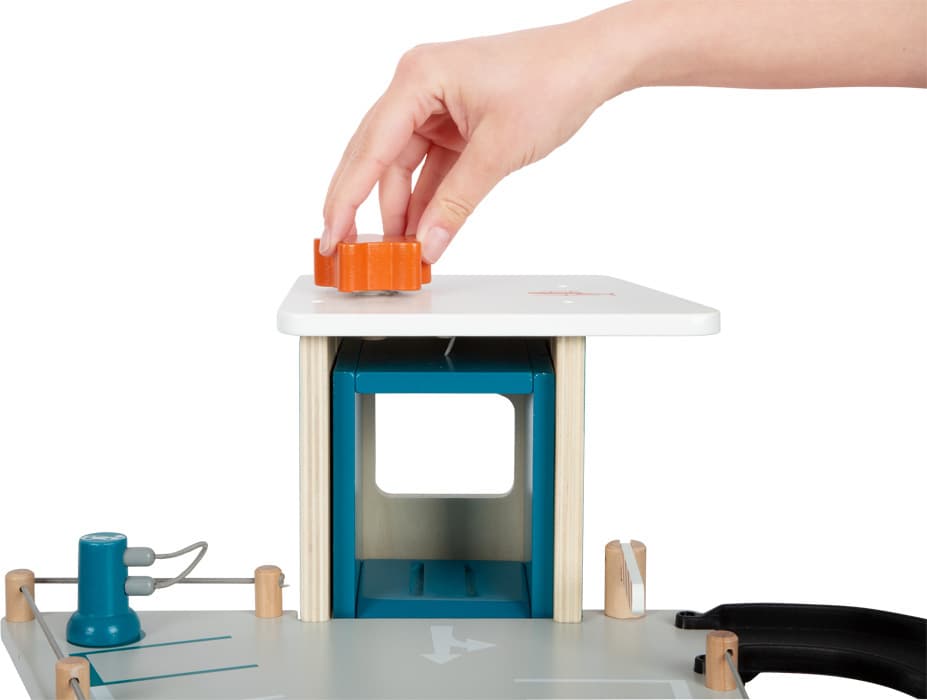 Hier geht’s rasant zu! Parken, tanken, waschen, reparieren – und dann pfeilschnell die Rampen des Parkhauses runter sausen! Die mattierte Oberfläche der Rampen sorgt für einen authentischen Asphalt-Look. Auf drei Ebenen können die beiden mitgelieferten Autos in der Garage geparkt werden, wenn sie nicht gerade an der magnetischen Benzin-Zapfsäule oder der Elektroladesäule vollgetankt werden. In der Autowerkstatt mit höhenverstellbarer Hebebühne wird nochmal alles gecheckt, bevor es für die kleinen Flitzer durch die Waschanlage mit beweglichen Walzen geht! Der Fahrstuhl zwischen den Parkhausebenen wird über ein großes Handrad bedient - ein Feststellmechanismus und Bodenrillen sorgen dafür, dass die Autos sicher nach oben gelangen. Die flexible Gummibegrenzung eignet sich als Katapult für die Autos. Mit Helikopterlandeplatz auf dem Dach des Aufzuges!Ein absolutes Muss für kleine Auto-, Parkhaus- und Parkgaragen-Liebhaber und eine Bereicherung für den Fuhrpark im Kinderzimmer! Die beiden stabilen Kunststofframpen sind so positioniert, dass von oben bis unten eine durchgängige Abfahrt möglich ist. Dabei kann der Verkehr mithilfe der klappbaren Schranken gesteuert werden. Da sind ein hoher Spielwert und langanhaltendes Spielvergnügen garantiert. Da gestalterisch auf den Einsatz von Zahlen und Schriften verzichtet wurde, lassen sich die Icons und Grafiken schon von den Kleinsten verstehen. Die einzigartige Architektur sorgt für eine offene Bespielbarkeit bei größter Stabilität.