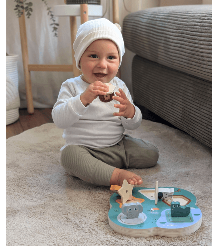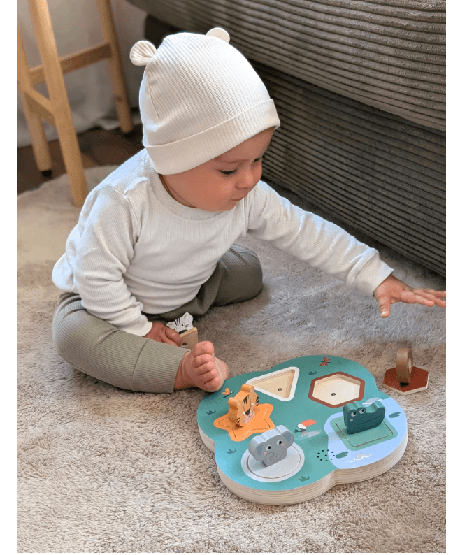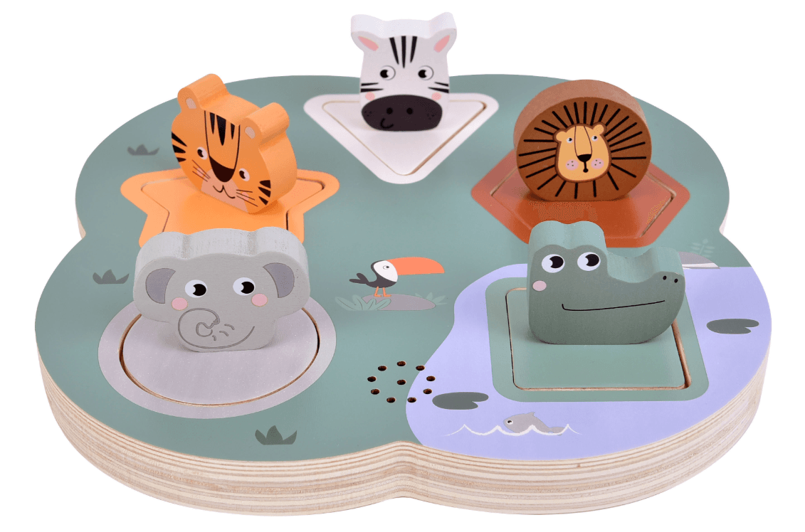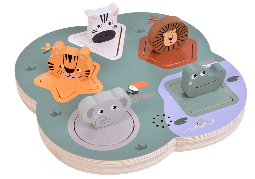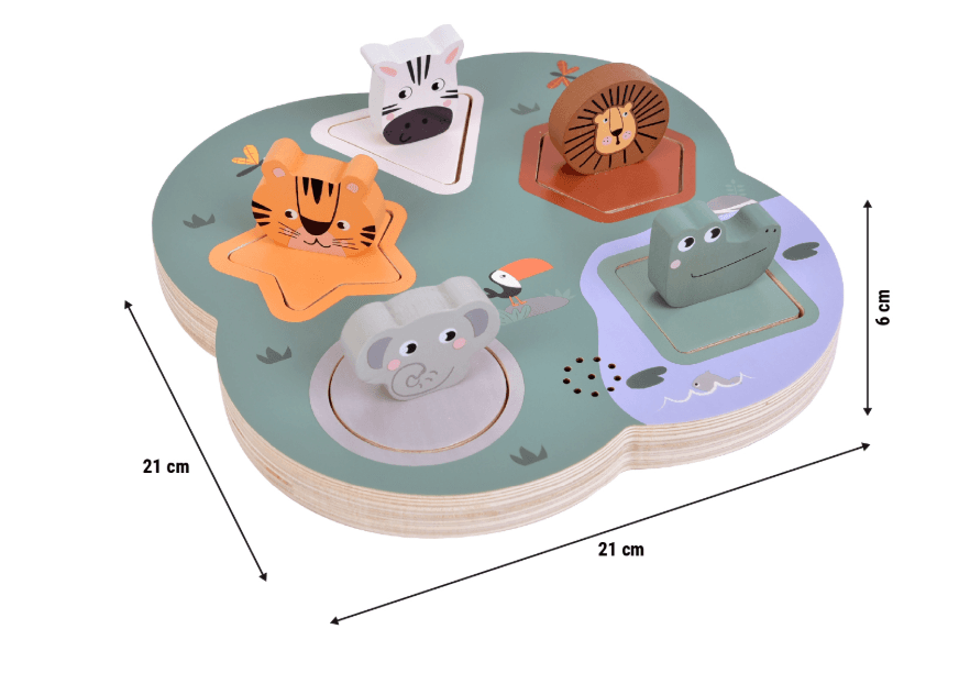 Das Setzpuzzle 3D „Safari“ bringt tierischen Lernspaß ins Kinderzimmer! Wird ein Puzzleteil platziert, erklingt der charakteristische Laut des jeweiligen Safari-Tiers. Ob der mächtige Elefant, das schnelle Zebra oder der majestätische Löwe – jedes Tier sorgt für ein akustisches Aha-Erlebnis! Gleichzeitig werden Geduld, Konzentration und Ausdauer geschult und die Hand-Augen-Koordination gefördert. Der hochwertige Druck und die moderne Farbgebung machen dieses Puzzle nicht nur zu einem pädagogischen Lernspielzeug, sondern auch zu einem dekorativen Blickfang im Kinderzimmer. Perfekt kombinierbar mit weiteren Holzspielwaren aus der beliebten „Safari“-Produktlinie – für noch mehr Spiel- und Lernspaß!