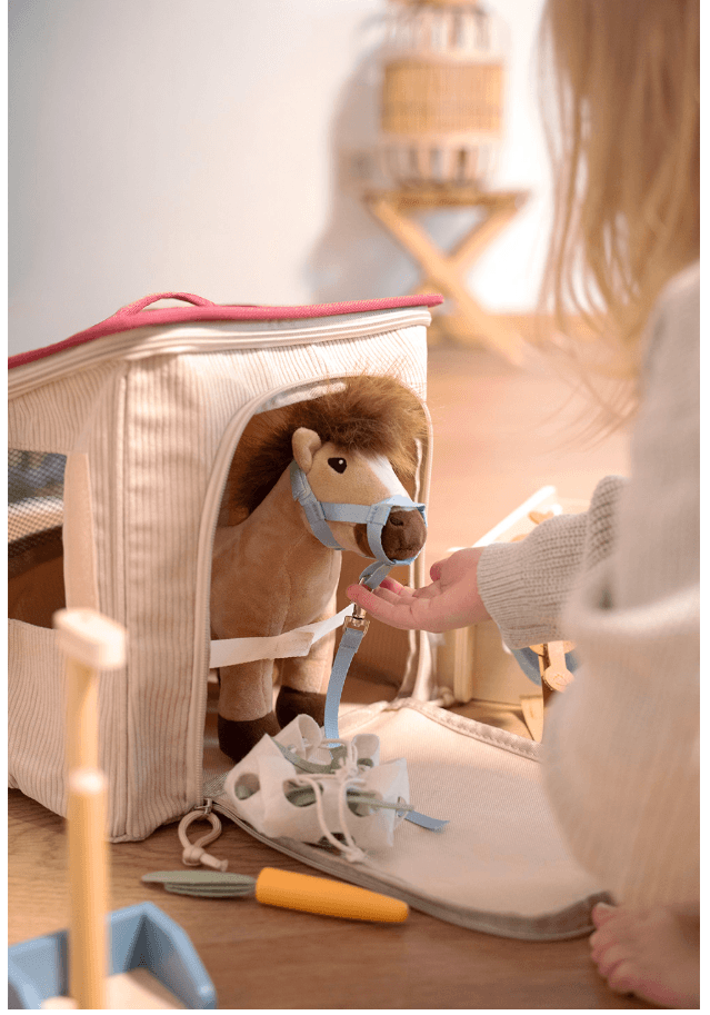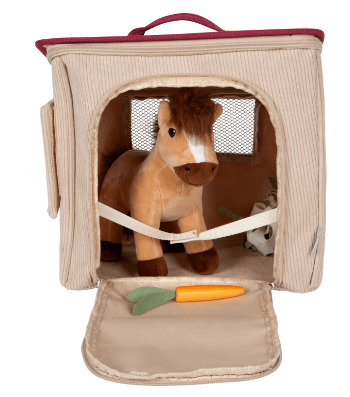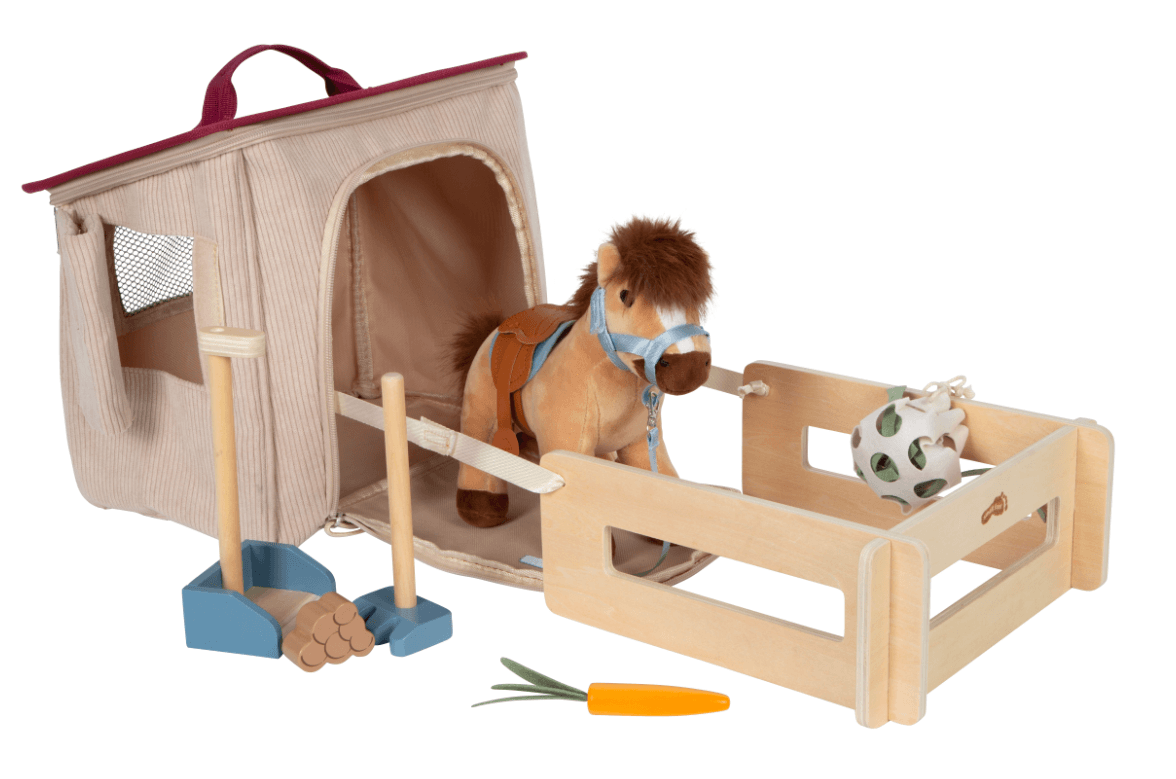 Pferde-Spielset mit Plüschpferd, Stall und vielfältigem Zubehör in einer Tasche
