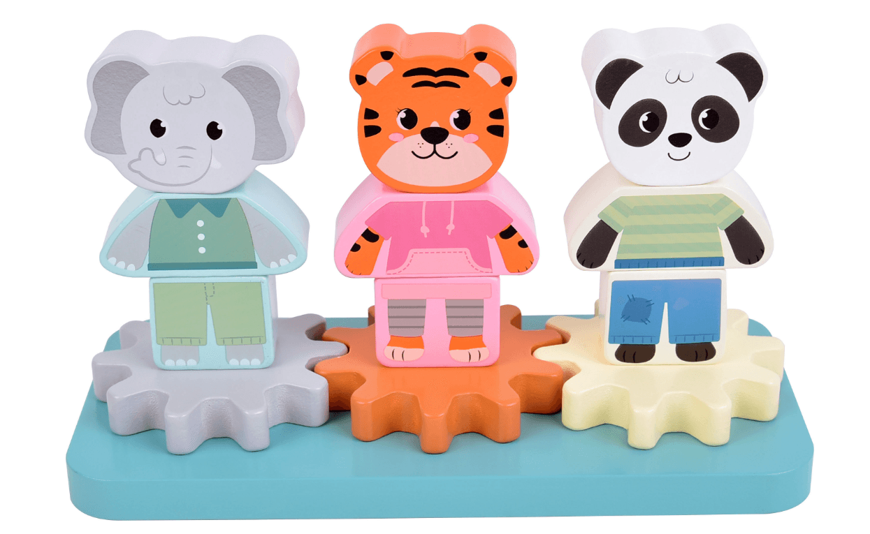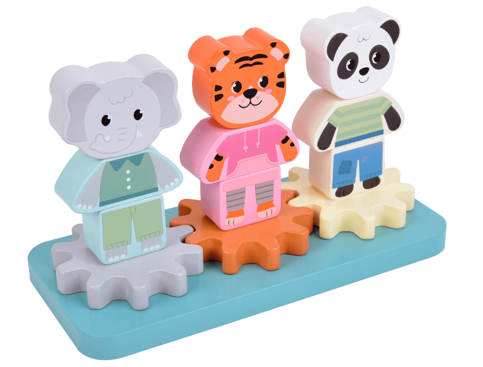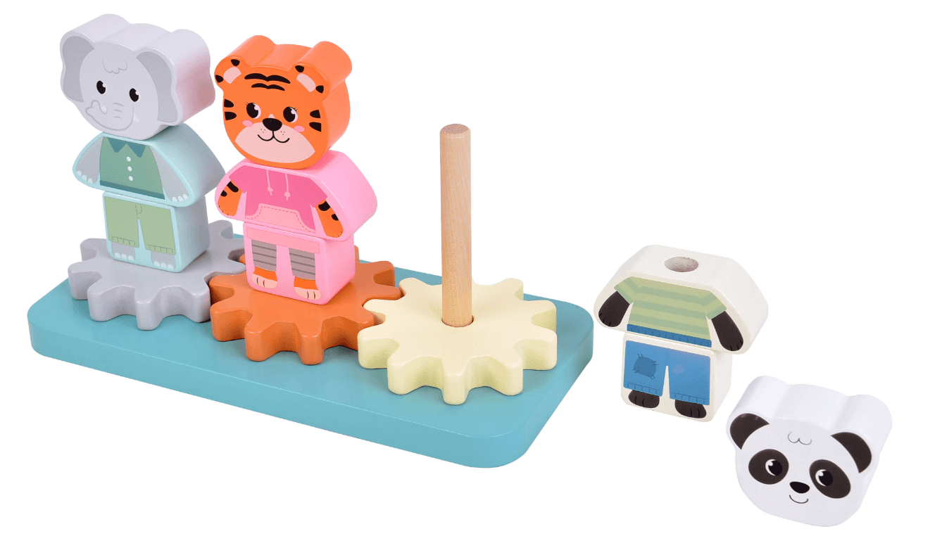 liebevoll gestaltetes Stapelspiel aus Holz mit drei Tierfiguren: Elefant, Tiger und Panda