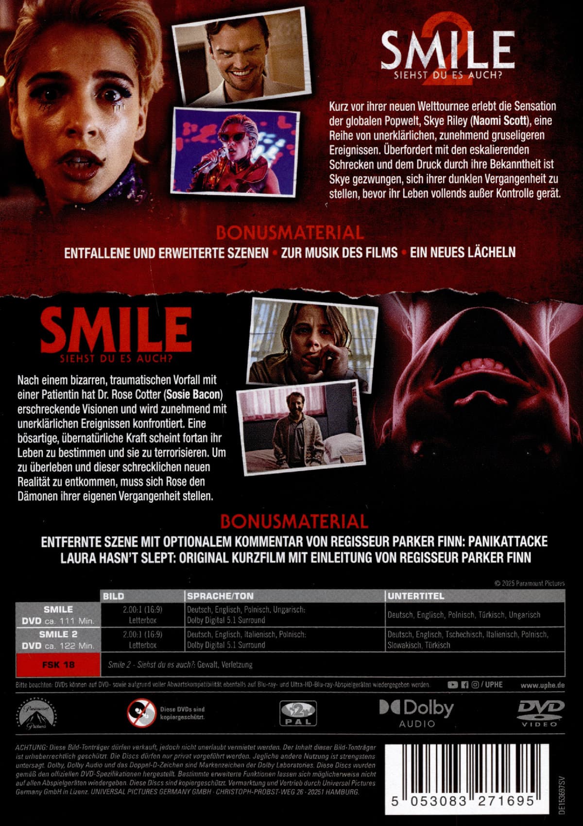 Diese Collection enthält 2 Filme: "Smile - Siehst du es auch?" & "Smile 2 - Siehst du es auch?"Smile - Siehst du es auch?Nach einem bizarren, traumatischen Vorfall mit einer Patientin hat Dr. Rose Cotter (Sosie Bacon) erschreckende Visionen und wird zunehmend mit unerklärlichen Ereignissen konfrontiert. Eine bösartige, übernatürliche Kraft scheint fortan ihr Leben zu bestimmen und sie zu terrorisieren. Um zu überleben und dieser schrecklichen neuen Realität zu entkommen, muss sich Rose den Dämonen ihrer eigenen Vergangenheit stellen.Smile 2 - Siehst du es auch?Kurz vor ihrer neuen Welttournee erlebt die Sensation der globalen Popwelt, Skye Riley (Naomi Scott), eine Reihe zunehmend beängstigender und unerklärlicher Ereignisse. Überfordert mit den eskalierenden Schrecken und dem Druck durch ihre Bekanntheit ist Skye gezwungen, sich ihrer dunklen Vergangenheit zu stellen, bevor ihr Leben vollends außer Kontrolle gerät.