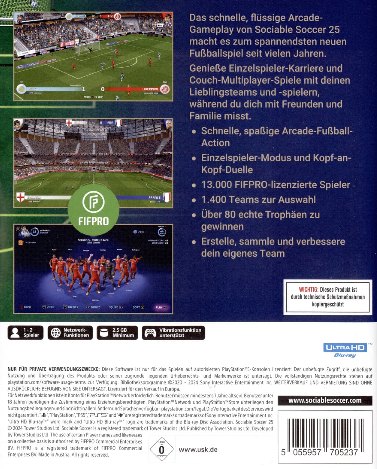 Sociable Soccer 24 ist das aufregende, plattformübergreifende Arcade-Fußballspiel, das den Nervenkitzel des Fußballs auf Konsole bringt. Entwickelt von Jon Hare, dem Schöpfer von Sensible Soccer, hat dieser ehemalige Nr. 1-Titel auf Apple Arcade dank des rasanten Arcade-Stils und des intuitiven Gameplays, das durch Multiplayer-Kopf-an-Kopf-Matches und sammelbare Spielerkarten bereichert wird, weltweit eine riesige Fangemeinde gewonnen.