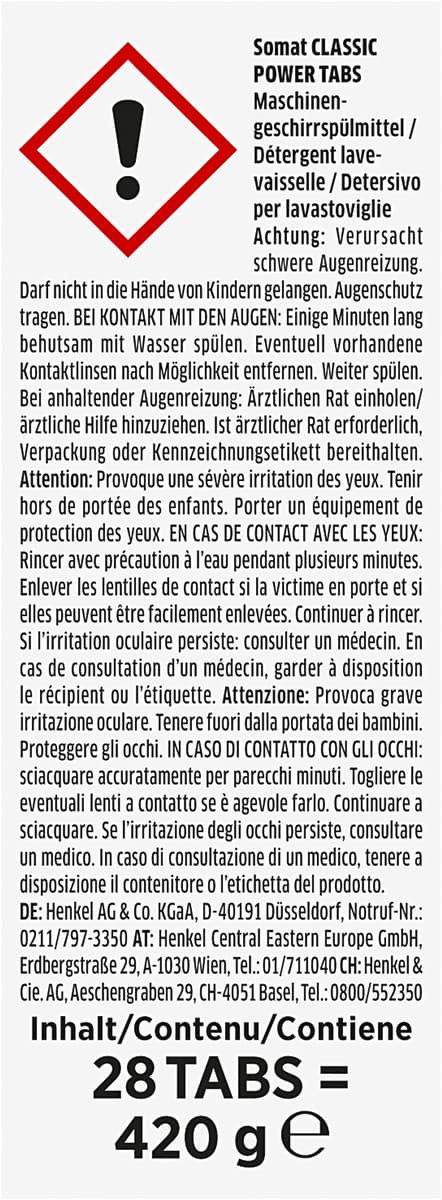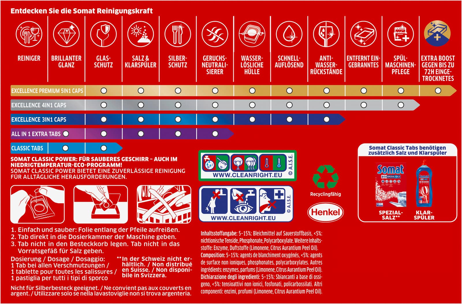 Somat Classic Power Spül Tabs – täglich sauberes Geschirr, auch im Niedrigtemperatur-, Eco- oder Kurz-Programm! Programm wechseln und sparen: Die Somat Classic Power Tabs wurden für Kurz-, Eco-Programme & niedrige Temperaturen entwickelt, um Wasser und bis zu 20 % Energie zu sparen – Kein Vordosieren, Einweichen oder Nachbehandeln! Die Tabs für die Spülmaschine eignen sich ideal für die tägliche kraftvolle Reinigung von Geschirr – Für brillante Reinigungsergebnisse bei alltäglichen Herausforderungen. Außerdem schützt die Formel des Geschirrspülmittels Ihre Gläser vor Glaskorrosion und sorgt für brillanten Glanz. Die Geschirrreiniger Tabs eignen sich für jede Art von spülmaschinenfestem Geschirr und Besteck, inklusive Gläser, Tassen, Töpfe, Pfannen & (Baby-) Flaschen*.Somat setzt sich zudem für eine saubere Welt ein: Unser Werk wird mit 100 % erneuerbarem Strom betrieben, und unsere Produktion verursacht keinerlei Abfall auf der Mülldeponie. Die Somat Spülmaschinentabs sind speziell für kurze Spülgänge und Eco-Programme bei niedrigen Temperaturen entwickelt. Wechseln Sie das Programm und sparen Sie Wasser und bis zu 20 % Energie** mit Somat! Die Produktvorteile im Detail: Effektive Reinigung auch im Eco-Programm & bei niedrigen Temperaturen Ideal für die tägliche Reinigung Brillanter Glanz Glasschutz *Nicht für Silberbesteck geeignet ** Wie können Sie mit Somat Wasser und Energie sparen? Für leicht verschmutztes Geschirr wählen Sie bitte das Niedrigtemperatur-Kurz-Programm. Für normal verschmutztes Geschirr wählen Sie bitte das Niedrigtemperatur-Eco-Programm. Vermeiden Sie Programme wie „Intensiv“, „Extra-Trocken“ oder besondere Zusatzoptionen zur Verkürzung des Spülprogramms, da diese zu höherem Wasser- und/oder Energieverbrauch führen. Wenn Sie zu einem Niedrigtemperatur Eco- oder Kurz-Programm wechseln, können Sie Wasser und bis zu 20 % Energie sparen und erhalten mit Somat gleichzeitig strahlend sauberes Geschirr. Dosierung: 1 Tab bei allen Verschmutzungen Anwendung: Folie entlang der Pfeile aufreißen. Tab direkt in die Dosierkammer der Maschine legen. Tab nicht in den Besteckkorb legen und nicht in das Vorratsgefäß für Salz füllen. Die Marke Somat Seit über 50 Jahren steht Somat für innovative Produkte rund um Ihre Geschirrspülmaschine. Seit Einführung des ersten Reinigers für automatische Geschirrspülmaschinen im Jahre 1962 in Deutschland haben wir unsere Produkte ständig weiterentwickelt und neue Standards gesetzt. Deshalb können Sie heute und in Zukunft sicher sein, dass Ihr Geschirr stets strahlend sauber und glänzend wird. Somat, seit über 4 Jahrzehnten Sauberkeit mit Glanzgarantie.