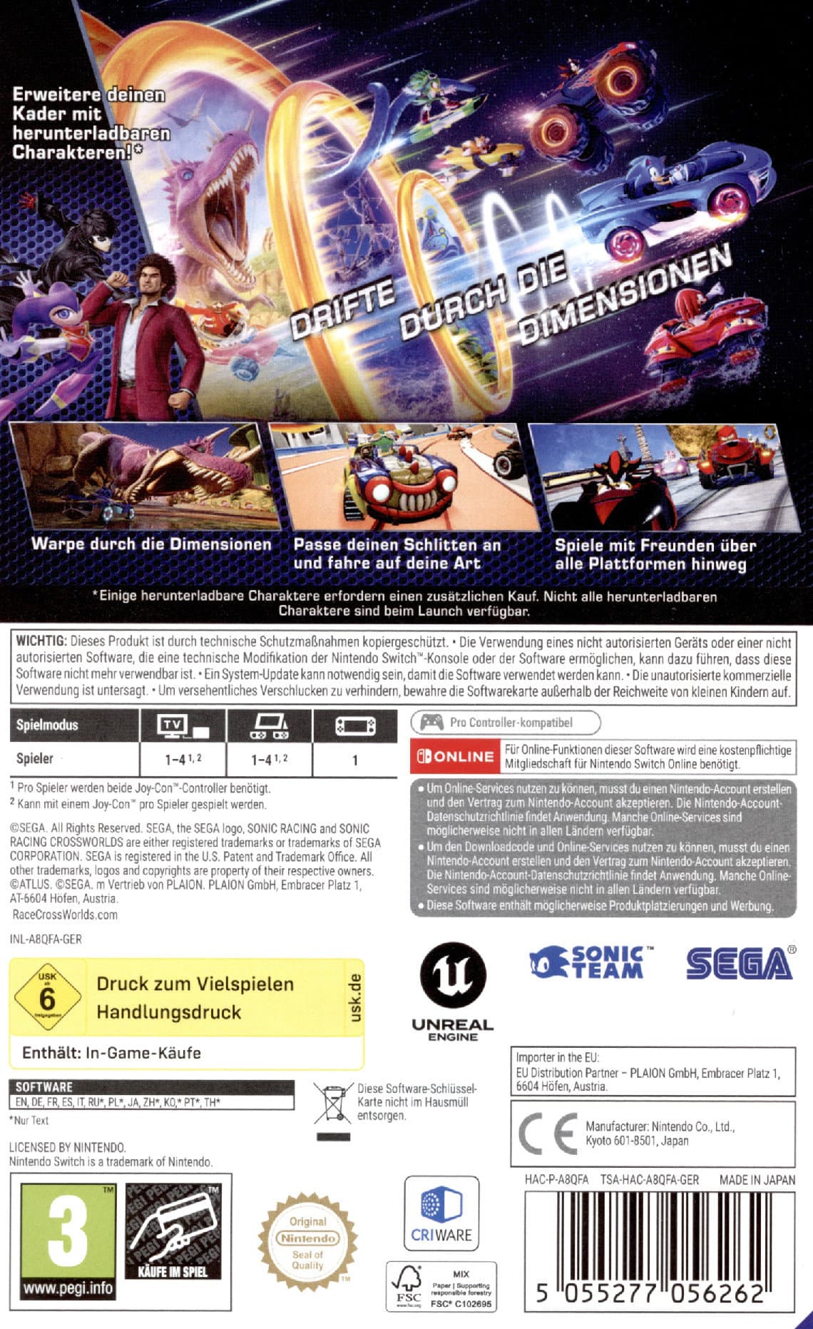 Drifte durch die Dimensionen! Rase in Sonic Racing: CrossWorlds durch Land, Meer, Luft, Raum und Zeit! Warpe durch Reiseringe in neue Dimensionen, in denen hinter jeder Kurve etwas Neues wartet. Brause allein oder im Team in einer Vielzahl von Offline- und Online-Modi zum Sieg und tritt gegen Spieler aus aller Welt an. Baue die ultimative Maschine für deinen Rennstil, schalte Gadgets frei, um die Oberhand zu gewinnen, und erringe mit deinen Power-Ups den Sieg! Auf die Plätze, fertig, Warp! Rase über 24 Strecken und warpe mit Reiseringen in 15 CrossWorlds - eine einzigartige Gameplay-Mechanik, die die bekannten Charaktere aus dem Universum von Sonic und SEGA in neue Dimensionen transportiert! Nutze die Unberechenbarkeit zu deinem Vorteil, indem du die Umgebung der Rennen veränderst! Fahre mit den Besten! Wähle aus 23 bekannten Sonic-Charakteren, der größten Auswahl aller Sonic-Rennspiele! Ganz nach deinem Geschmack Kombiniere 45 einzigartige Originalmaschinen und 70 verschiedene Gadgets, um dein Fahrzeug zu verbessern, deinen Kart aufzuleveln und die ultimative Maschine zu kreieren, die deinem Rennstil entspricht. Gewinne mit Power-Ups die Oberhand! Bezwinge deine Gegner mit 23 verschiedenen Power-Ups, darunter altbekannte Lieblinge und brandneue Gegenstände wie der Monstertruck! Mehrere Spielmöglichkeiten Spiele mit Freunden im lokalen Splitscreen-Modus oder tritt online mit bis zu 12 Spielern gegen eine globale Community in den Modi "Grand Prix", "Rennpark" und "Gegen die Zeit" an. Spiel komplett in Deutsch! In der Erstauflage ist zusätzlich zum Spiel der spielbare Charakter "Werigel", das Werigel-Fahrzeug "Beast Spike" (kostenloser DLC bei Neukauf enthalten, einmalig verwendbar) und der Werigel-Aufkleber.