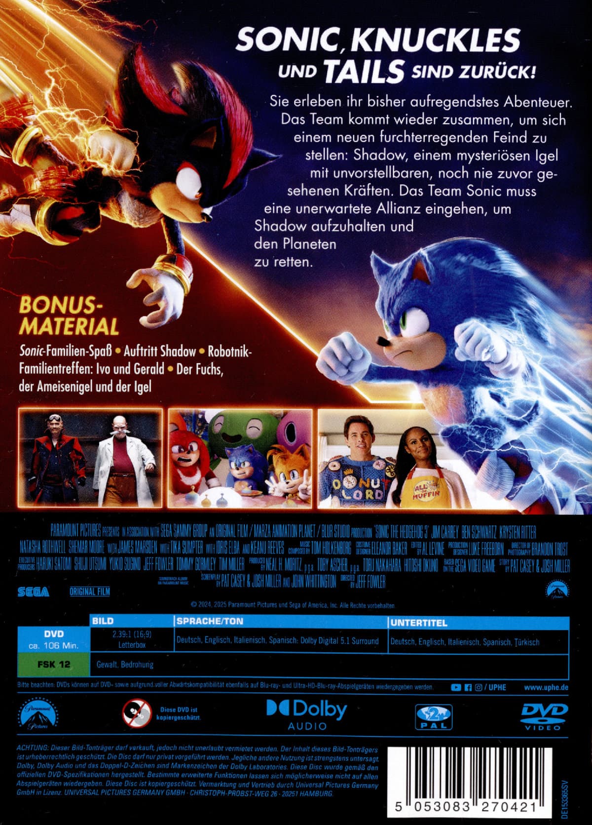| Zusatzinfos / Bonusmaterial beim Film dabei | "Sonic"-Familien-Spaß,Auftritt Shadow,Robotnik-Familientreffen: Ivo und Gerald,Der Fuchs, der Ameisenigel und der Igel |