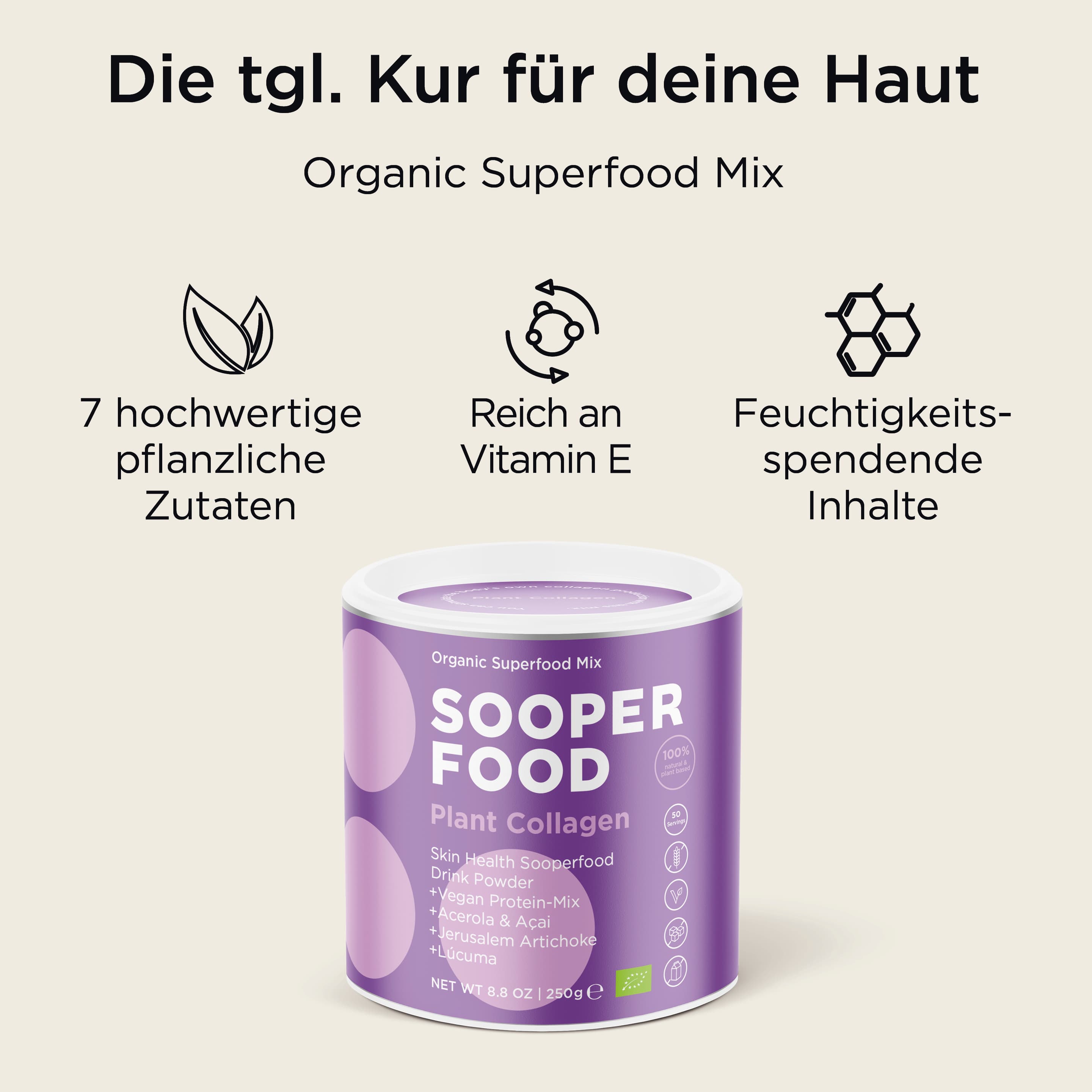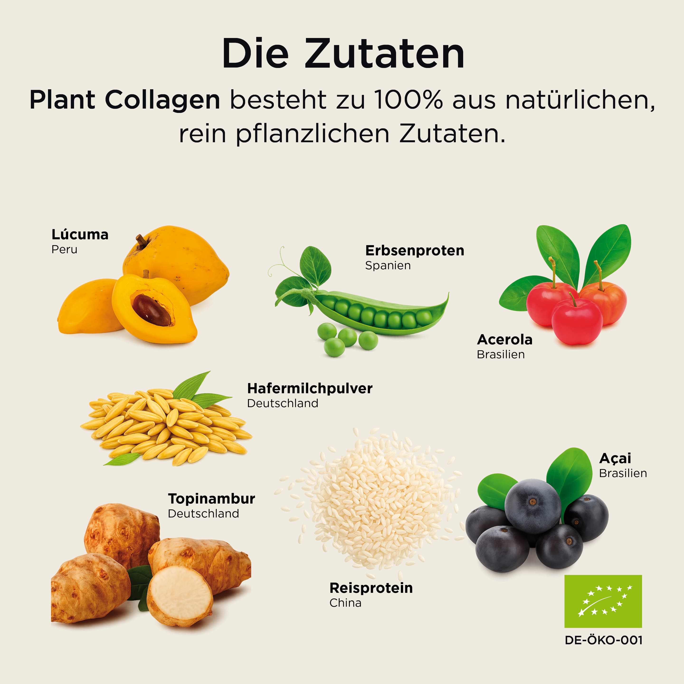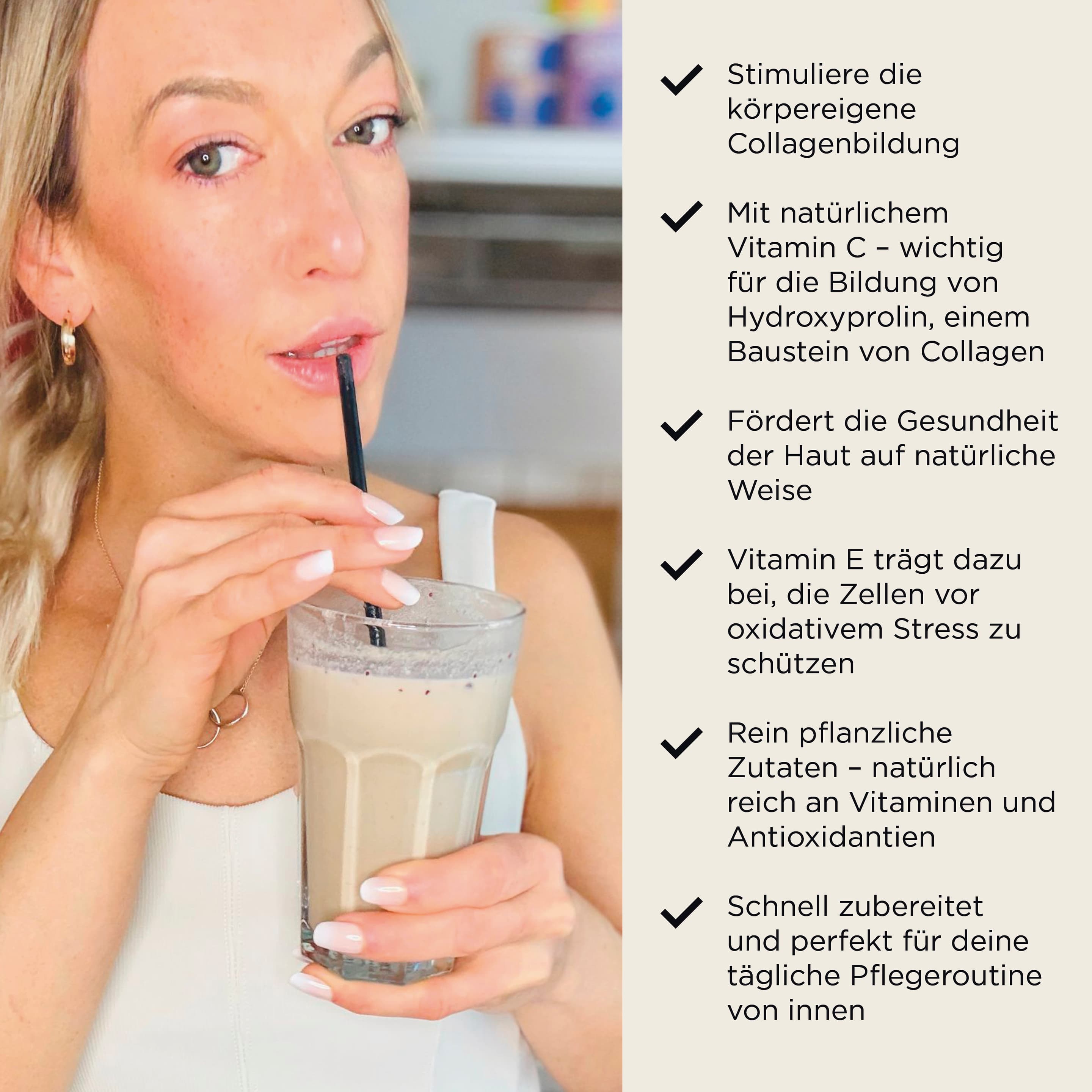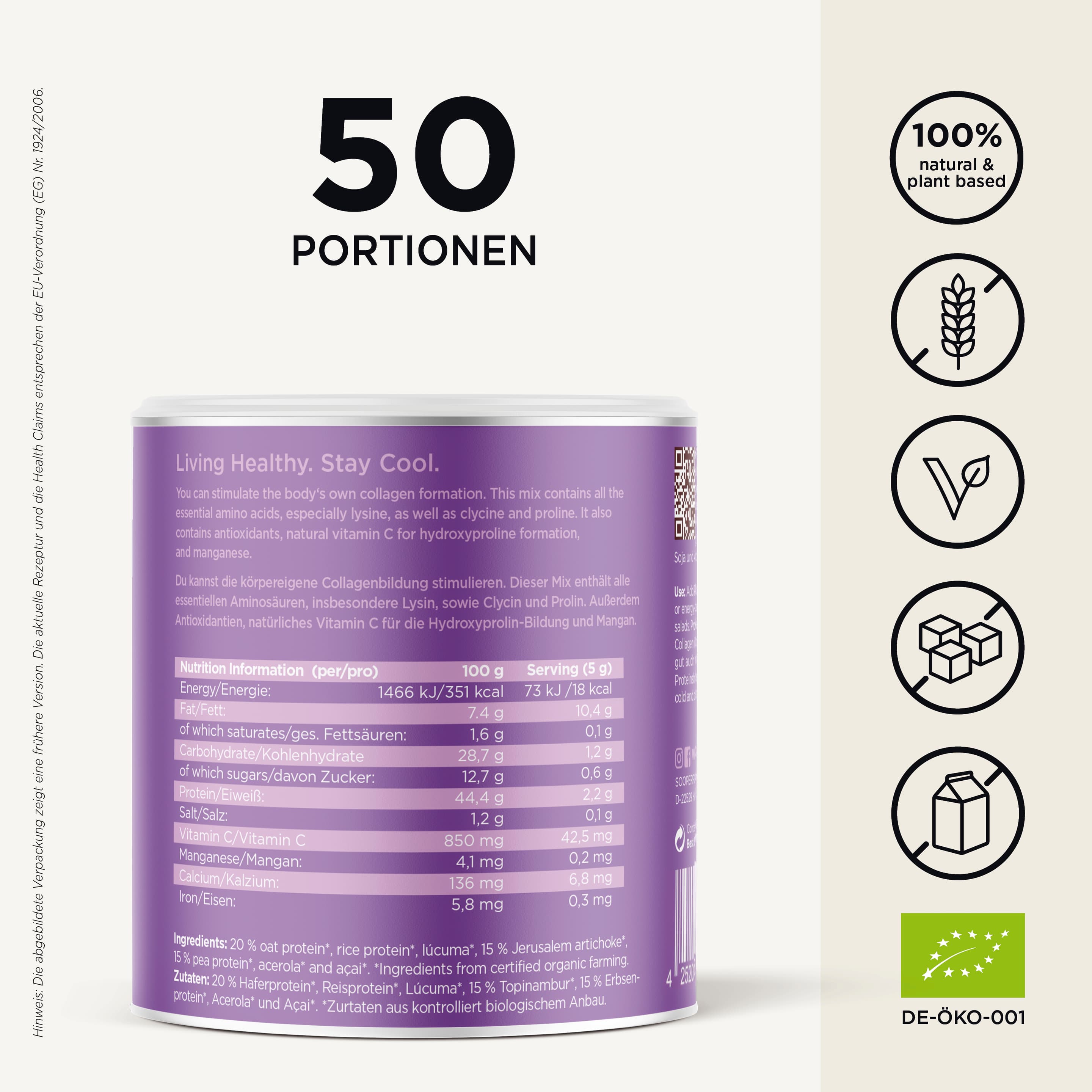 Dieser Mix unterstützt die körpereigene Collagenbildung mit natürlichem Vitamin C aus Acerola. Er enthält alle essenziellen Aminosäuren, insbesondere Lysin, sowie Glycin und Prolin, die Bausteine von Collagen. Dazu liefert er Mangan für normales Bindegewebe und Antioxidantien aus Lucumá und Açai.