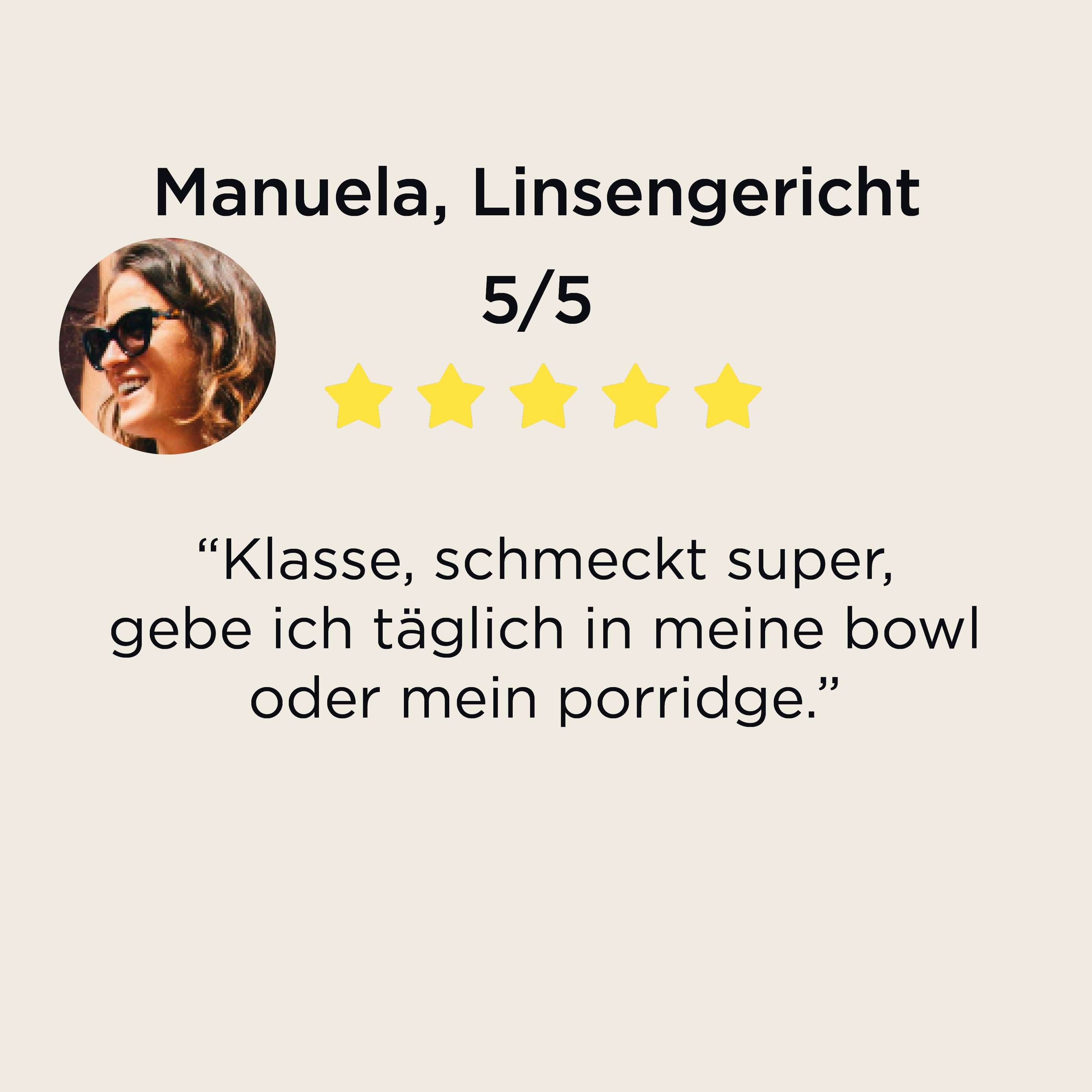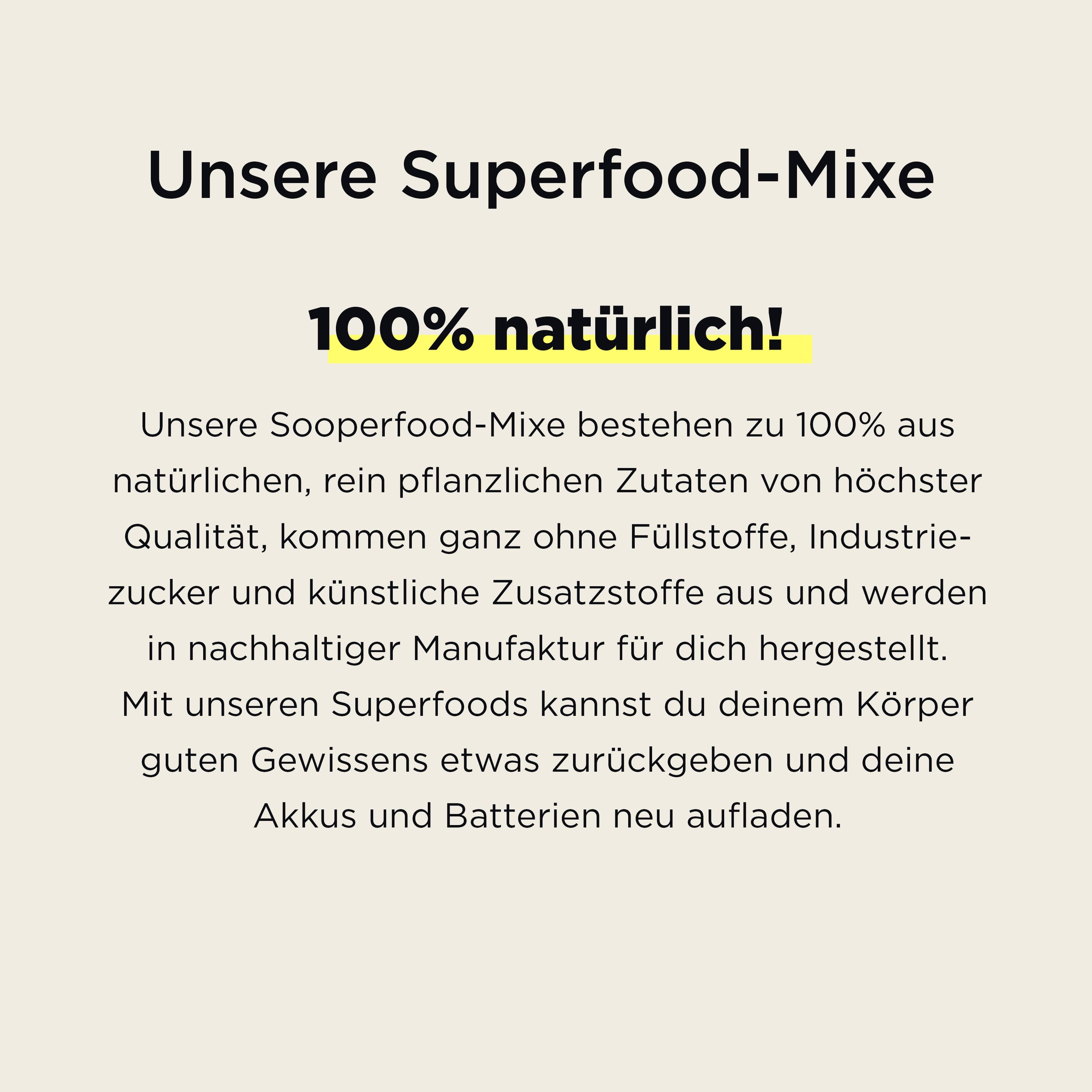 | Zubereitungshinweis | Gib das Pulver 1-2 Mal täglich in (Pflanzen-)Milch, Säfte, Smoothies oder Joghurt. Proteinshakes gehen auch super! Ohne Zuckerzusatz! Du bestimmst selbst, wie intensiv dein Mix schmecken soll. |