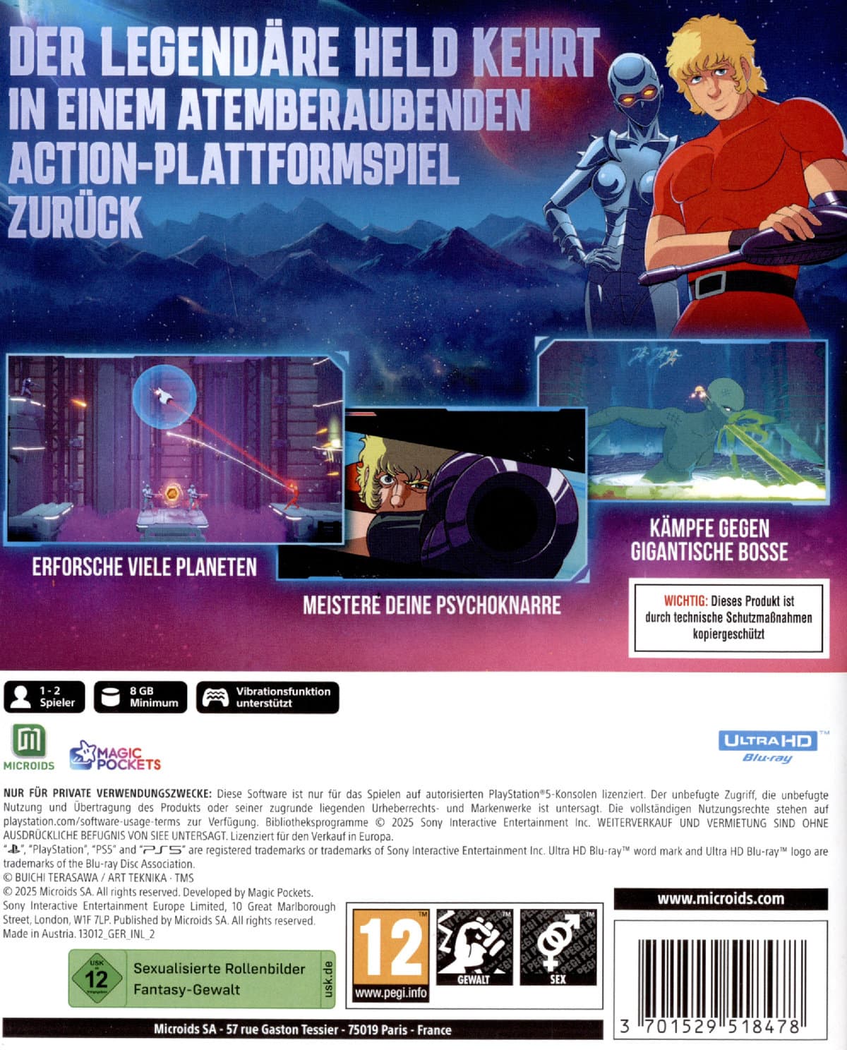DER LEGENDÄRE HELD KEHRT IN EINEM ATEMBERAUBENDEN ACTION-PLATTFORMSPIEL ZURÜCK Schlüpfe in diesem Action-Plattformer in die Rolle von Weltraumpirat Cobra. An der Seite von Lady Armaroid, deiner treuen Partnerin, und ausgerüstet mit deiner kultigen Psychoknarre musst du ein Geheimnis ergründen, das das gesamte Universum gefährdet. Reise von Planet zu Planet, um drei enigmatische Schwestern zu retten, deren Schicksal mit dem sagenhaften Schatz verwoben ist, nach dem die gefürchtete Weltraumpiratengilde sucht. Setze Cobras Waffen und Gadgets auf clevere Weise ein, um deine Gegner zu besiegen und die Level voller Hindernisse und Fallen zu meistern, die selbst für unseren Weltraumhalunken eine Herausforderung darstellen. EIN CROSSOVER AUS ACTION-SPIEL UND PLATTFORMER Statte einer Vielzahl von exotischen Planeten einen Besuch ab - alle gespickt mit Fallen, die dein Können auf die Probe stellen werden. Mit Cobras übermenschlichen Fähigkeiten musst du pausenlos laufen, springen, klettern und alle Mittel nutzen, die dir zur Verfügung stehen, um deine Gegner zur Stecke zu bringen. BIS AN DIE ZÄHNE BEWAFFNET Meistere Cobras ikonische Waffen, wie die coole Psychoknarre und den Colt Python 77, sowie seine berühmtberüchtigten Gadgets wie die Zigarre und den Greifhaken, um die Gegner auf deinen Fersen auszuschalten. Du wirst alles in deinem Arsenal brauchen, um die mächtigen Bosse, die dir den Weg versperren, zu besiegen. SOLO- UND MULTIPLAYER-MODI Erlebe den Storymodus auf 3 Schwierigkeitsstufen. Genre-Veteranen können so ihre Fähigkeiten auf die Probe stellen, während alle, die einfach nur die Geschichte geniessen wollen, dies ohne Herausforderung tun können. Im 2-Spieler-Ko-op-Modus könnt ihr auch gemeinsam versuchen, euren Gegnern zu entkommen. EINE SPANNENDE SF-WELT Tauche ein in ein fantastisches Weltraumepos und stürze dich als furchtloser, charismatischer Held ins Abenteuer. Im Laufe dieser epischen Reise begegnest du schillernden Figuren wie den Royal-Schwestern und dem schrecklichen Crystal Bowie - Cobras Erzfeind. EINE ORIGINALGETREUE ADAPTION Space Adventure Cobra - The Awakening ist die erste Videospieladaption von Cobra auf modernen Plattformen. Das Spiel umfasst die ersten 12 Episoden der berühmten Anime-Serie und bleibt dabei mit den Momenten des Muts und des Humors, die sie so besonders gemacht haben, ihrem Geist treu. Spiel in Englisch