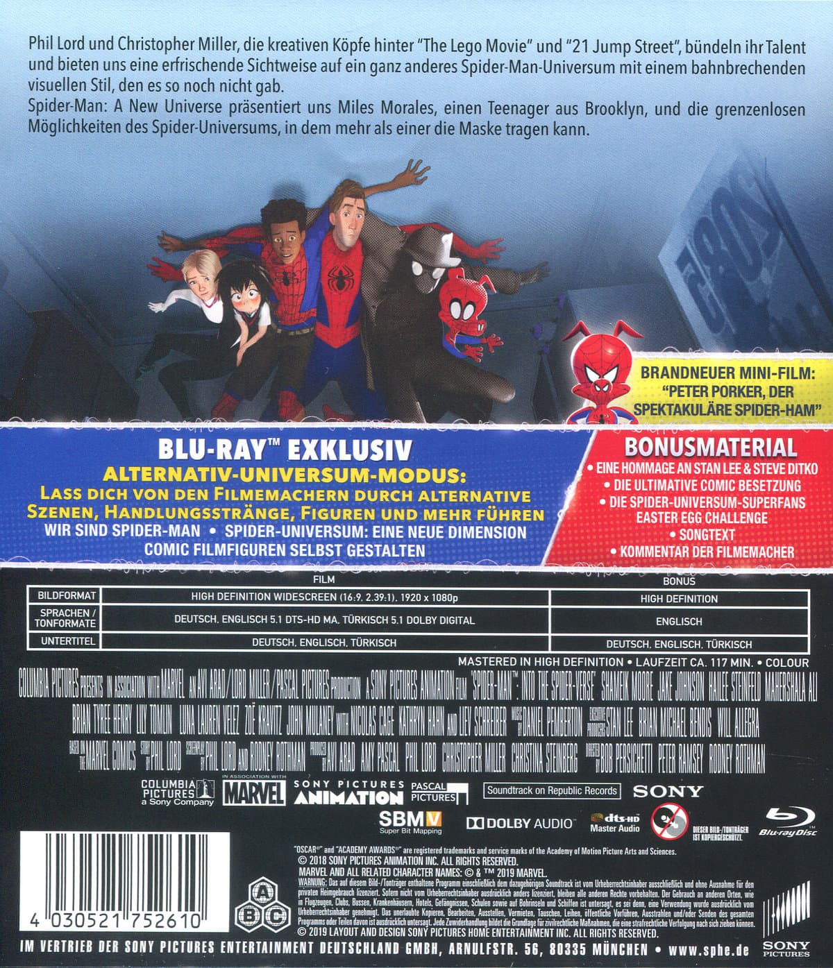 Zusatzinfos / Bonusmaterial beim Film dabeiEine Hommage an Stan Lee & Steve Ditko; Die Ultimative Comic Besetzung; Die Spider-Universum-Superfans Easter Egg Challenge; Songtext; Kommentar der Filmemacher; Alternativ-Universum-Modus;