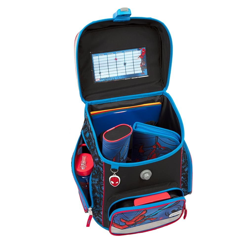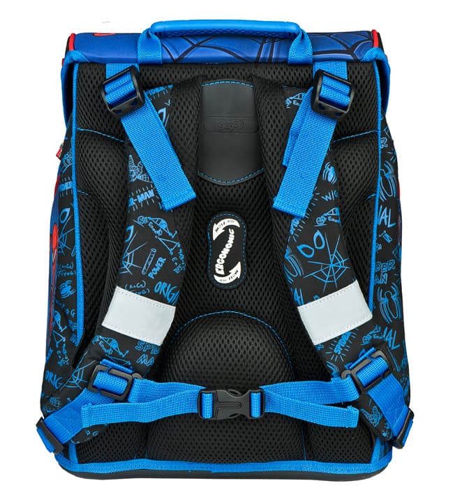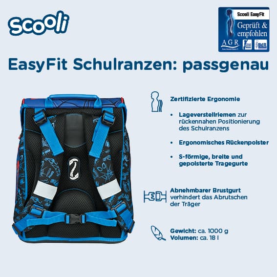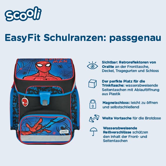 Der EasyFit Spider-Man Schulranzen von Scooli ist für seine individuelle Anpassbarkeit an die Anatomie des Kindes mit dem Prüfsiegel "Ergonomisches Produkt" des Instituts für Gesundheit und Ergonomie e.V. ausgezeichnet. Sein geringes Gewicht (nur ca. 1.000 g bei ca. 18 Liter) und sein ergonomisches Rückenpolster sorgen für super Tragekomfort. Mit dem abnehmbaren Brustgurt und den Lageverstellriemen wird das Gewicht rückenschonend getragen. Die Oralite Reflektoren des EasyFit Schulranzen garantieren gute Sichtbarkeit im Straßenverkehr. Das 5-teilige Schulranzen Set besteht aus einem EasyFit Schulranzen, einem befülltem Schüleretui mit hochwertigen Buntstiften von Eberhard-Faber, einem Turnbeutel, einem Schlamperetui und einem abnehmbaren Schlüsselanhänger. Mit ihrem heldenhaften Avengers Design mit Ironman, Captain America und Hulk ist diese Schultasche die perfekte Wahl für alle Jungen.
