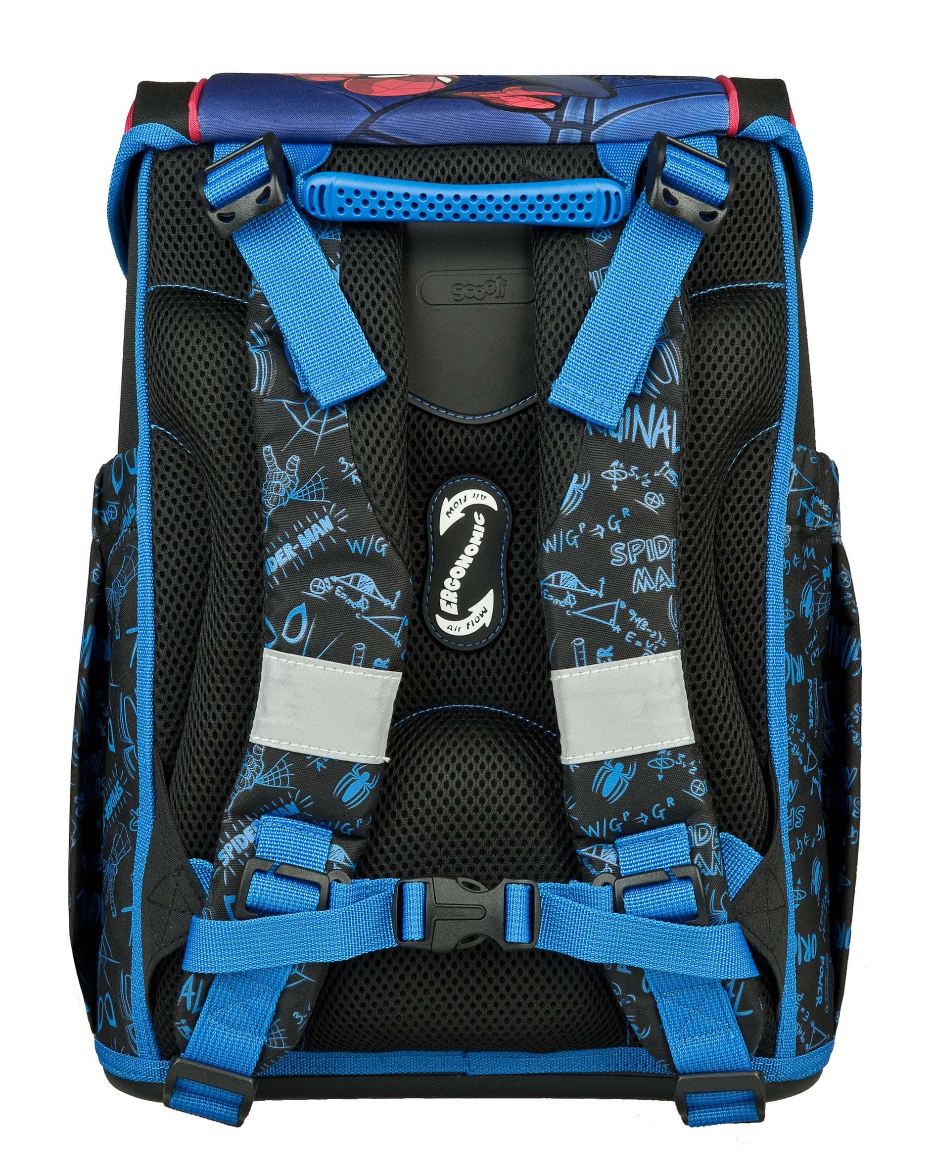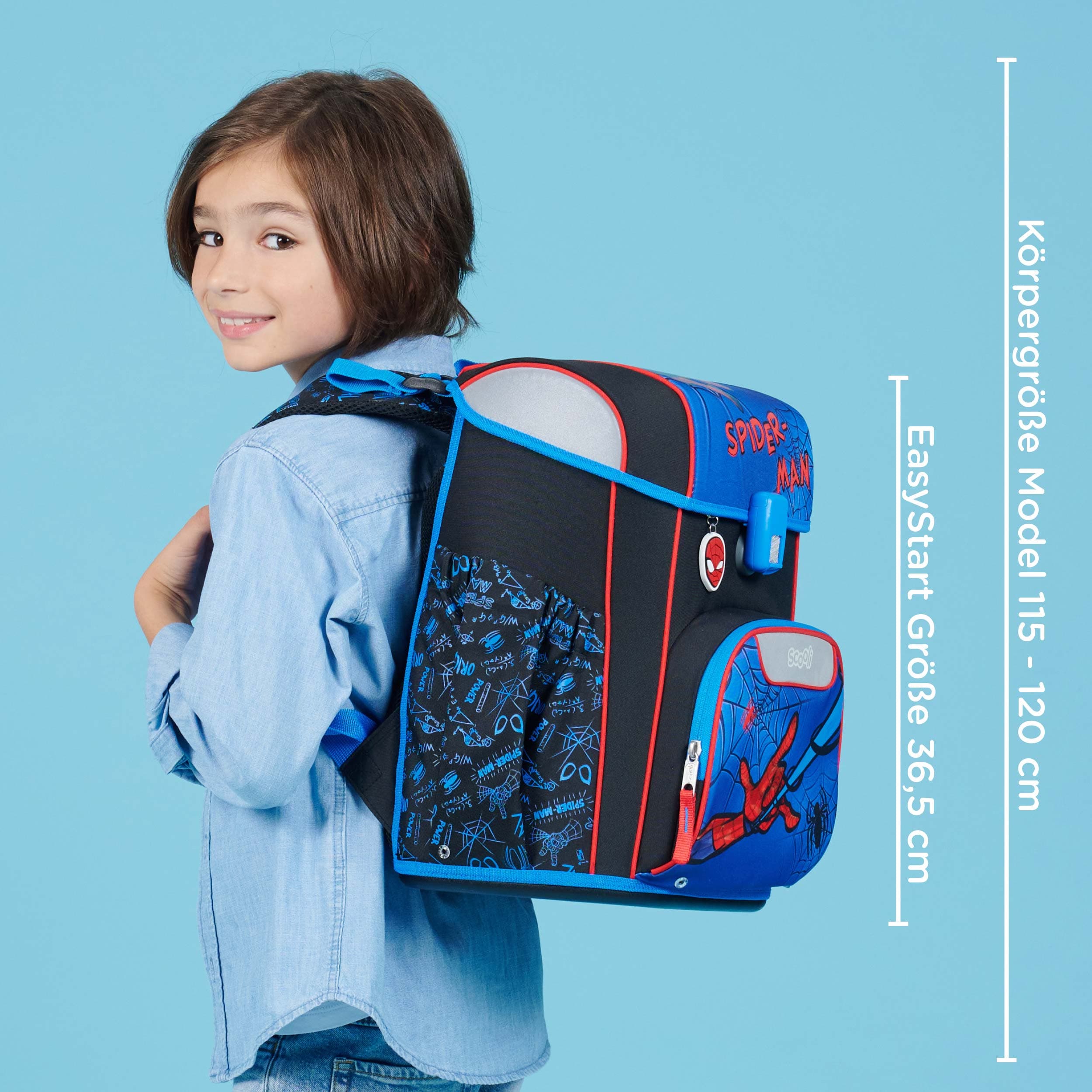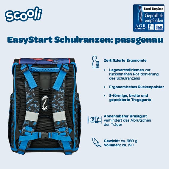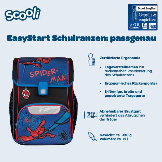 Der Scooli EasyStart Schulranzen im beliebten Spider-Man Design begeistert mit einem furchtlosen Look und durchdachter Ergonomie: Ausgezeichnet mit dem Gütesiegel Aktion Gesunder Rücken e.V. (AGR), lässt sich der Ranzen individuell an die Anatomie des Kindes anpassen. Mit nur ca. 980 g Gewicht ist er besonders leicht und durch sein schlankes Design ideal für Schulanfänger. Ein ergonomisches, atmungsaktives Rückenpolster, ein abnehmbarer Brustgurt und Lageverstellriemen sorgen für einen komfortablen, rückenschonenden Sitz.